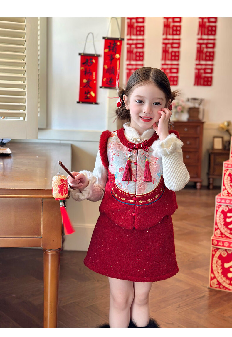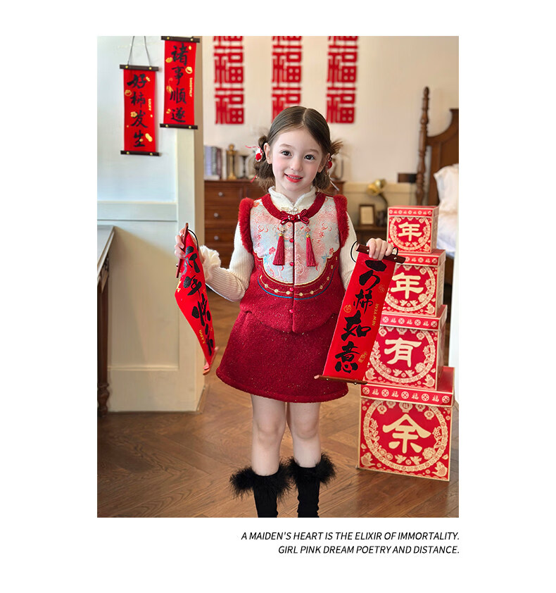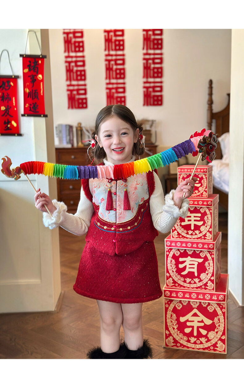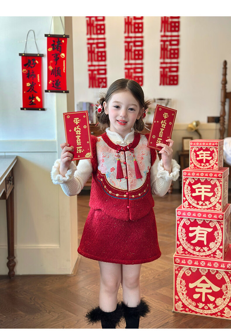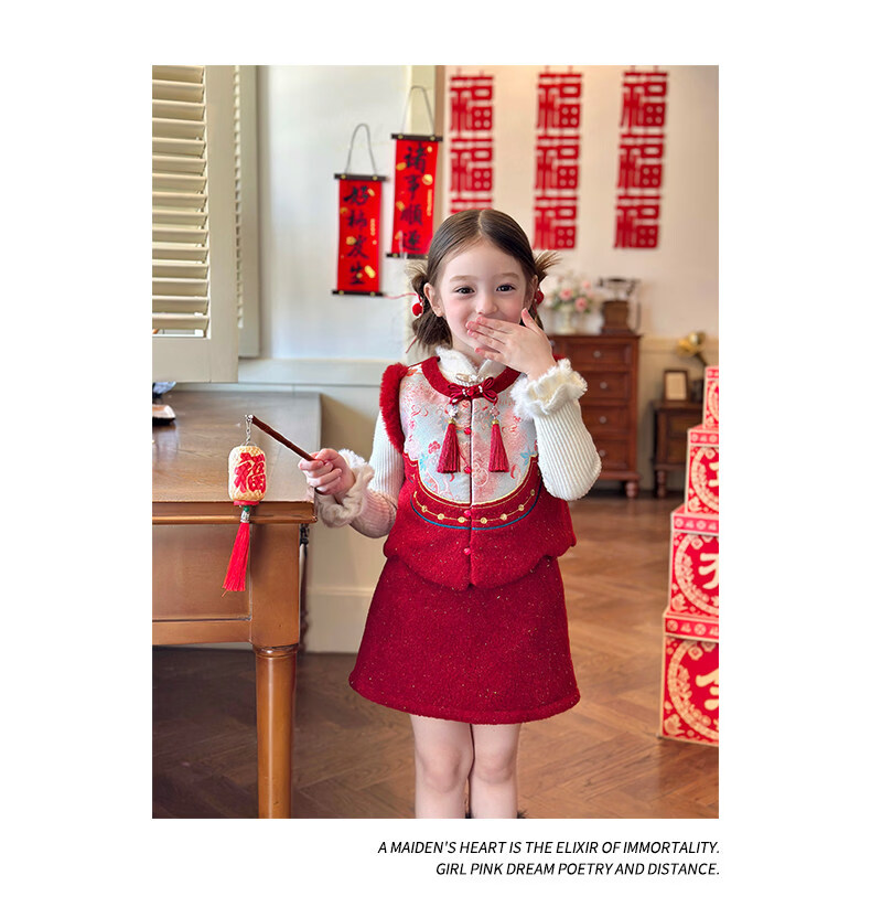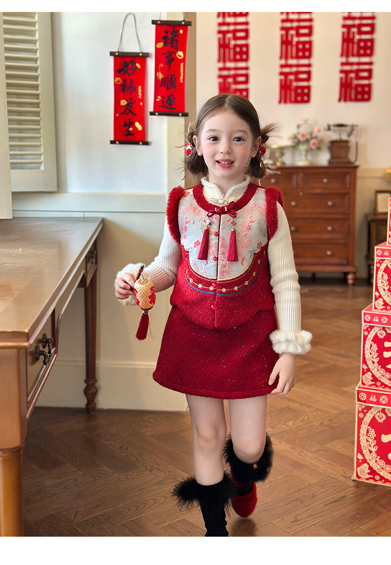 栀了成长记童装女童红色国风套装2025冬季儿童新年夹棉马甲两件套 红色 套装 100 cm