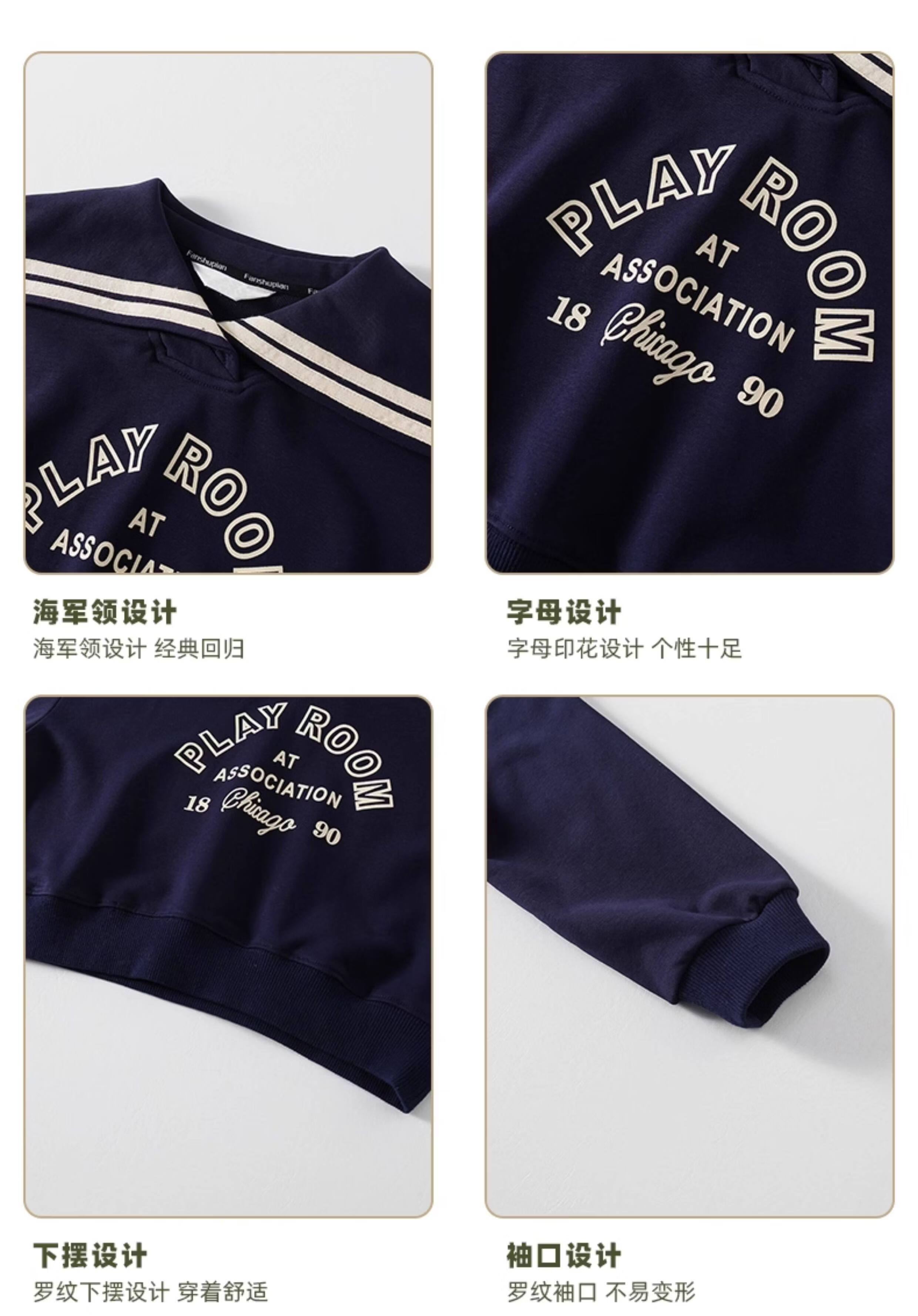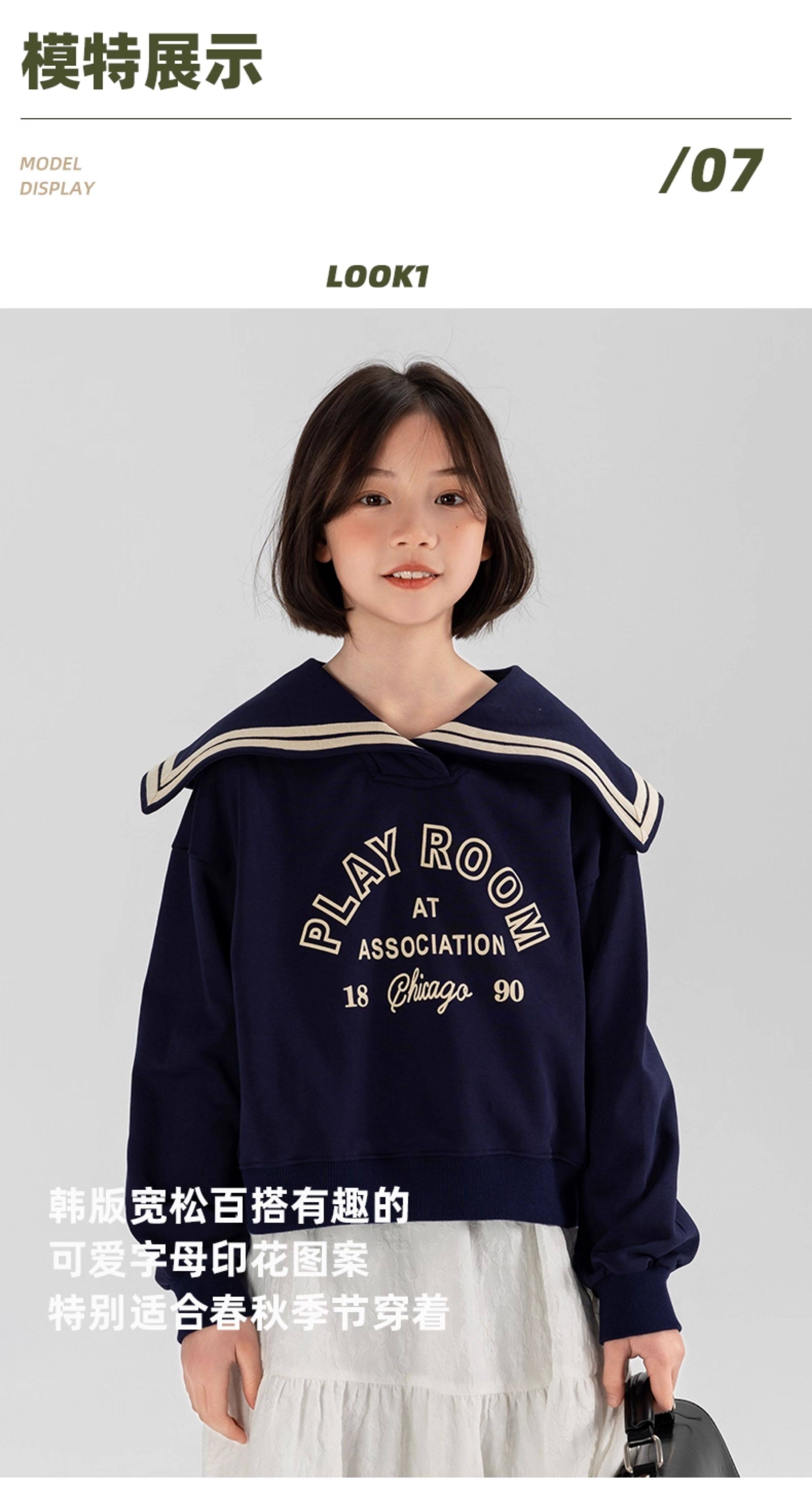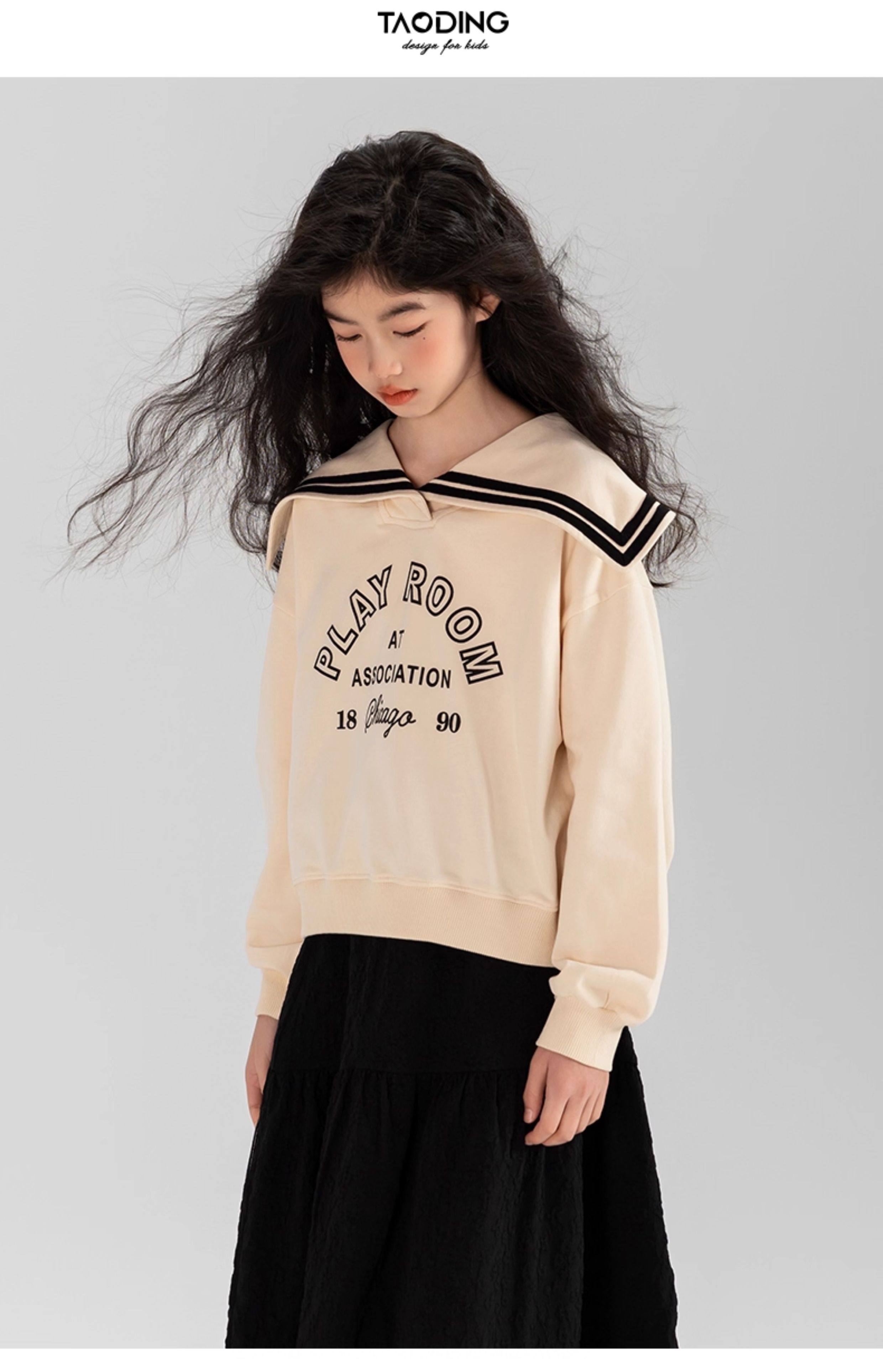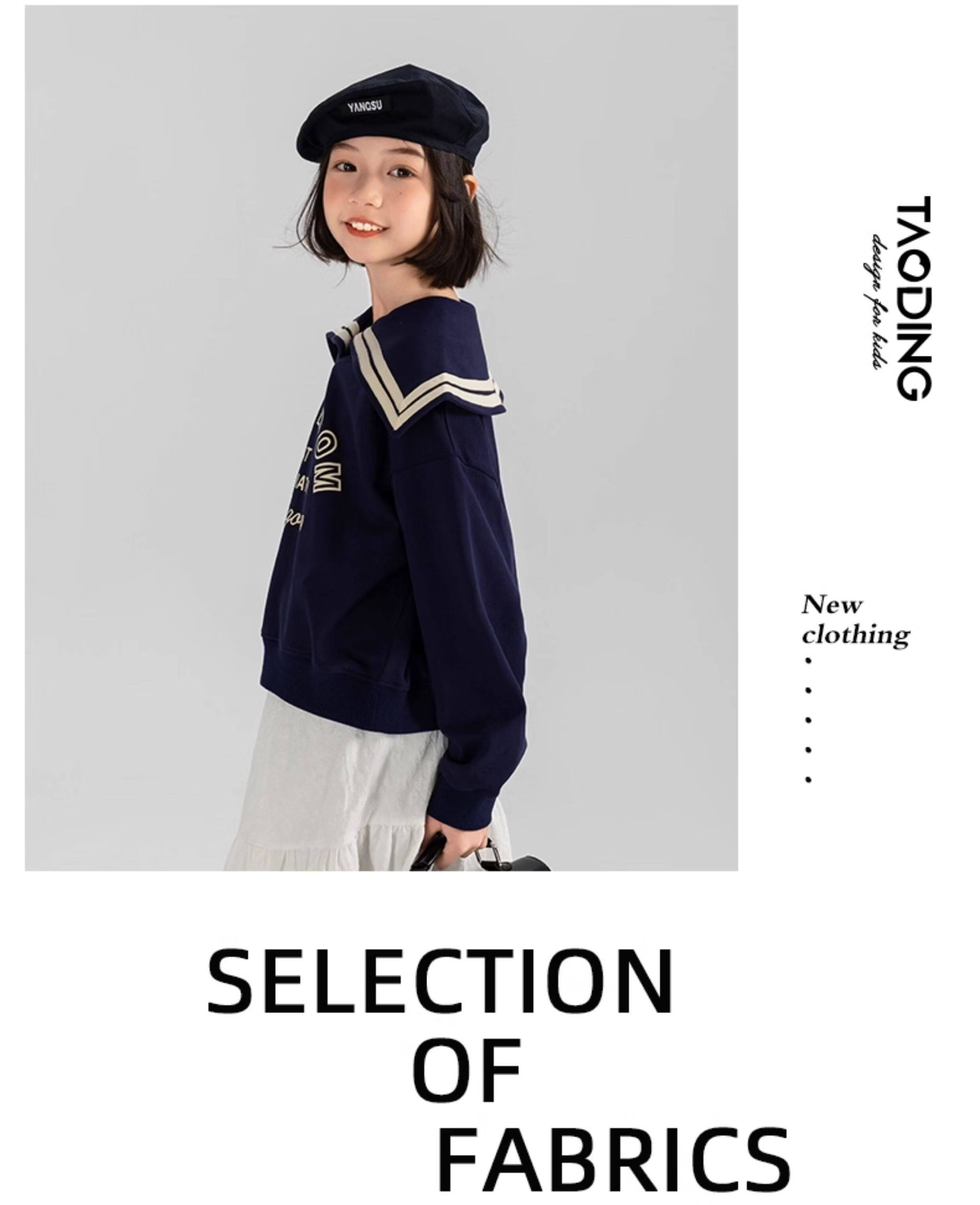 淘町女童卫衣春秋装新款中大童法式海军领学院风字母印花ins上衣 藏青色 130