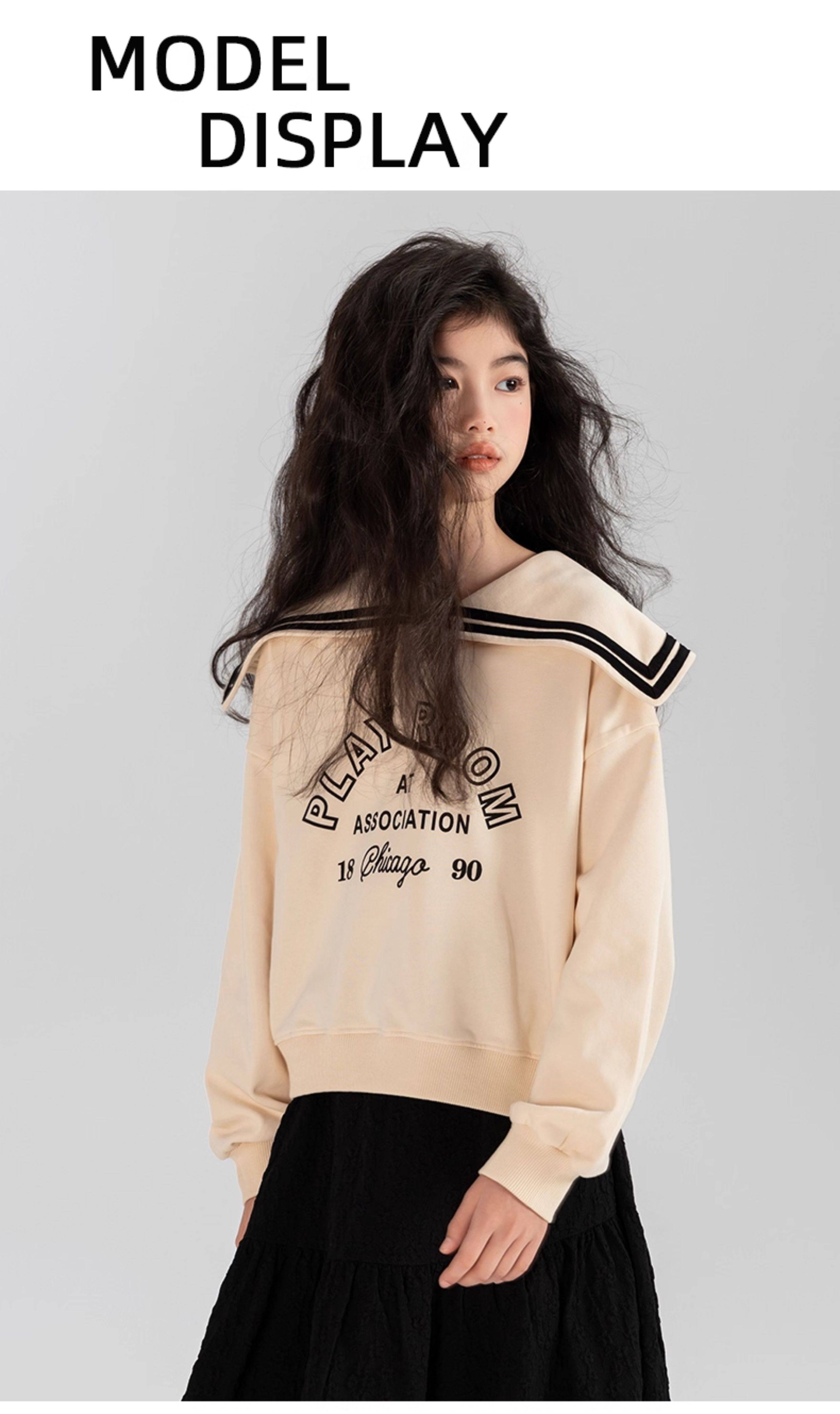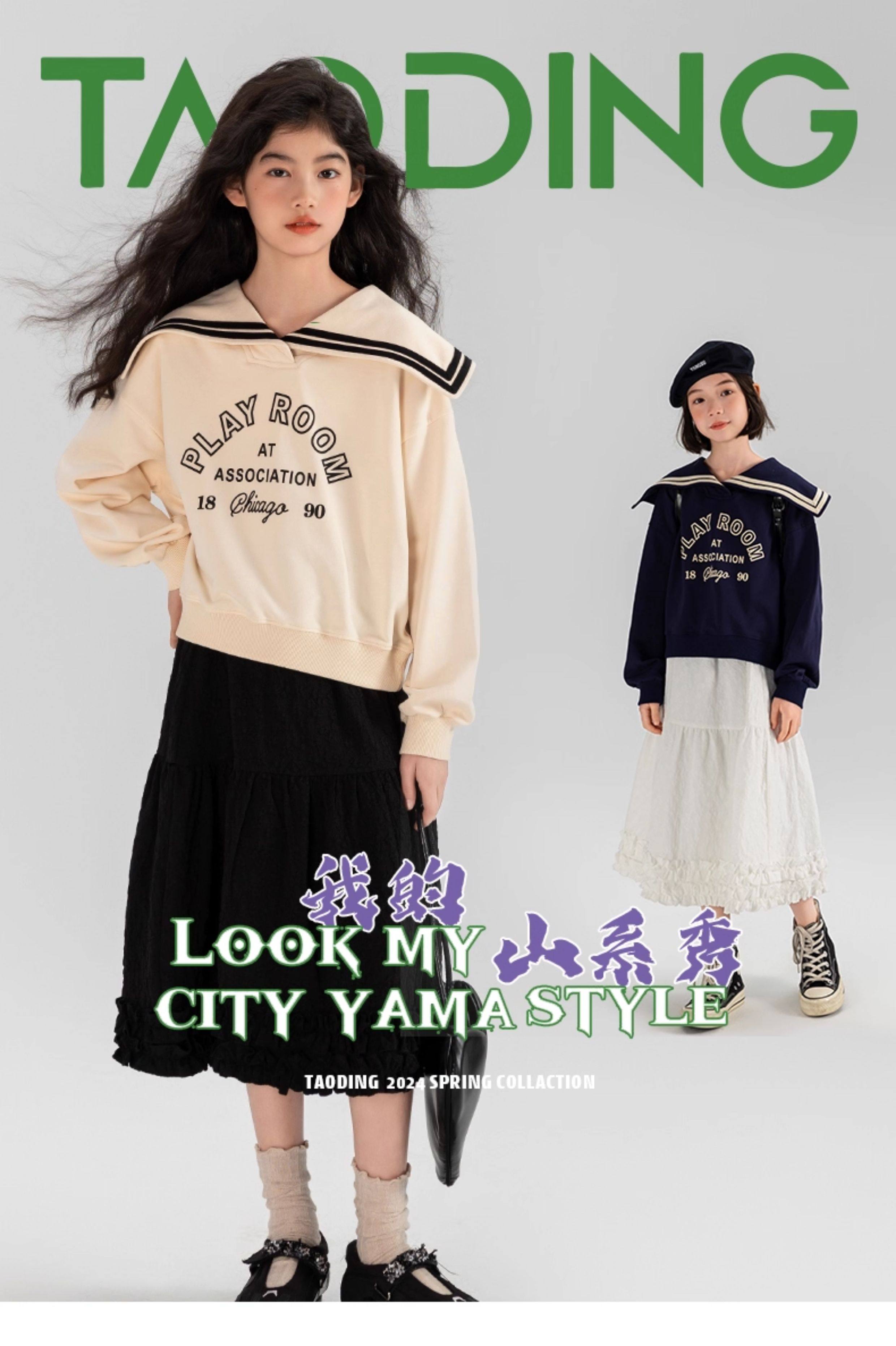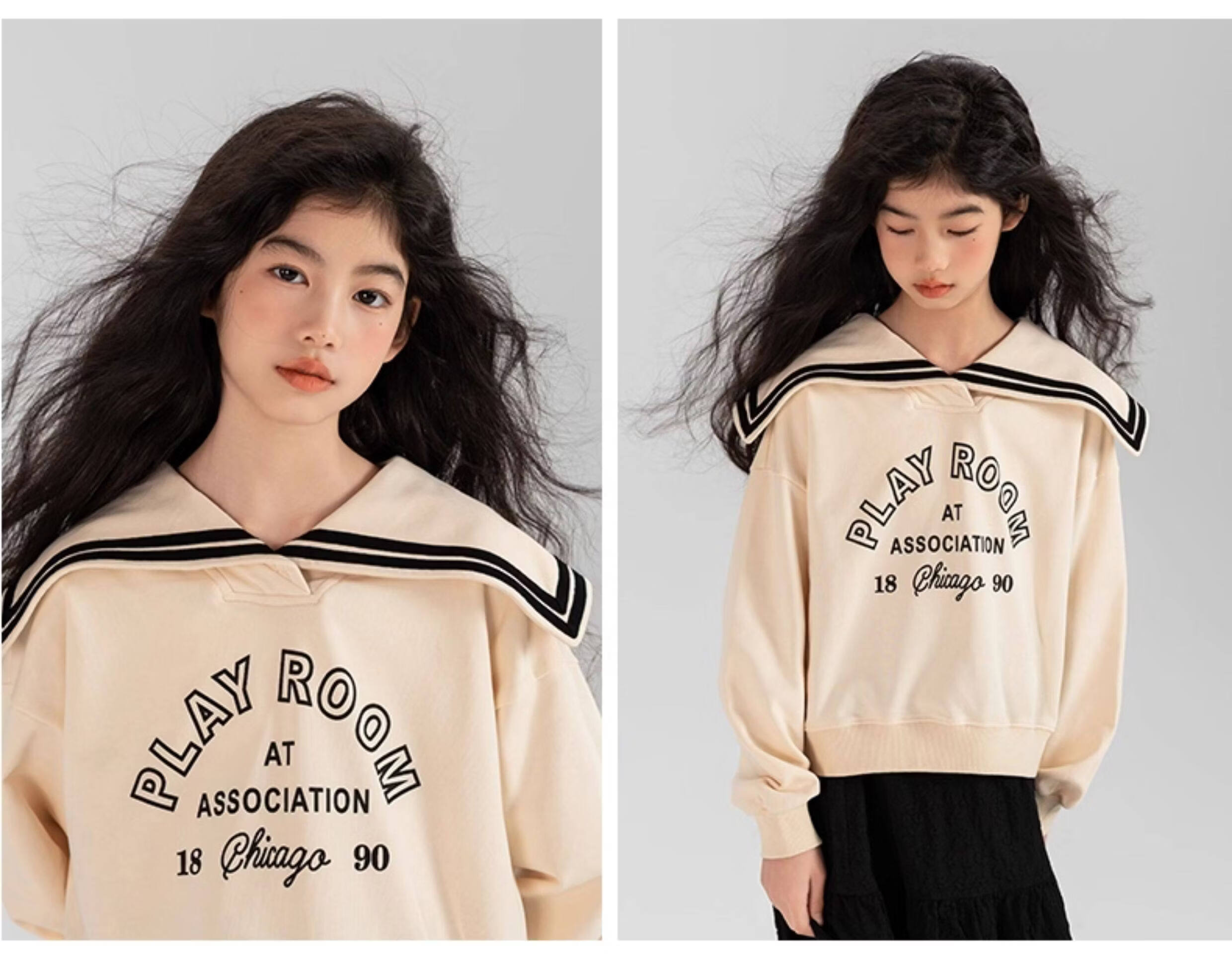 淘町女童卫衣春秋装新款中大童法式海军领学院风字母印花ins上衣 藏青色 130