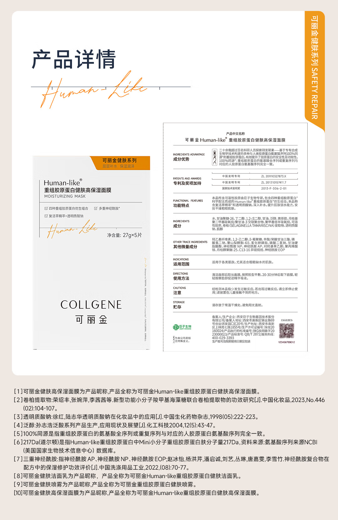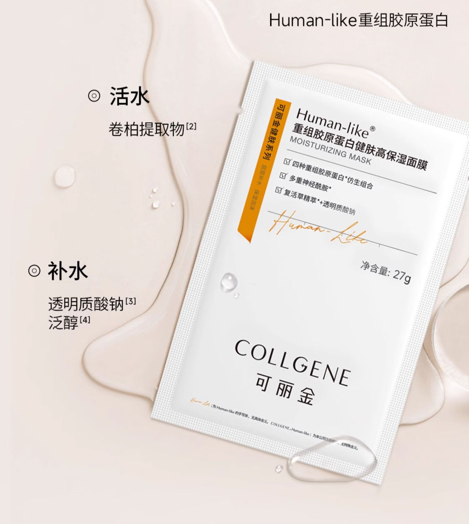 可丽金(COLLGENE)Human-like重组胶原蛋白健肤高保湿面膜 27g*1片体验装