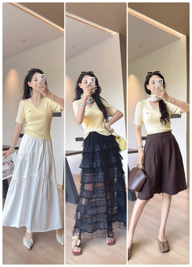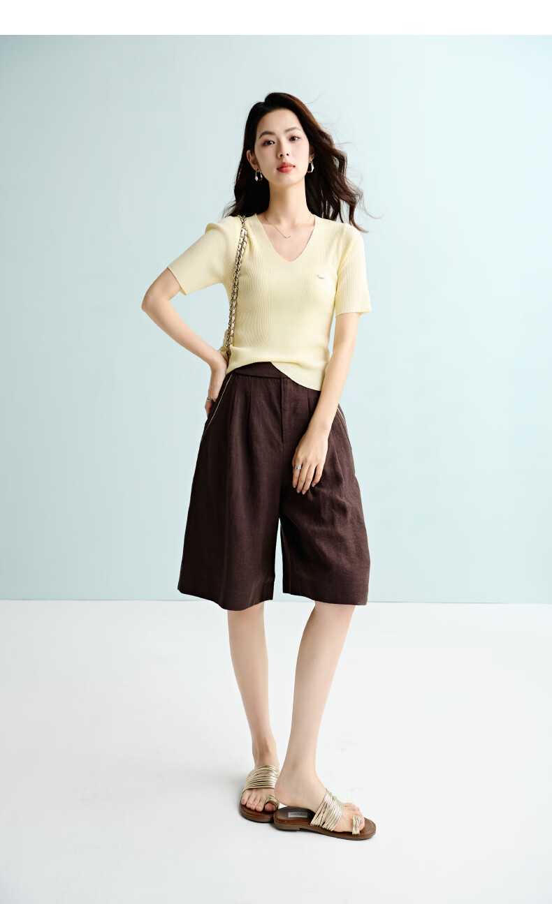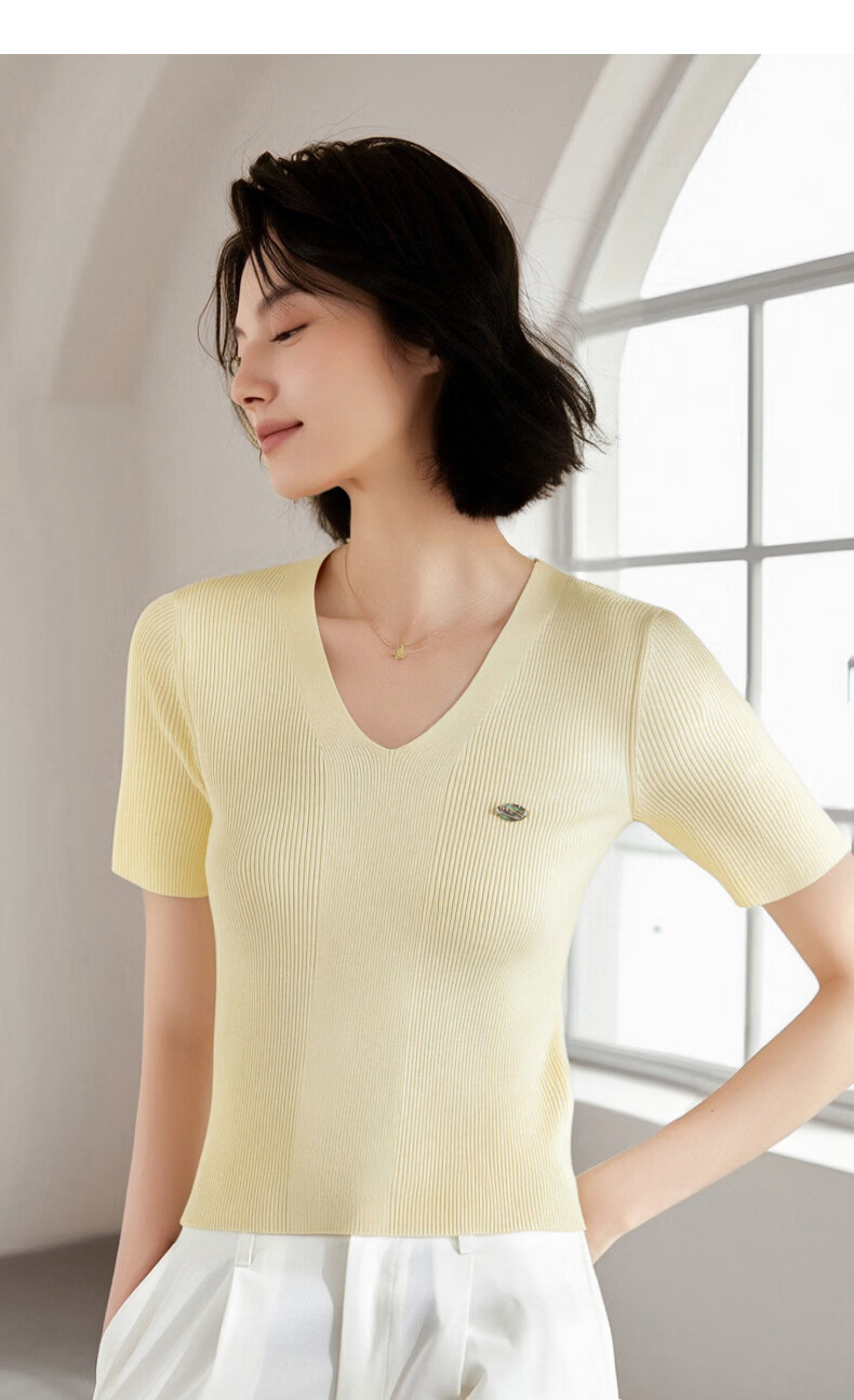 晚白【新品】2026年春款V领纯色短袖高弹修身舒适透气针织衫女 米黄色 L