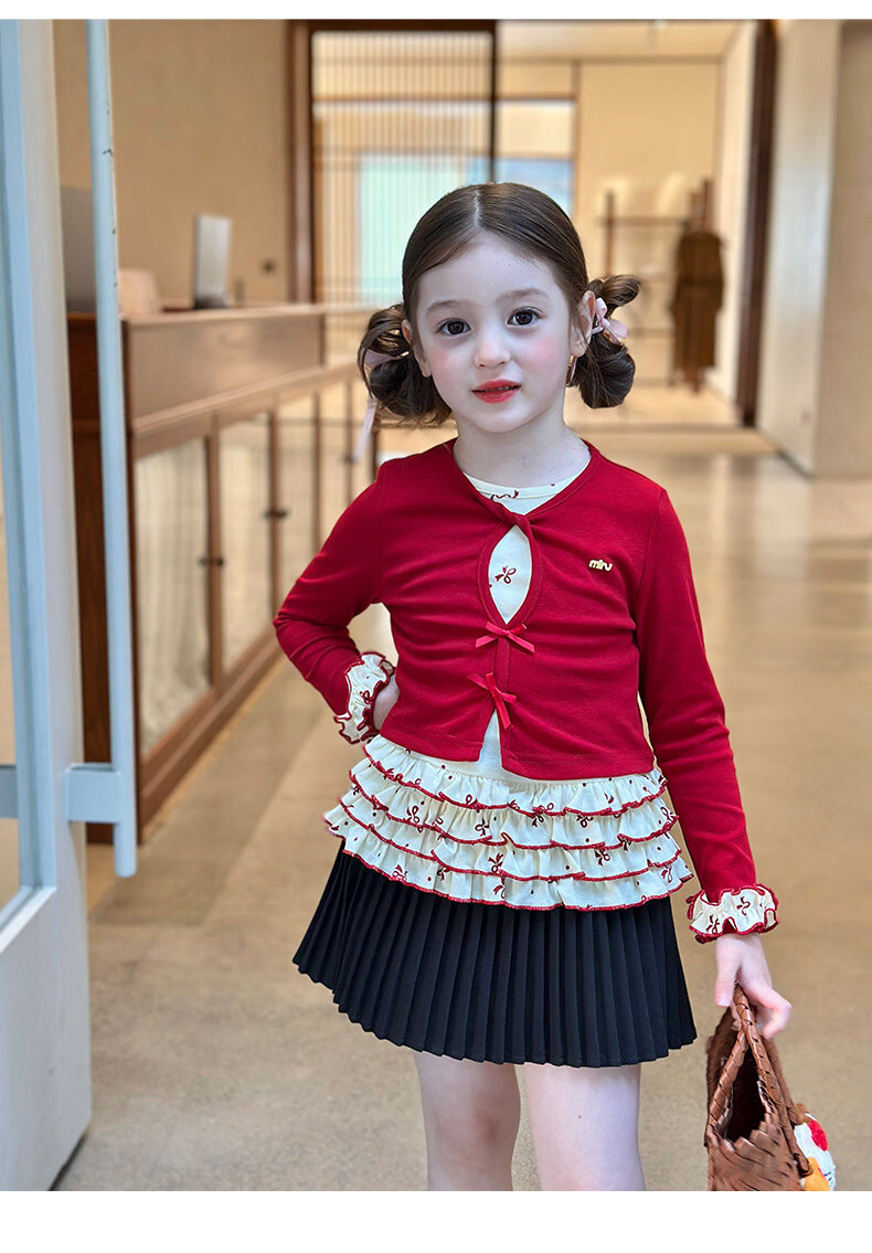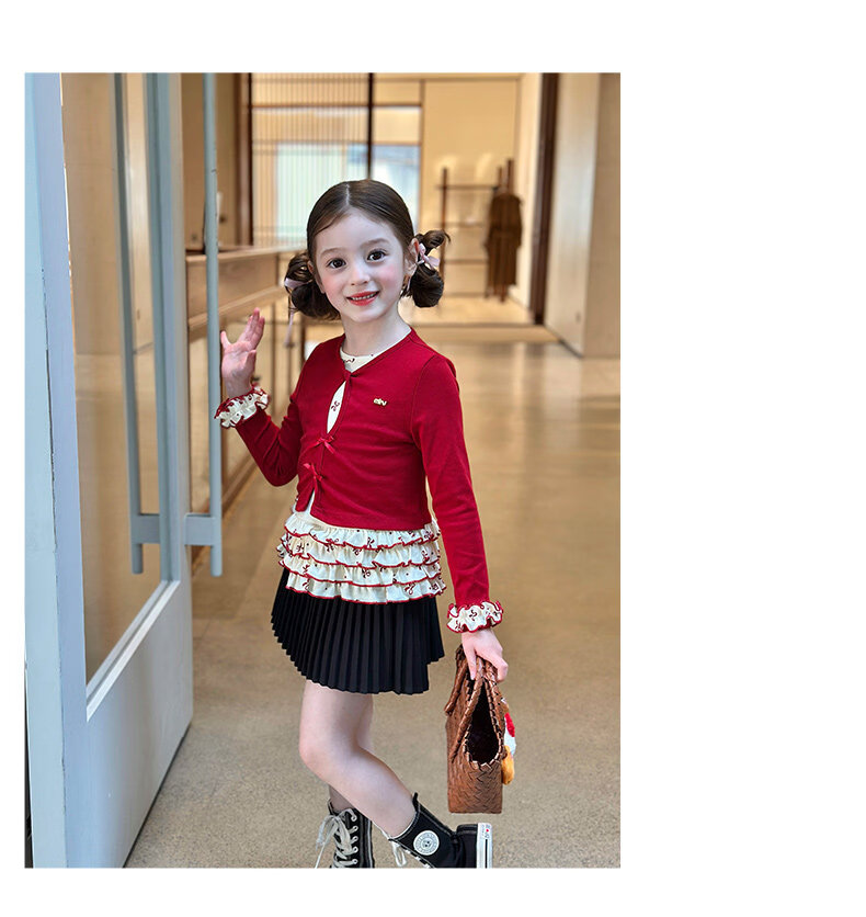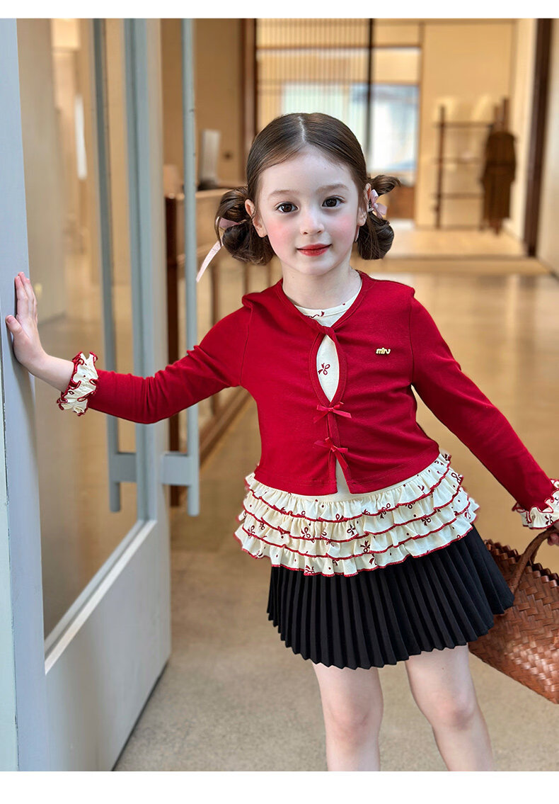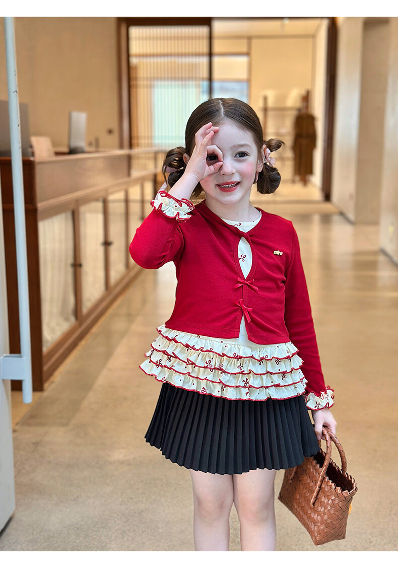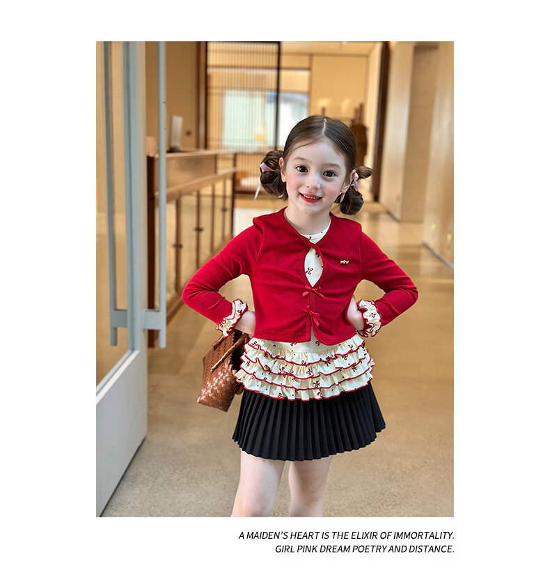 栀了成长记童装女童韩版红色上衣2026春季儿童甜美假两件花边T恤 黑色 裤子 160 cm