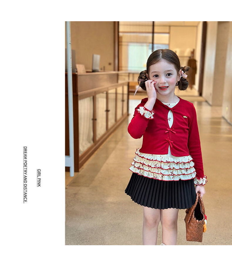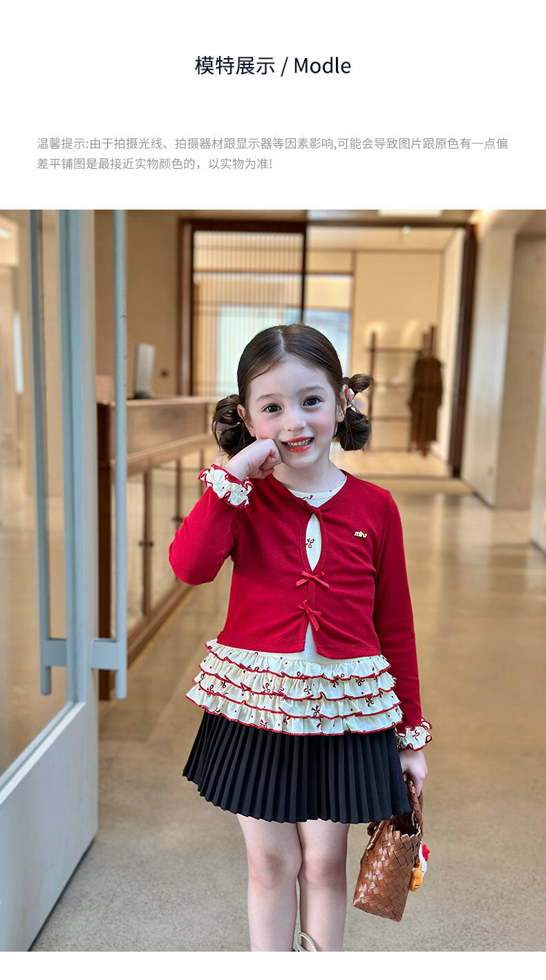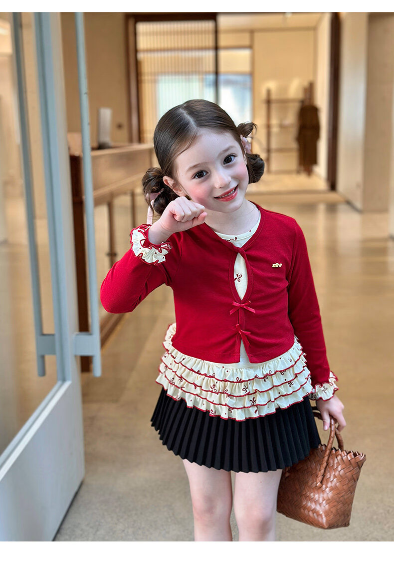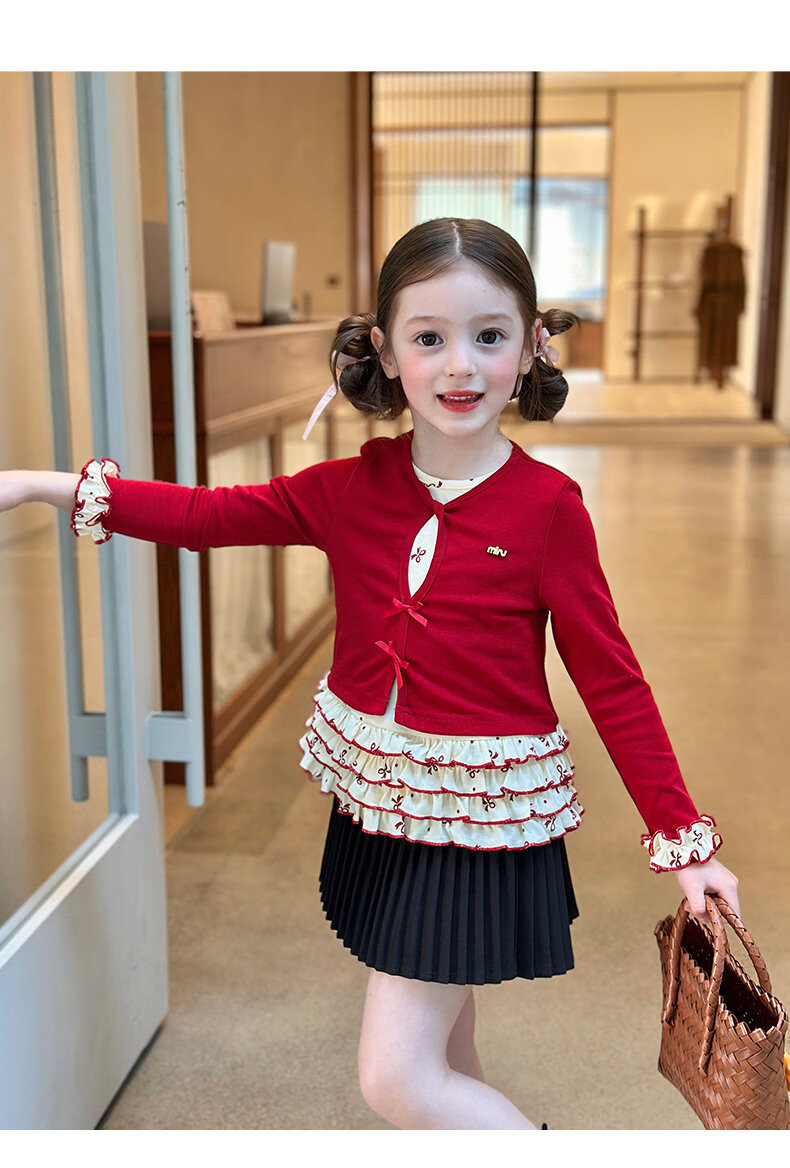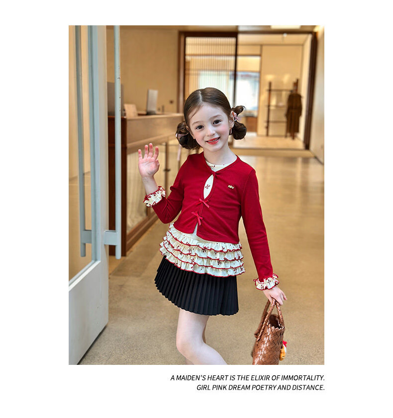 栀了成长记童装女童韩版红色上衣2026春季儿童甜美假两件花边T恤 黑色 裤子 160 cm