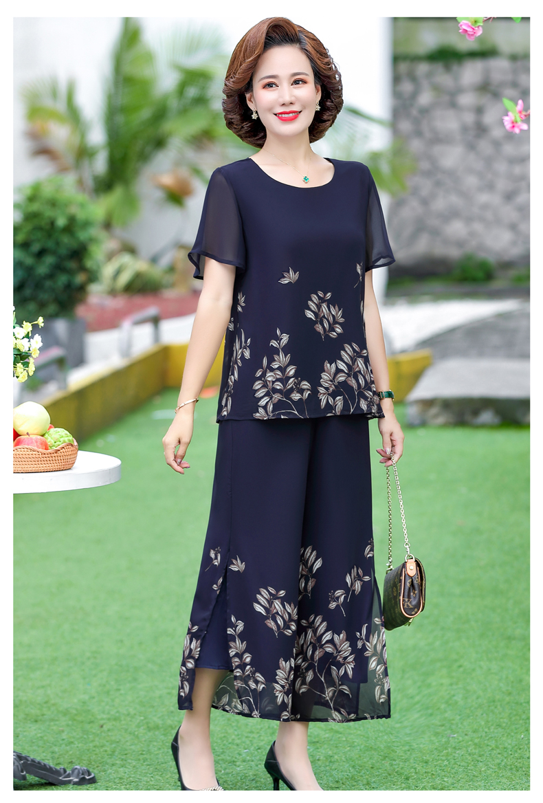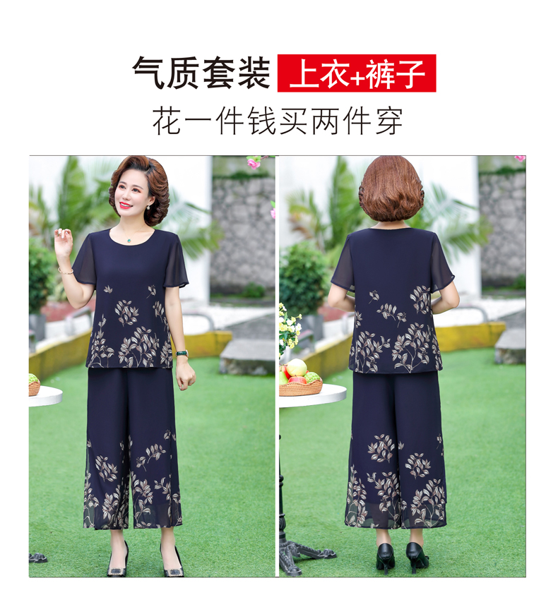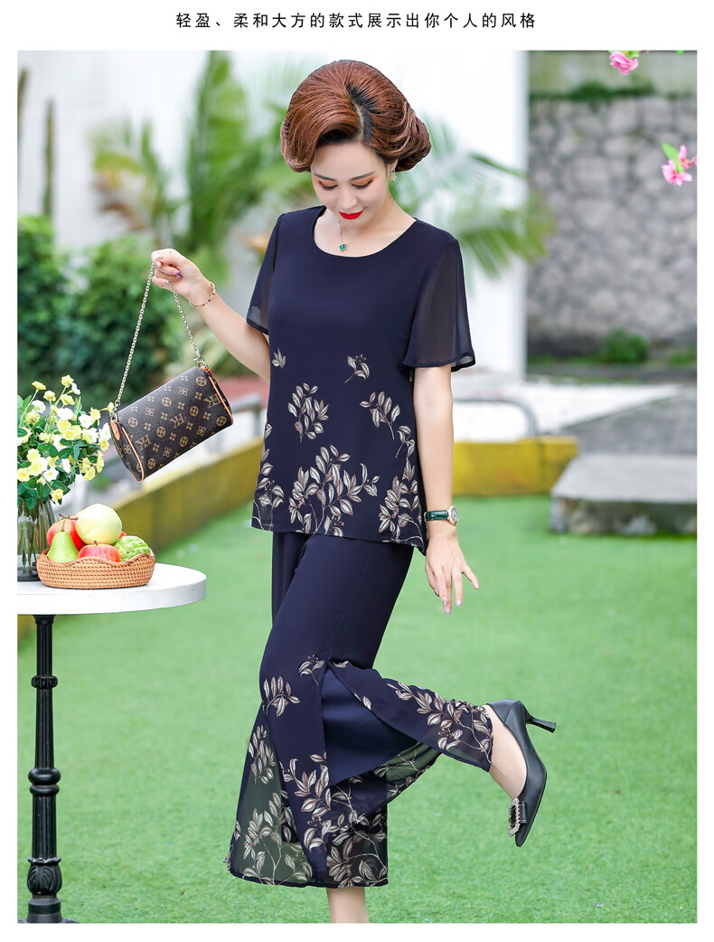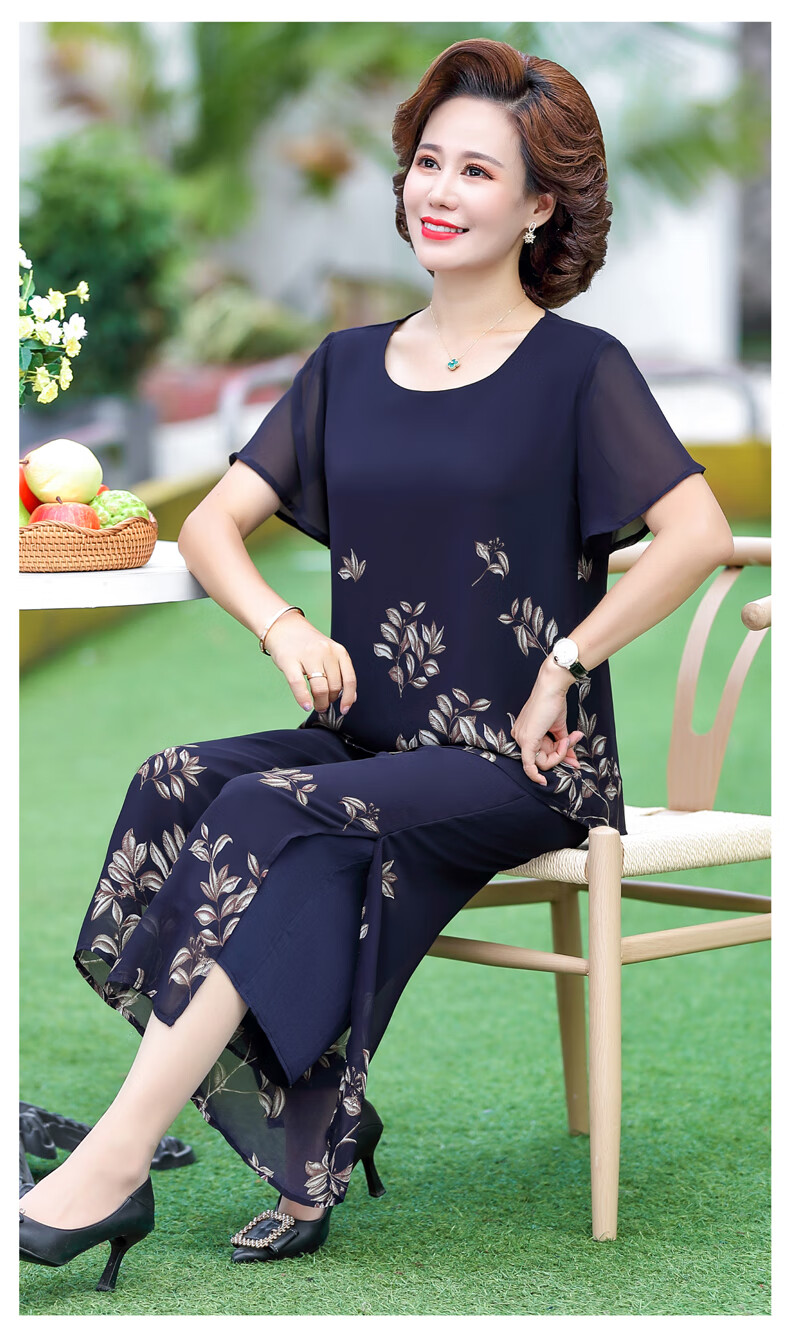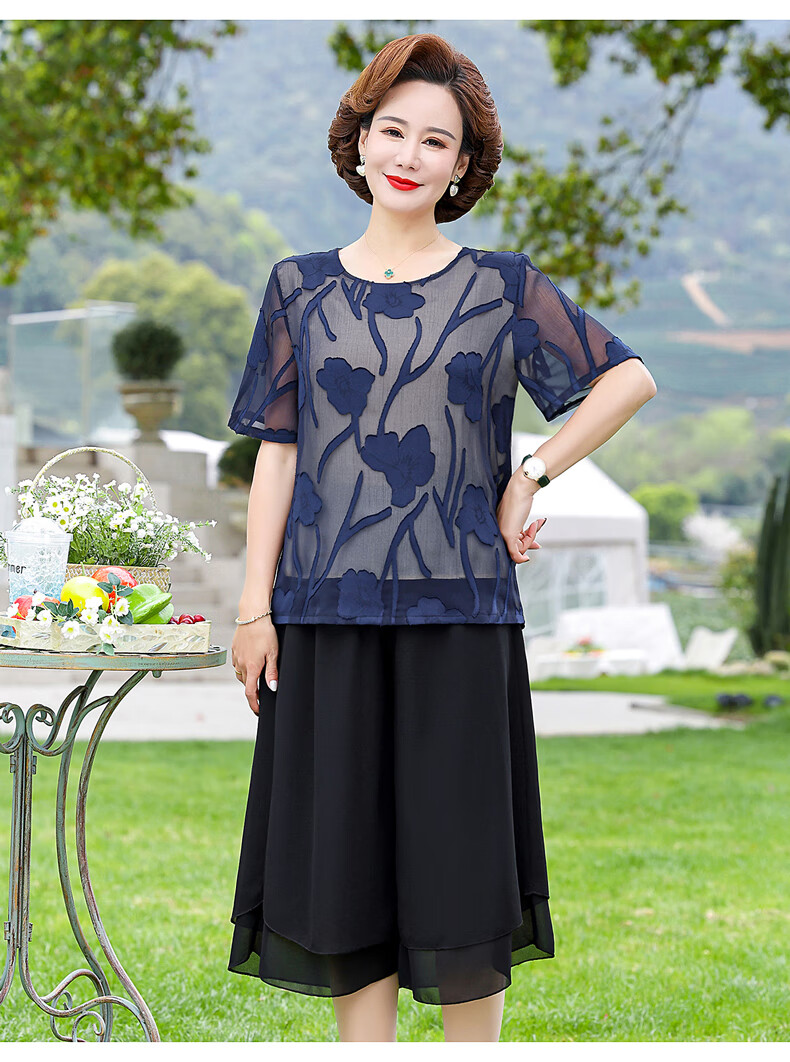孜颜妈妈装50-60岁洋气夏装套装中老年女装短袖两件套母亲夏天衣服女 藏蓝【套装】 XL 【建议80-100斤】