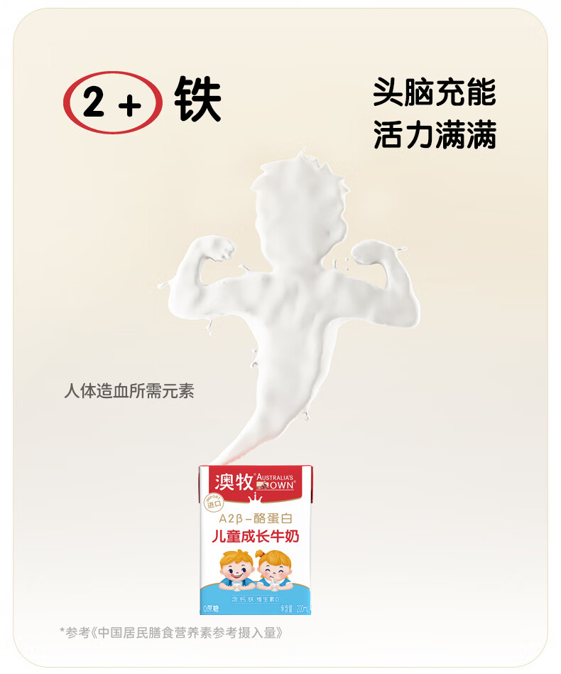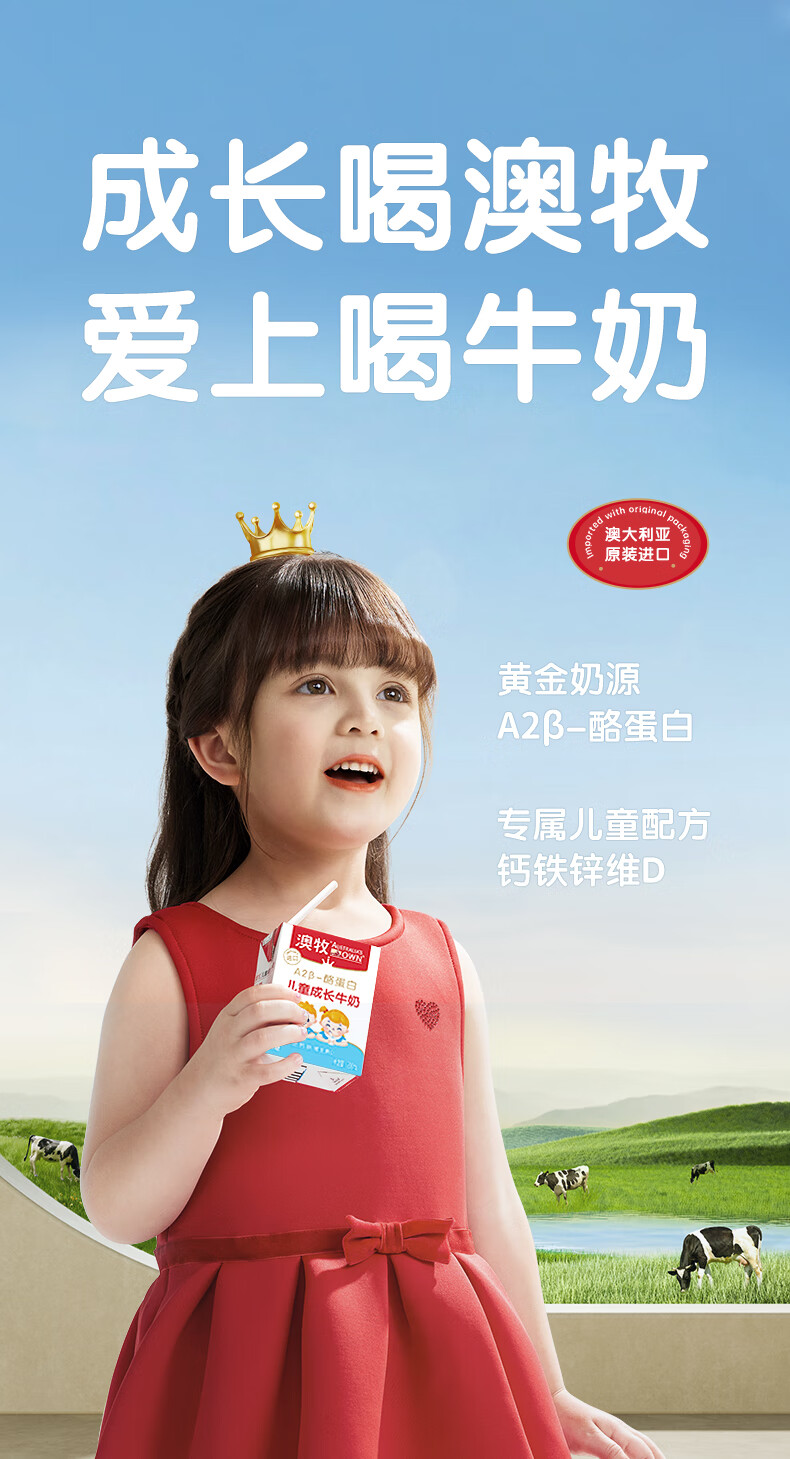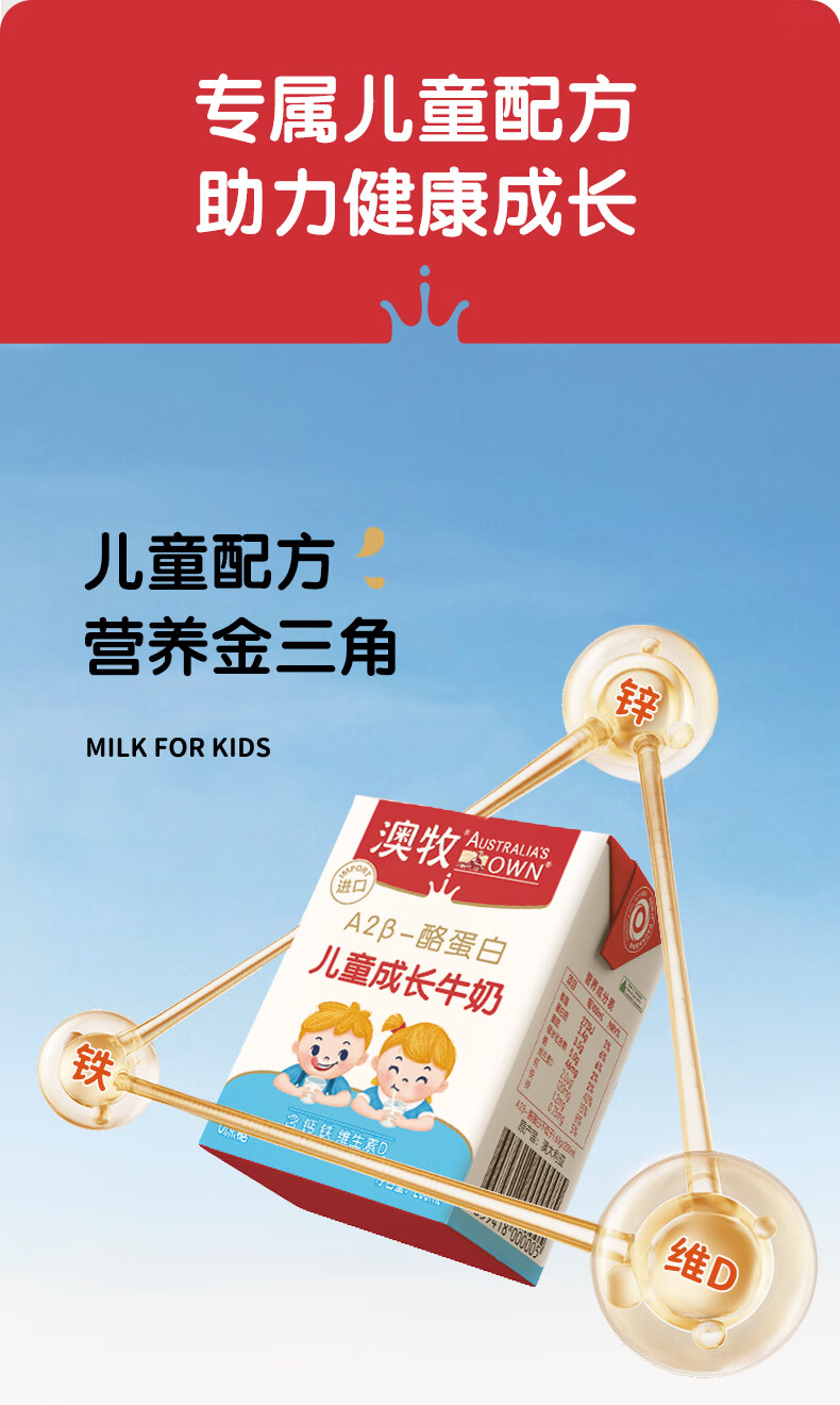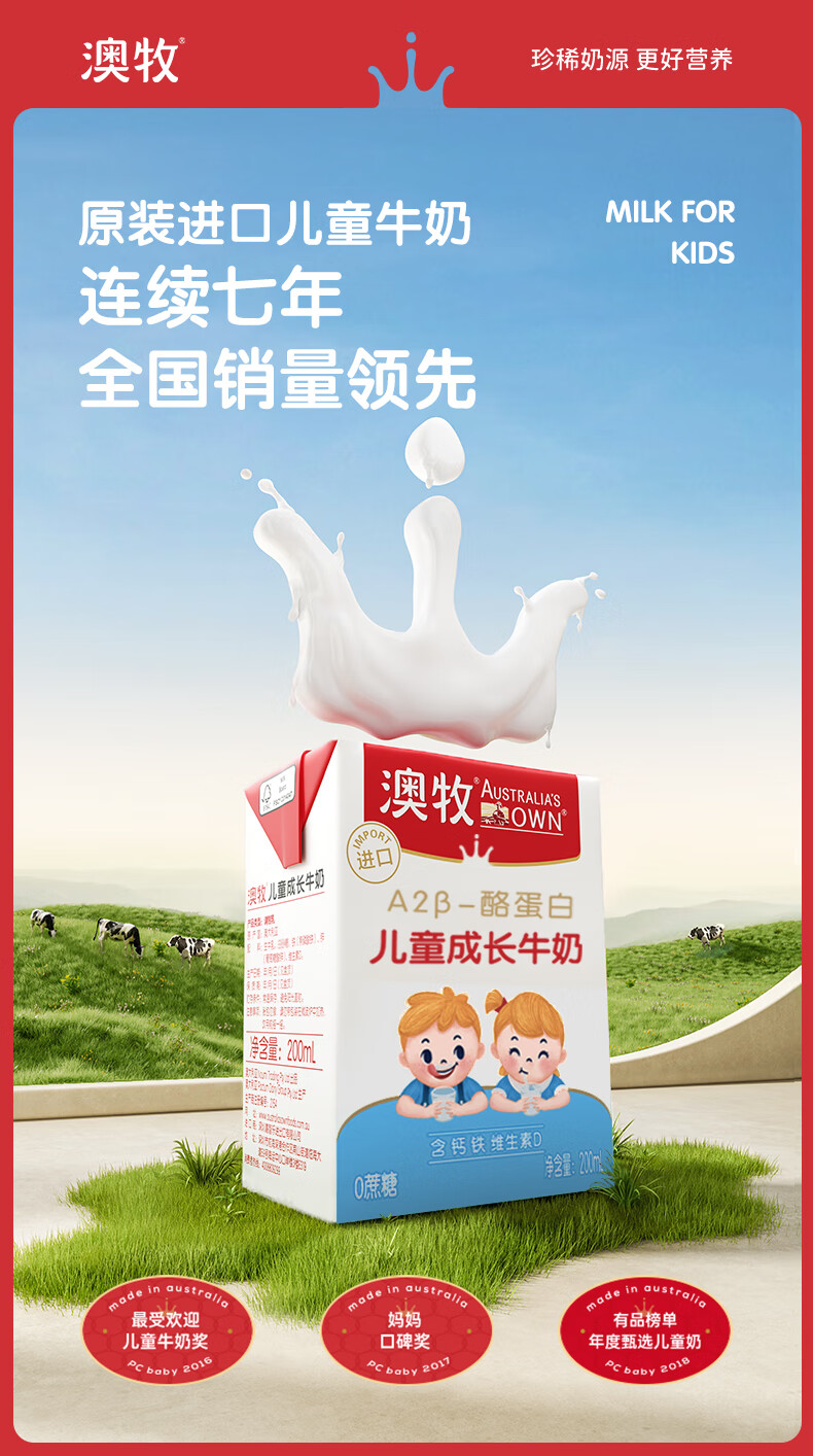 澳牧(Australia's Own)儿童成长牛奶0蔗糖A2β酪蛋白原装进口全脂奶200ml*24盒过年囤货