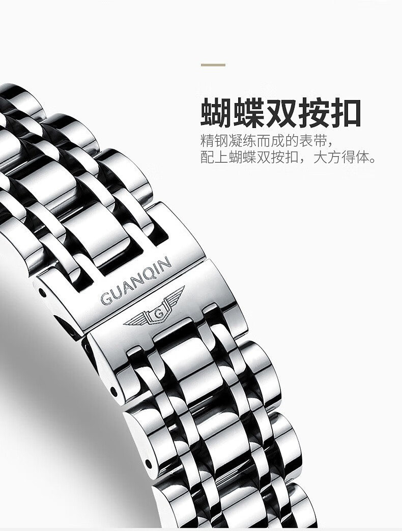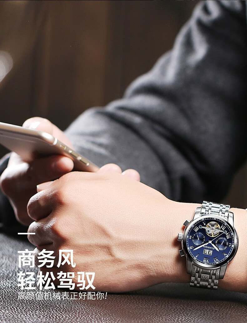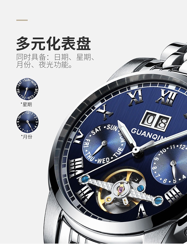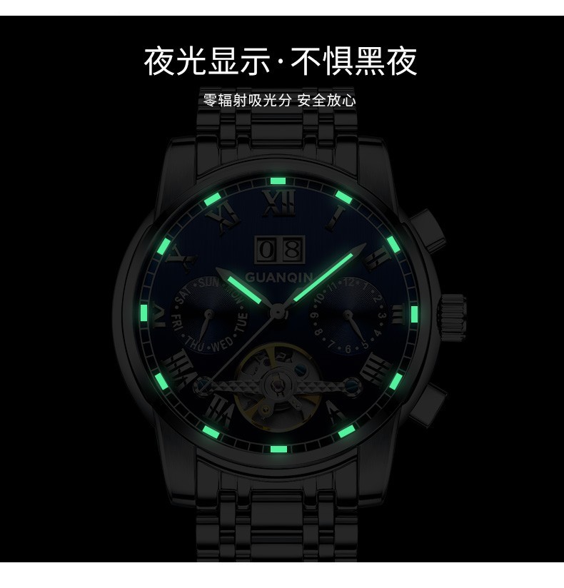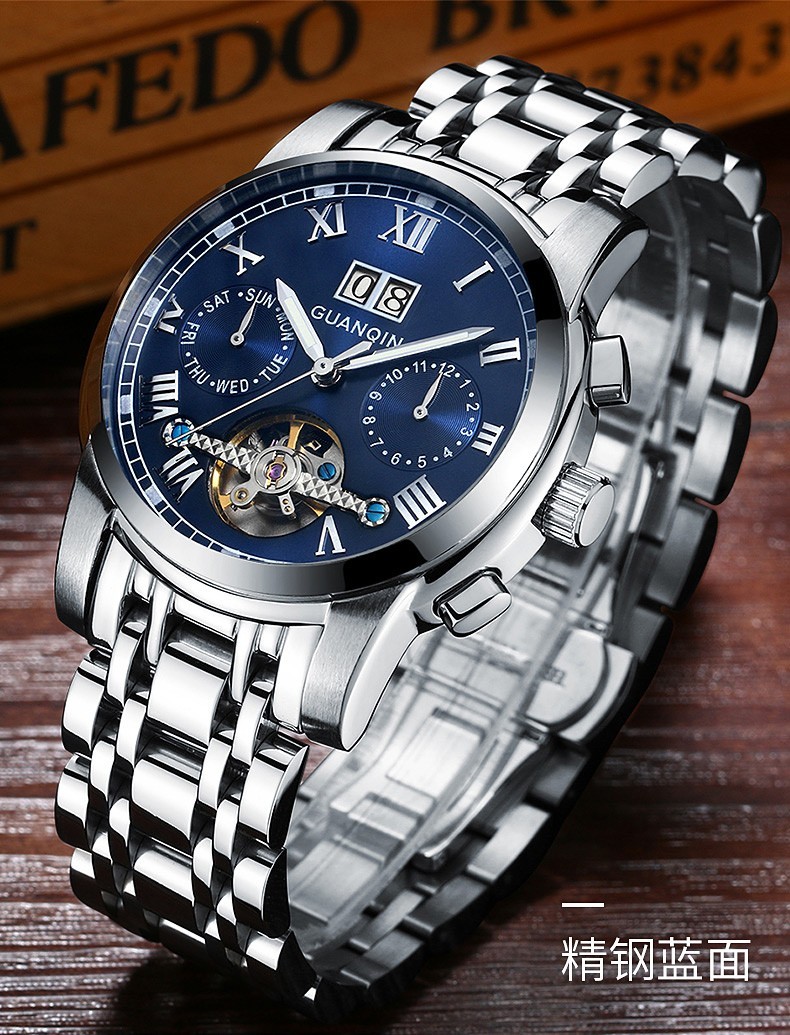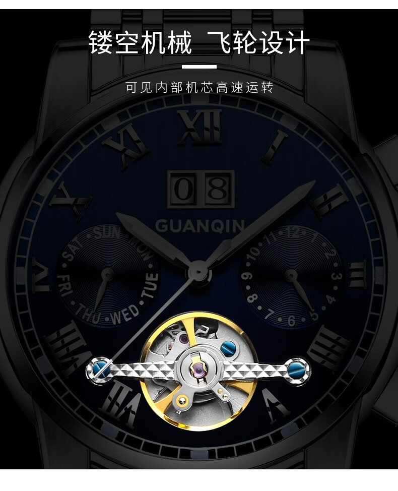 冠琴(GUANQIN)高端手表男全自动机械镂空飞轮精钢简约运动瑞士风格防水时尚腕表 【免费刻字+终身质保】钢带蓝面