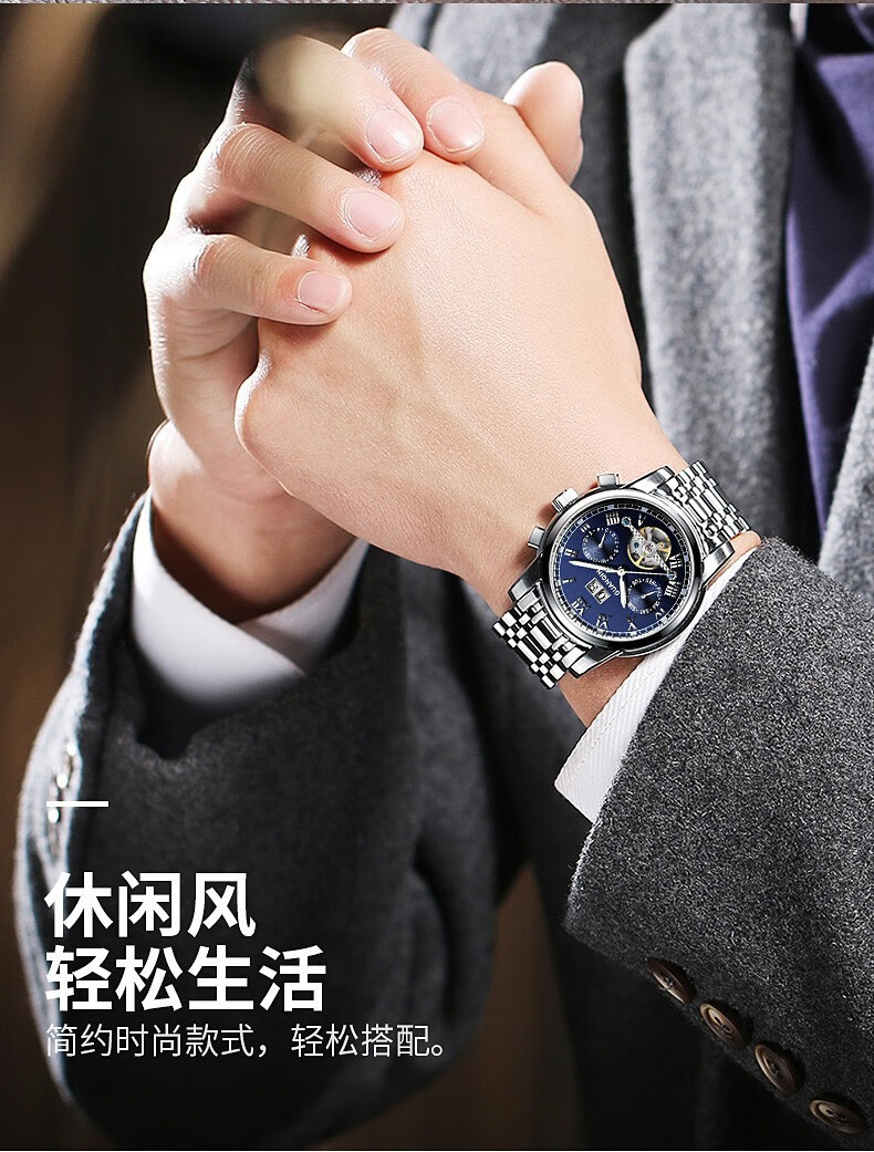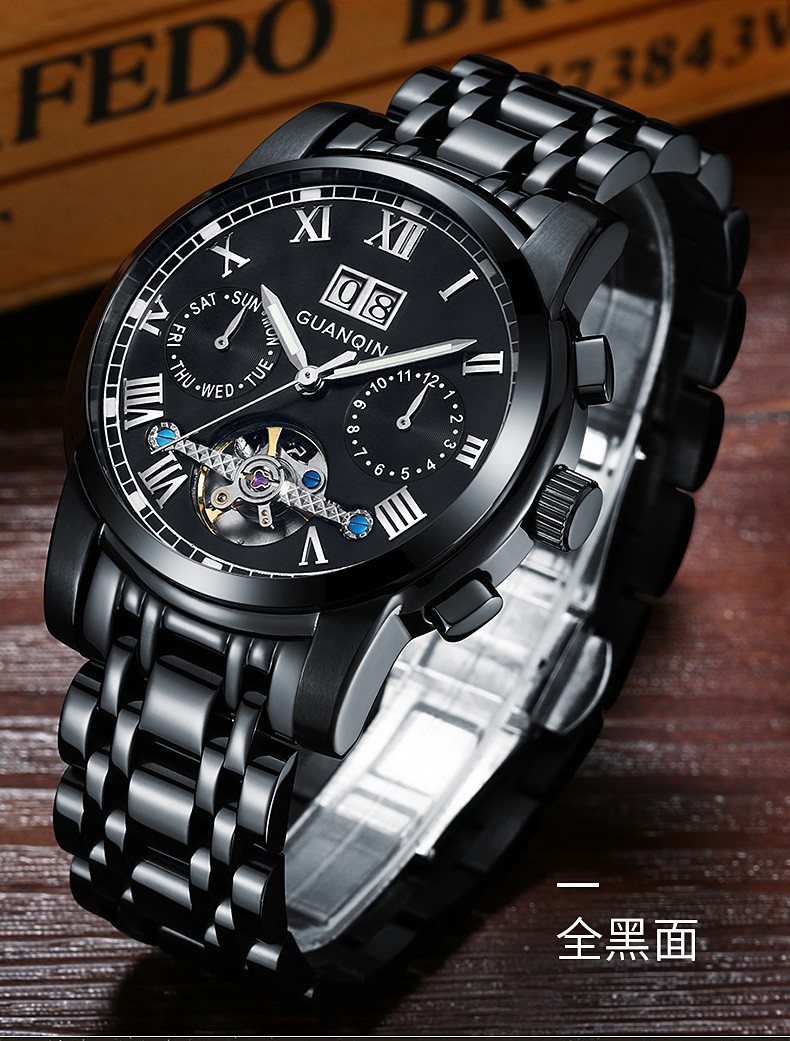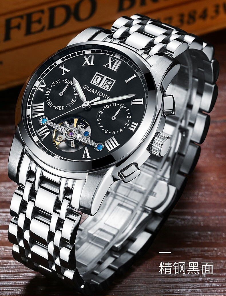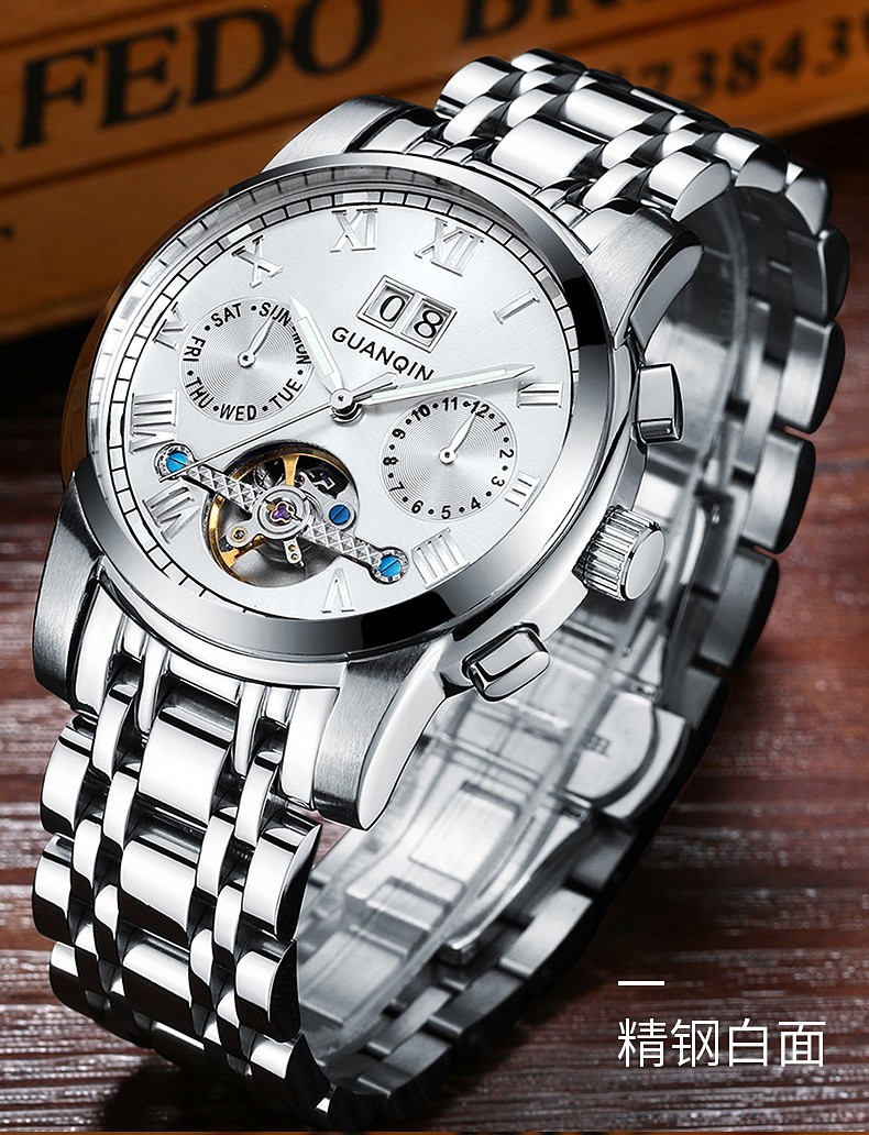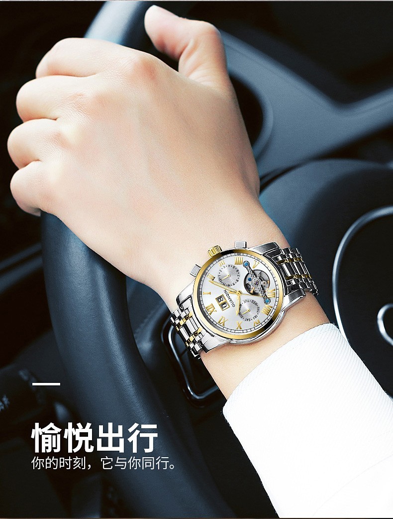 冠琴(GUANQIN)高端手表男全自动机械镂空飞轮精钢简约运动瑞士风格防水时尚腕表 【免费刻字+终身质保】钢带蓝面