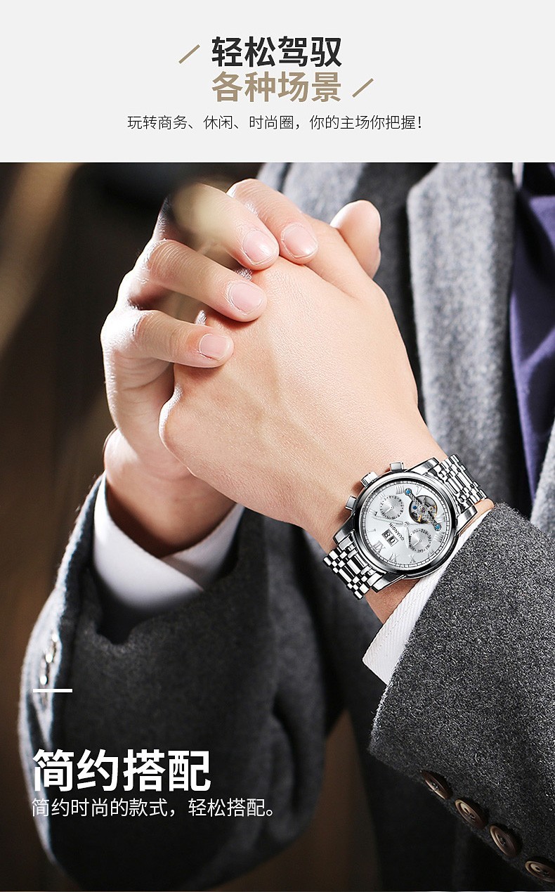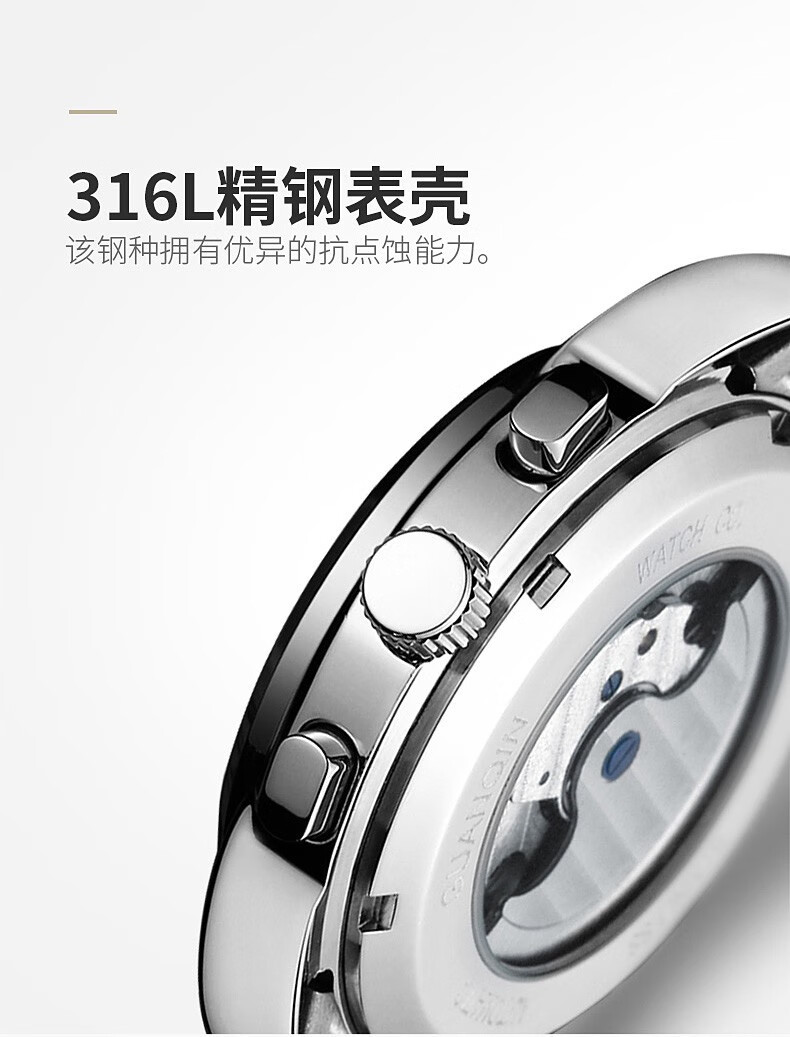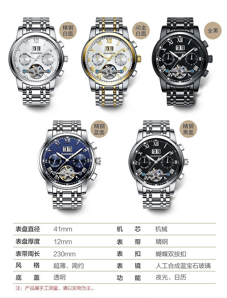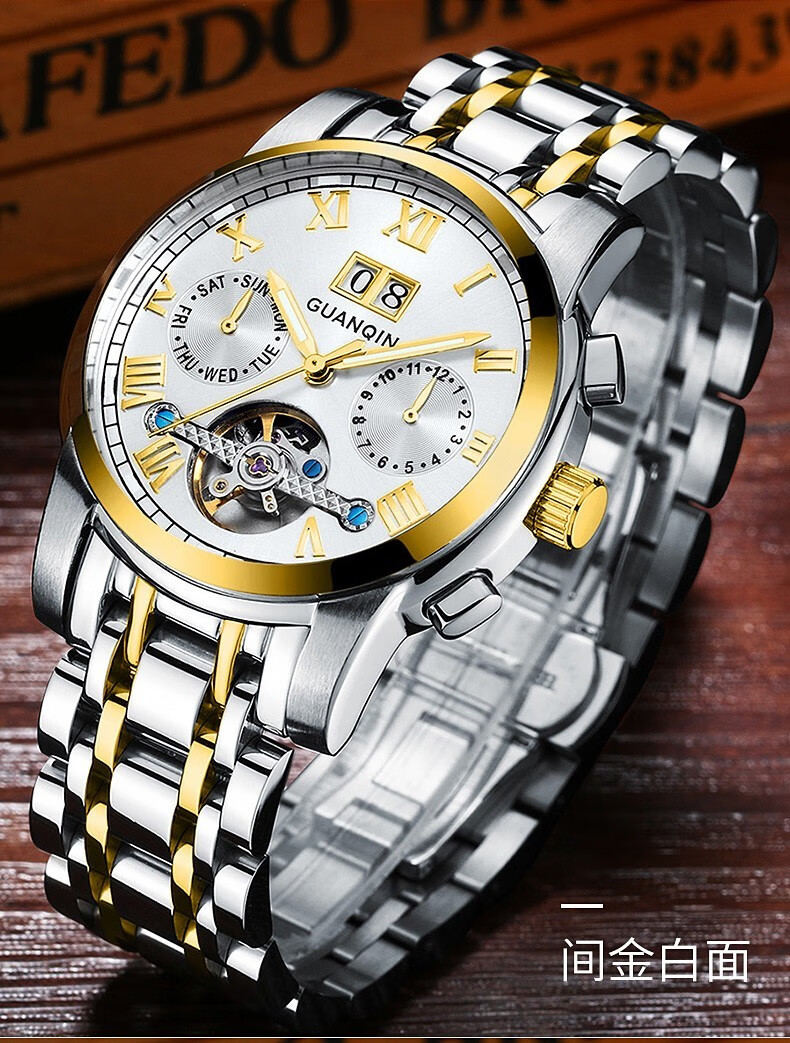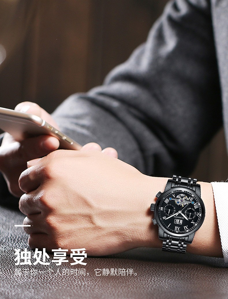 冠琴(GUANQIN)高端手表男全自动机械镂空飞轮精钢简约运动瑞士风格防水时尚腕表 【免费刻字+终身质保】钢带蓝面