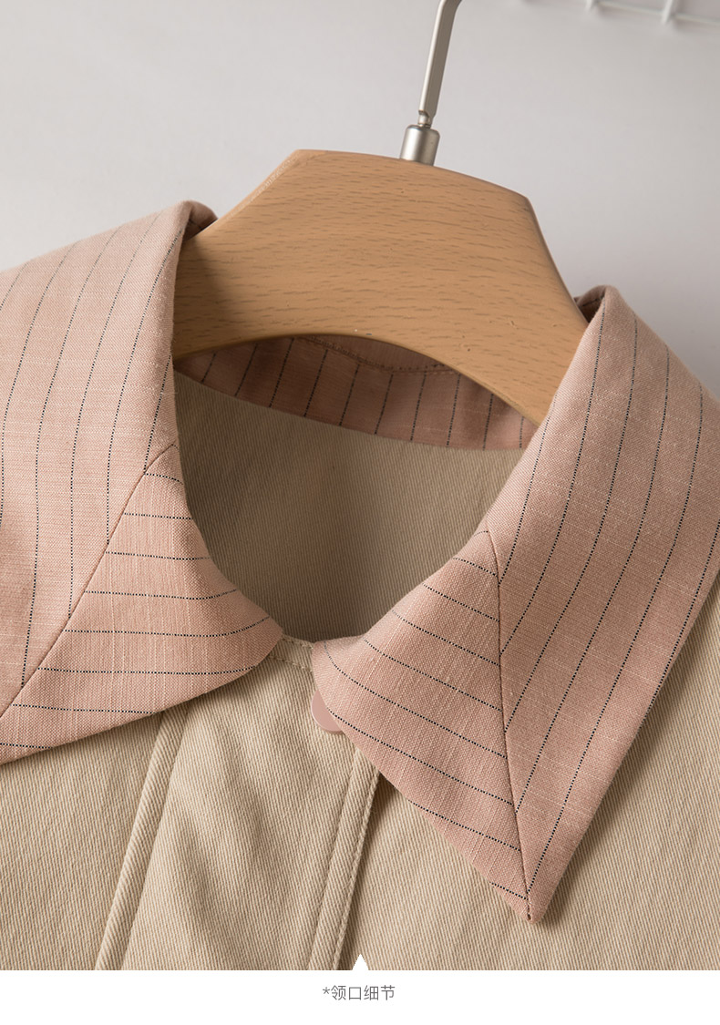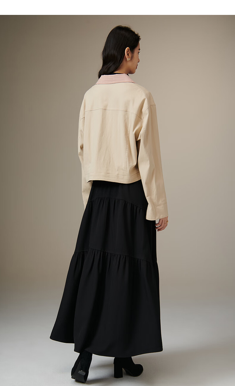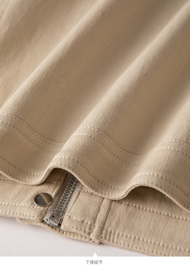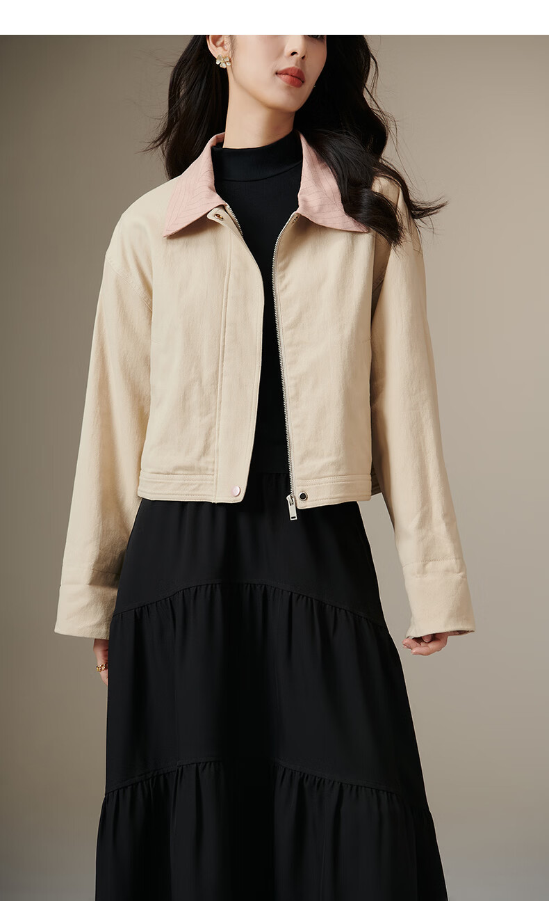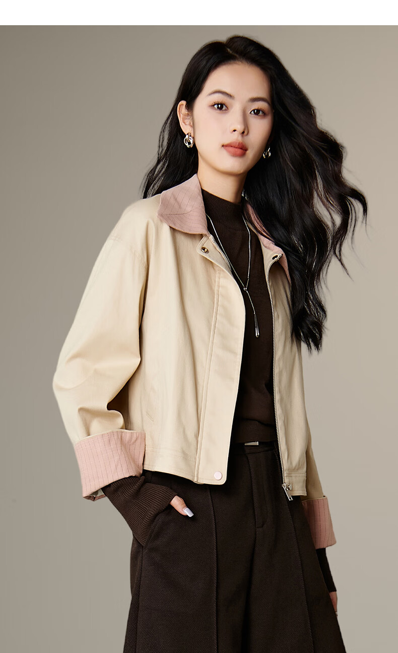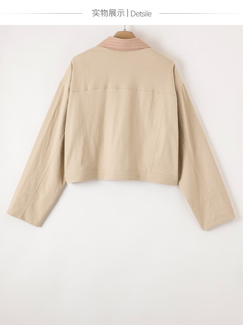 晚白【新品】2026年春款时尚拼接翻领全棉上衣舒适休闲短夹克外套女 浅卡其 M