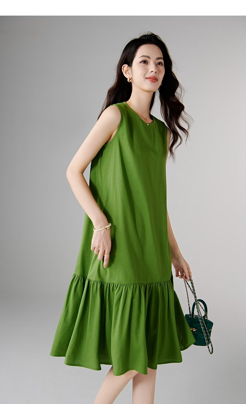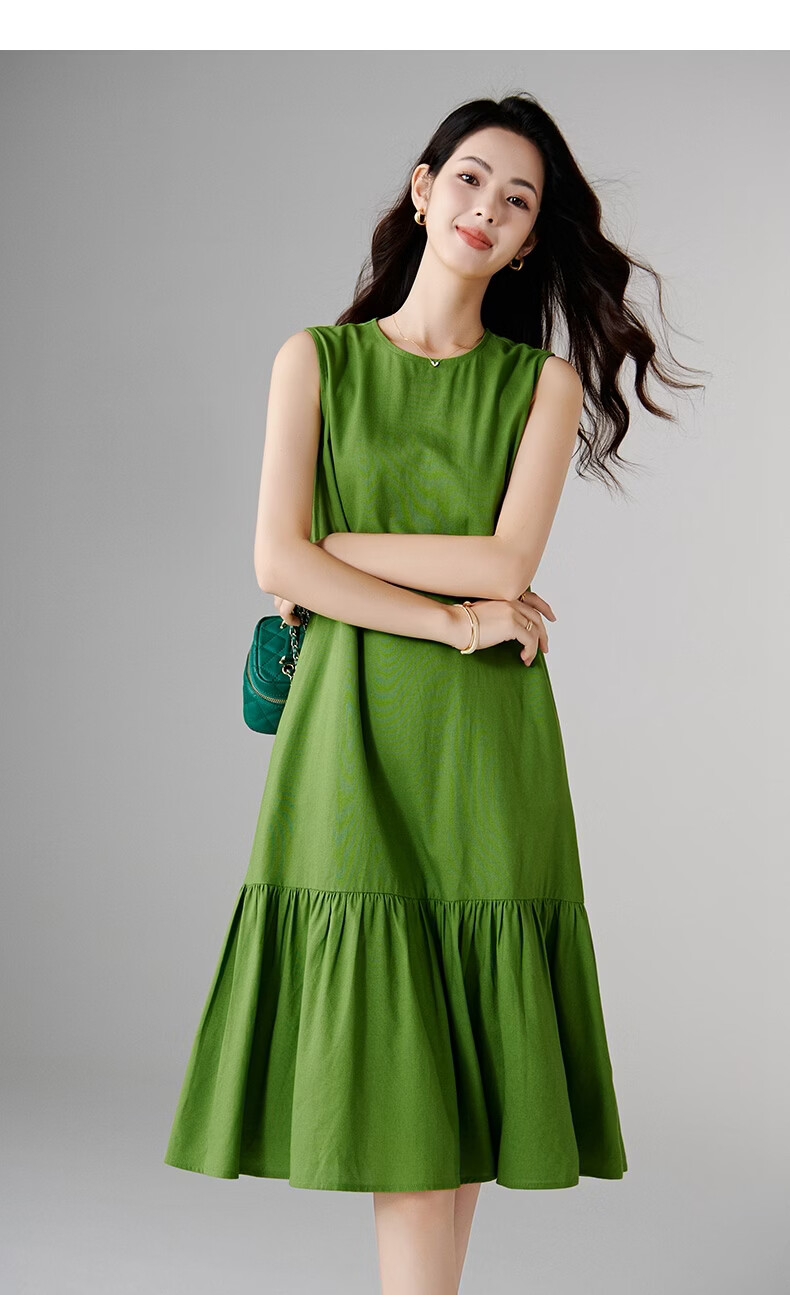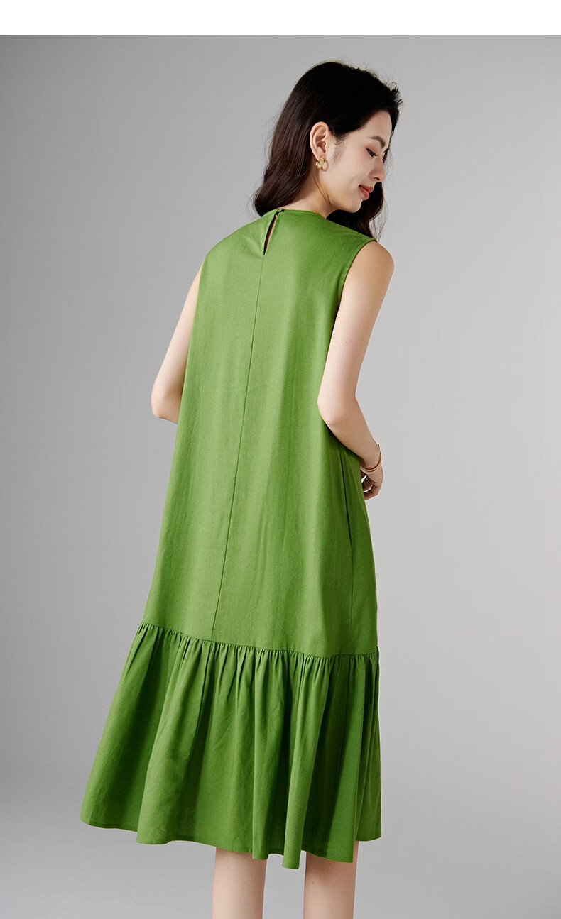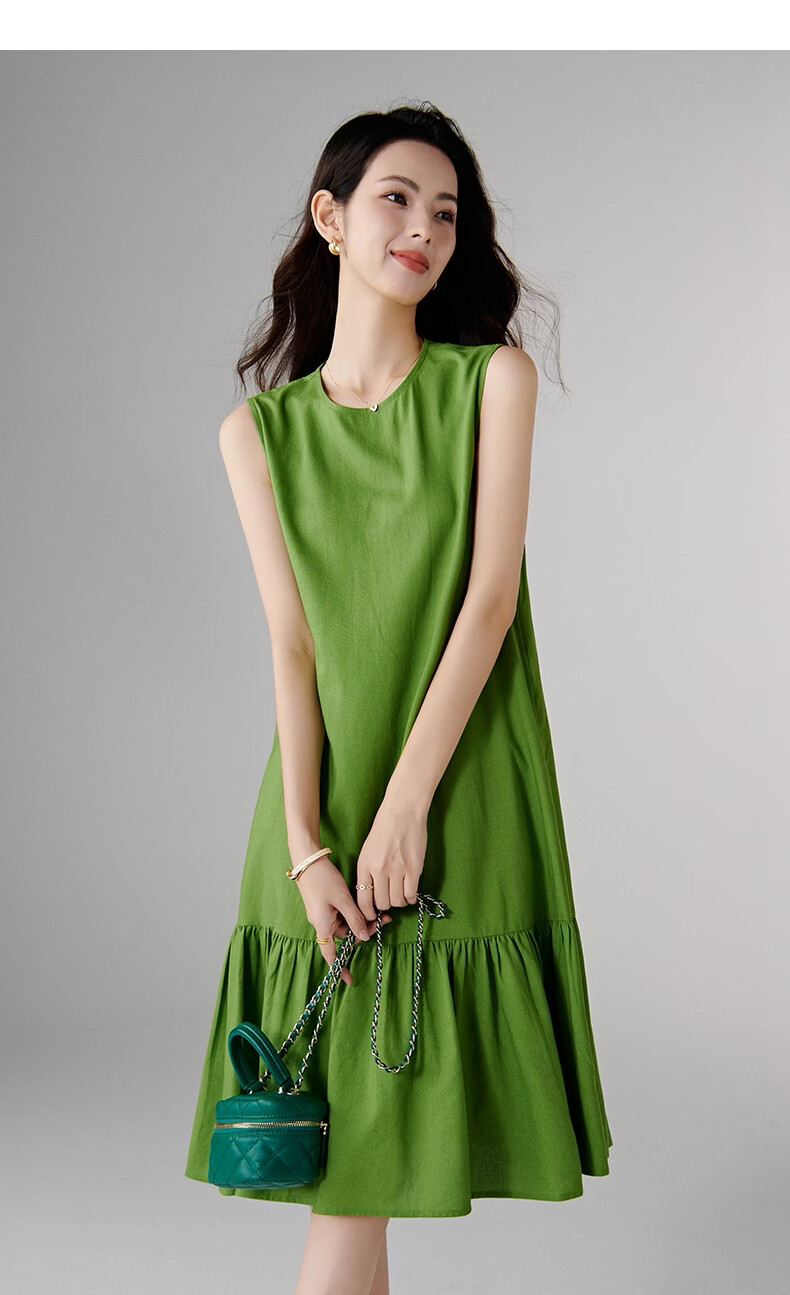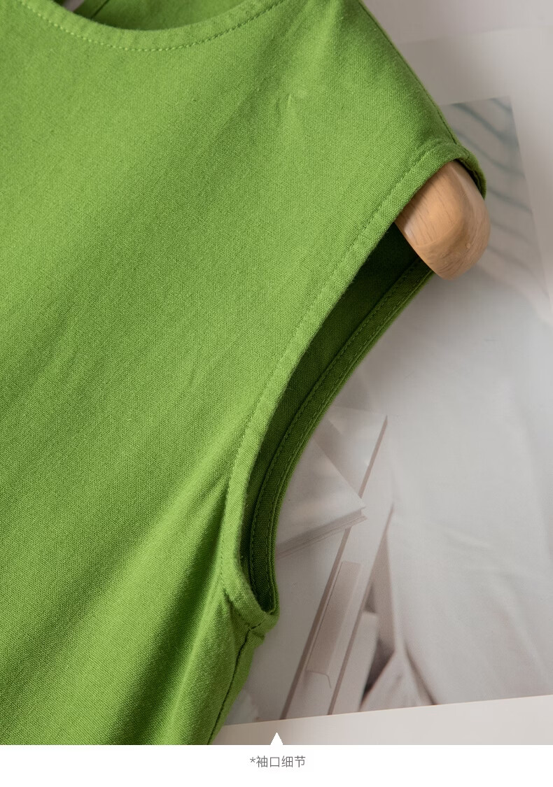 晚白【新品】2026年春款时尚棉麻裙子宽松舒适休闲无袖连衣裙 绿色 S