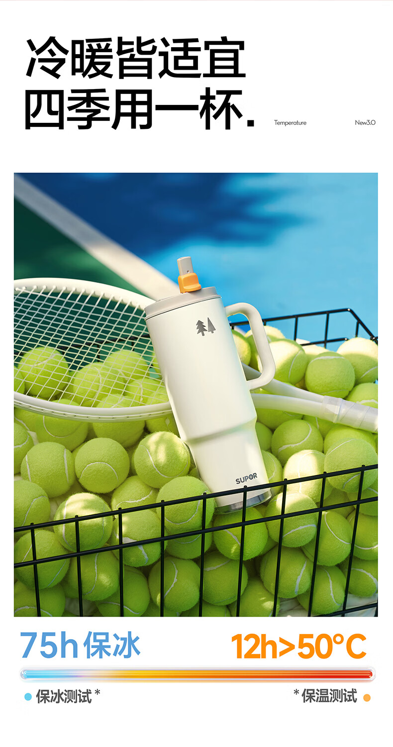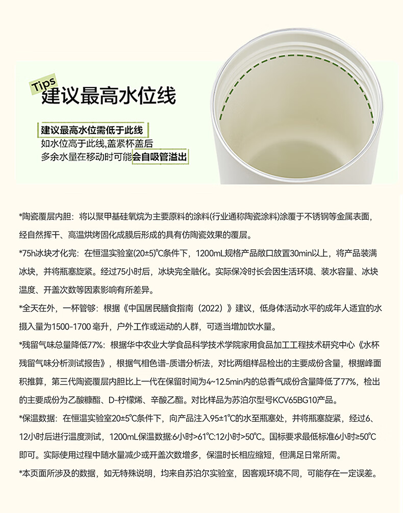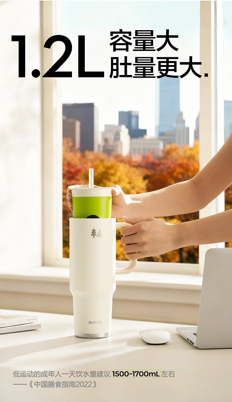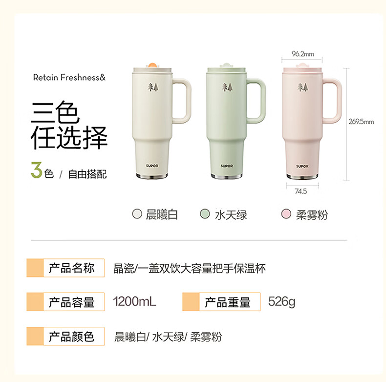 苏泊尔(SUPOR)冰霸杯陶瓷双饮保冷保温杯高颜值吸管杯大容量水杯2026新品 林间绿1200ml赠杯刷+吸管刷+杯贴