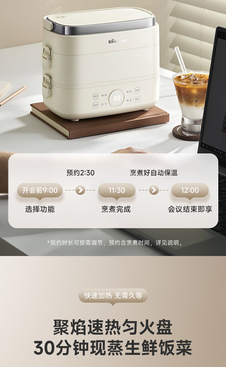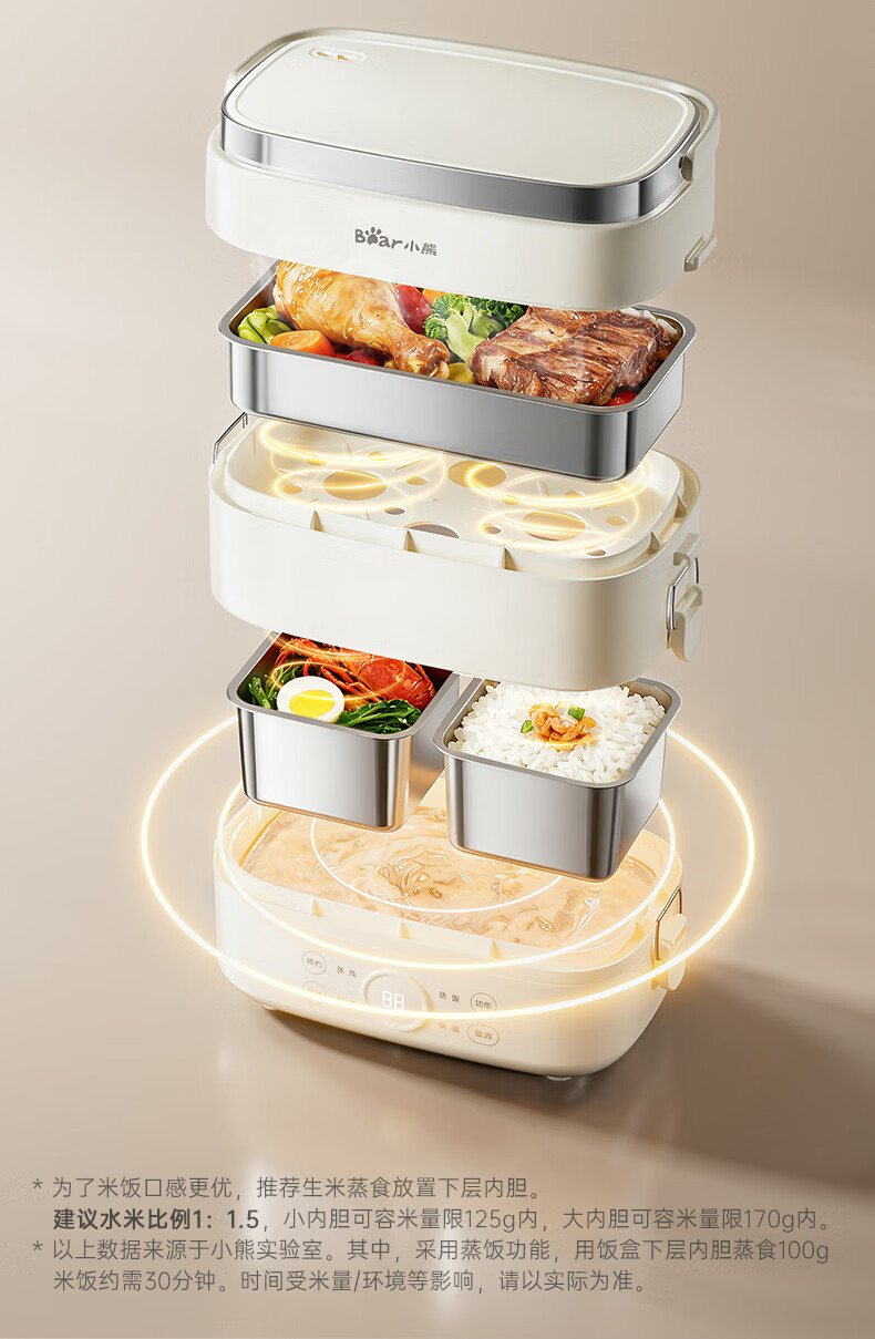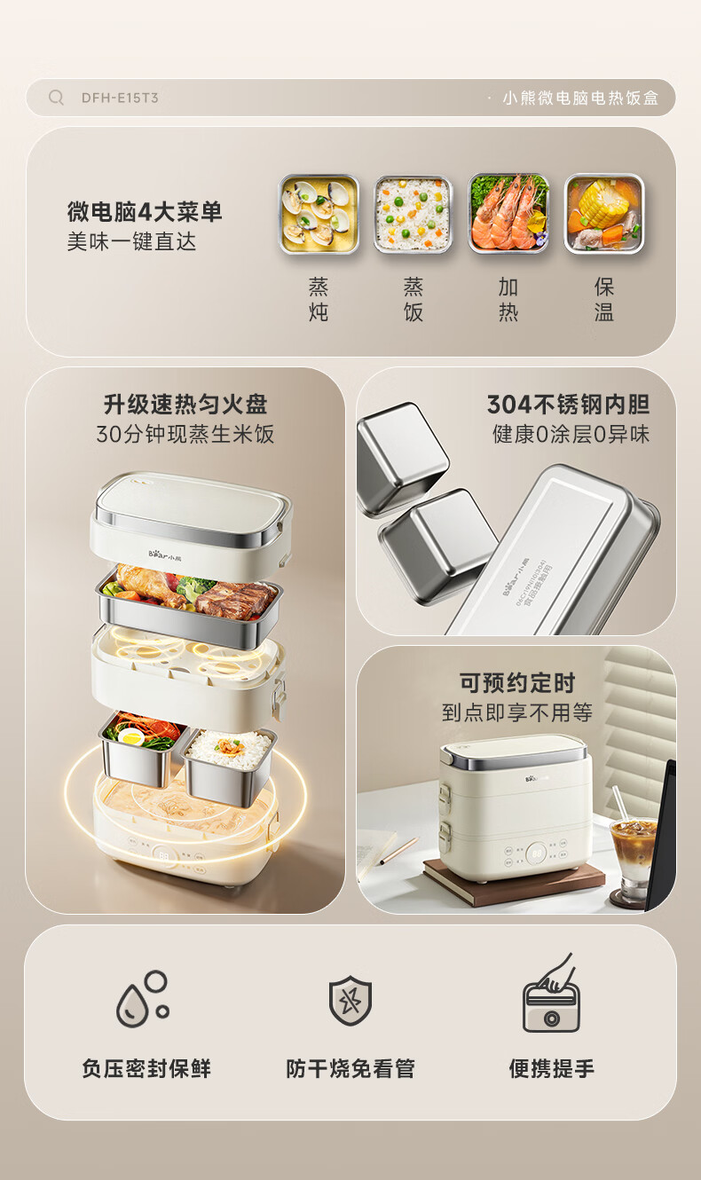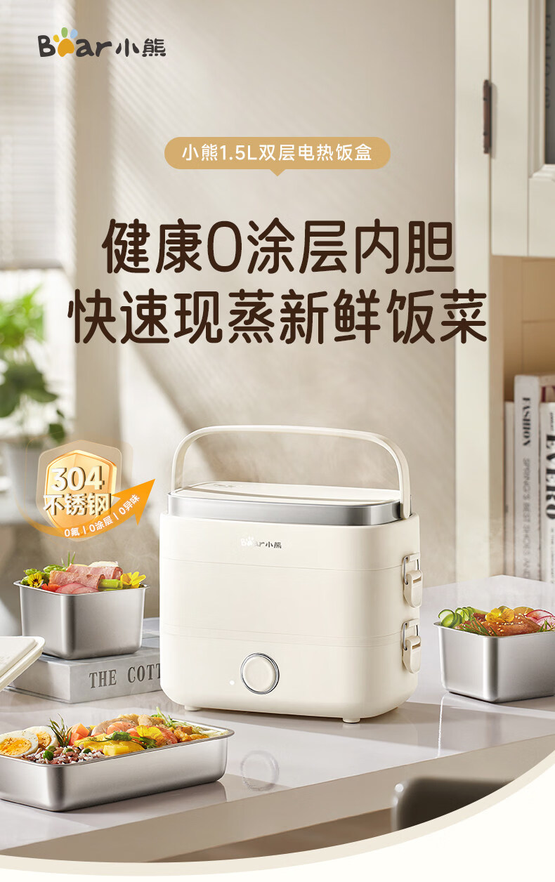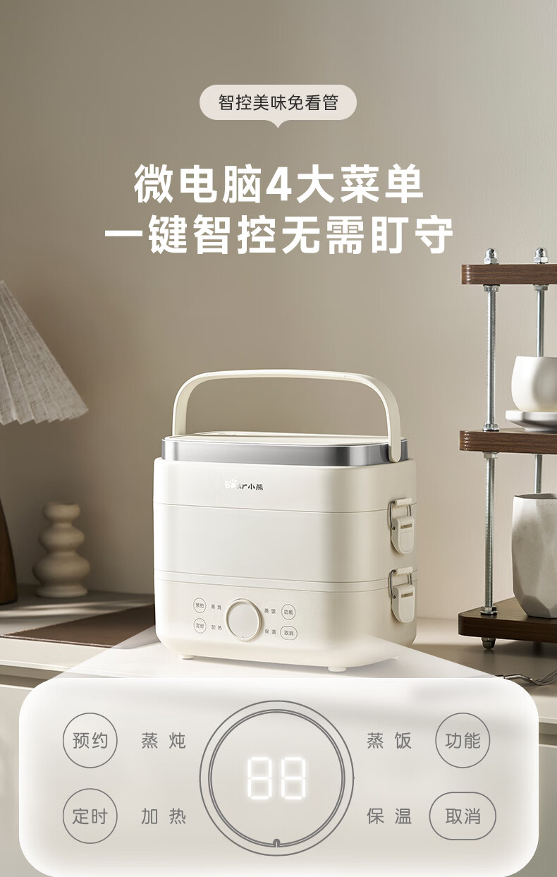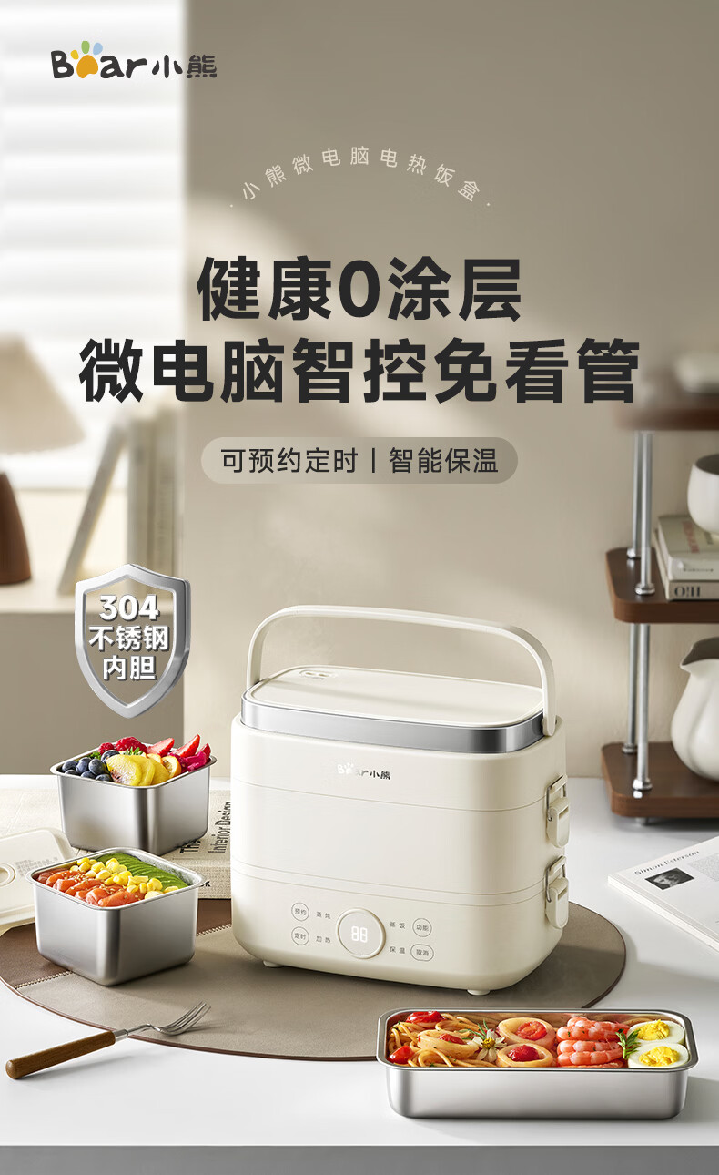 小熊(Bear)加热饭盒电热饭盒可插电上班族带饭神器热饭神器智能可预约0涂层不锈钢防干烧免看管保温饭盒 1.5L 升级微电脑【可预约&保温】