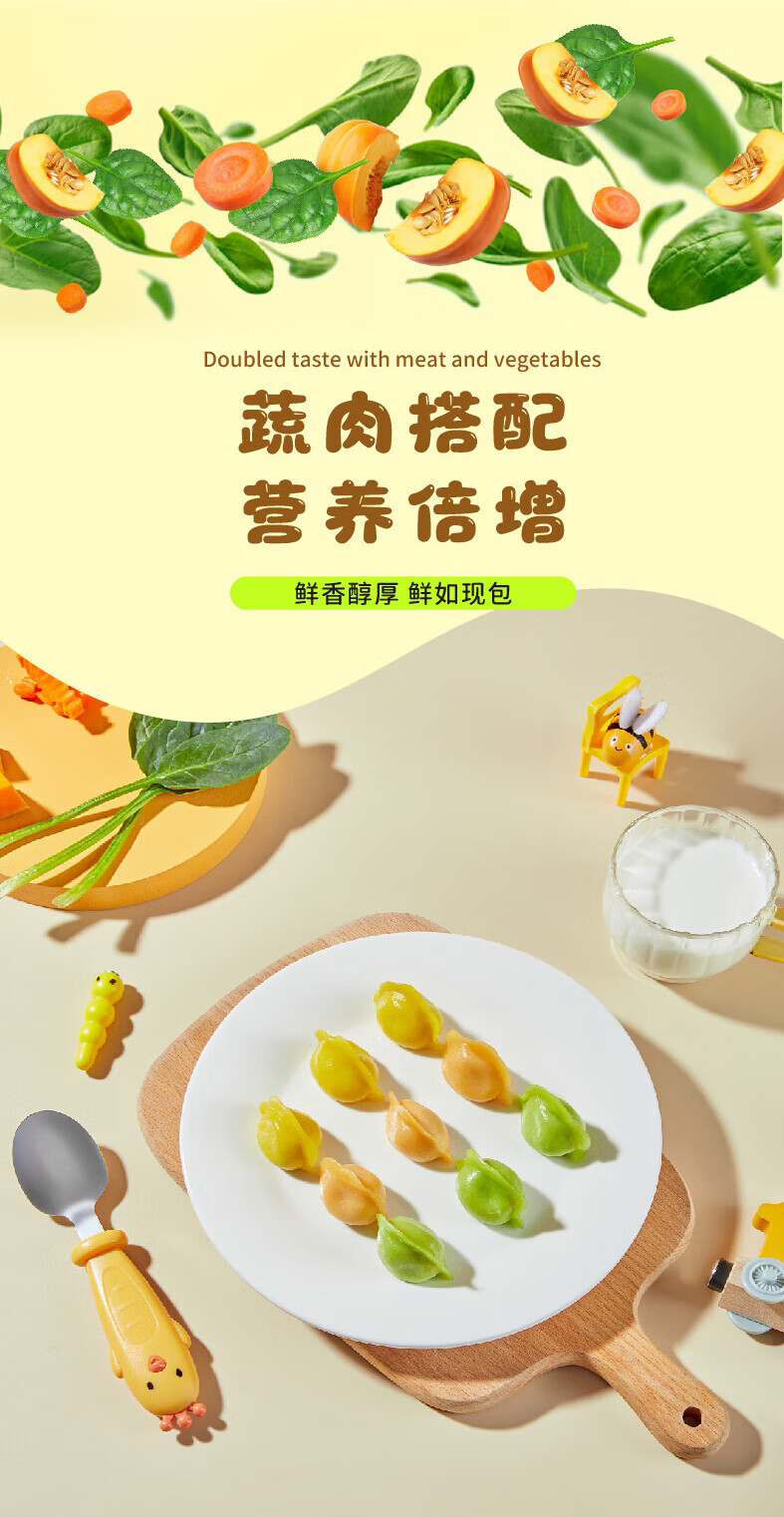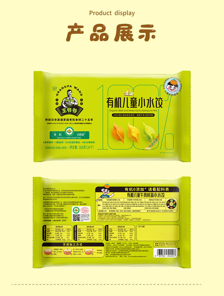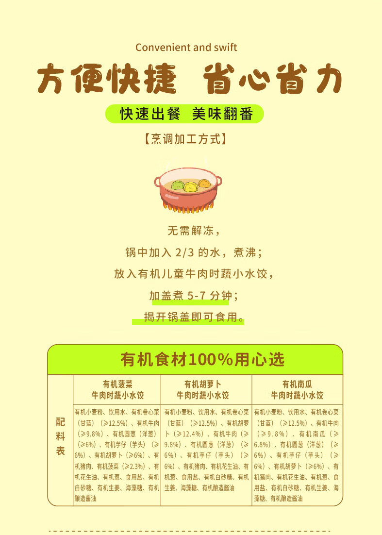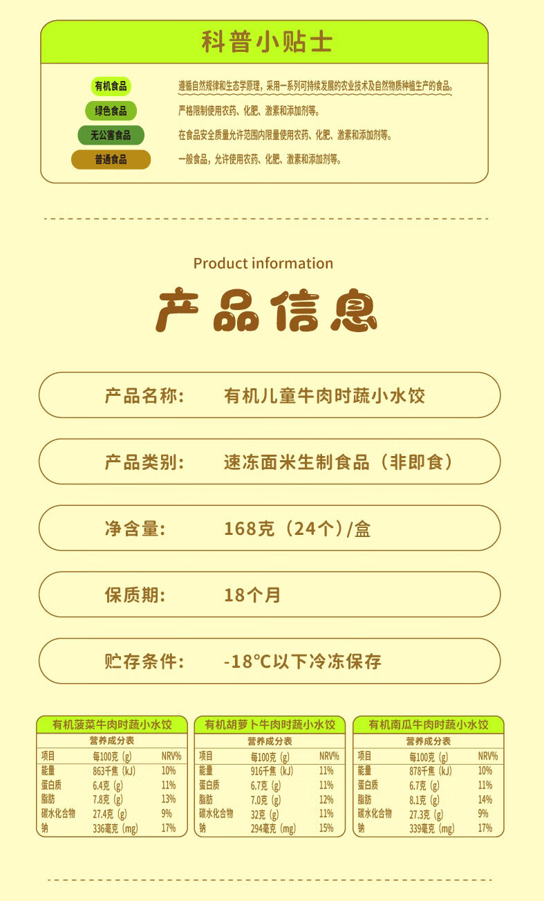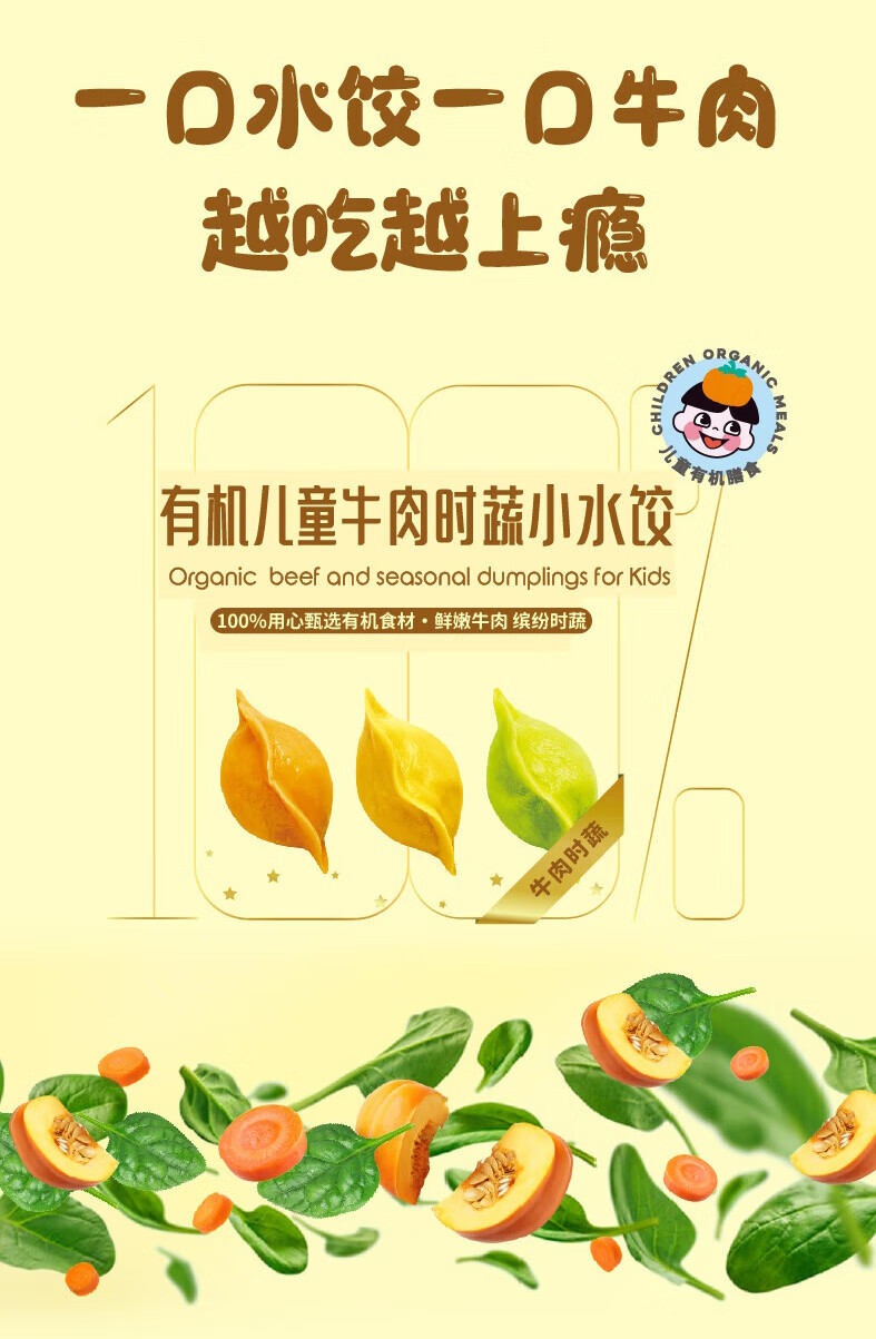 九洲丰园有机儿童牛肉时蔬水饺168g*2袋/48只 宝宝儿童早餐食品半成品饺子