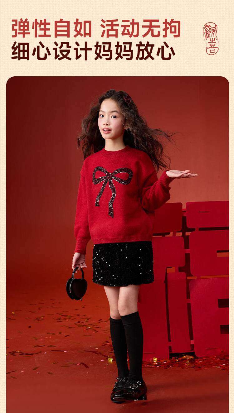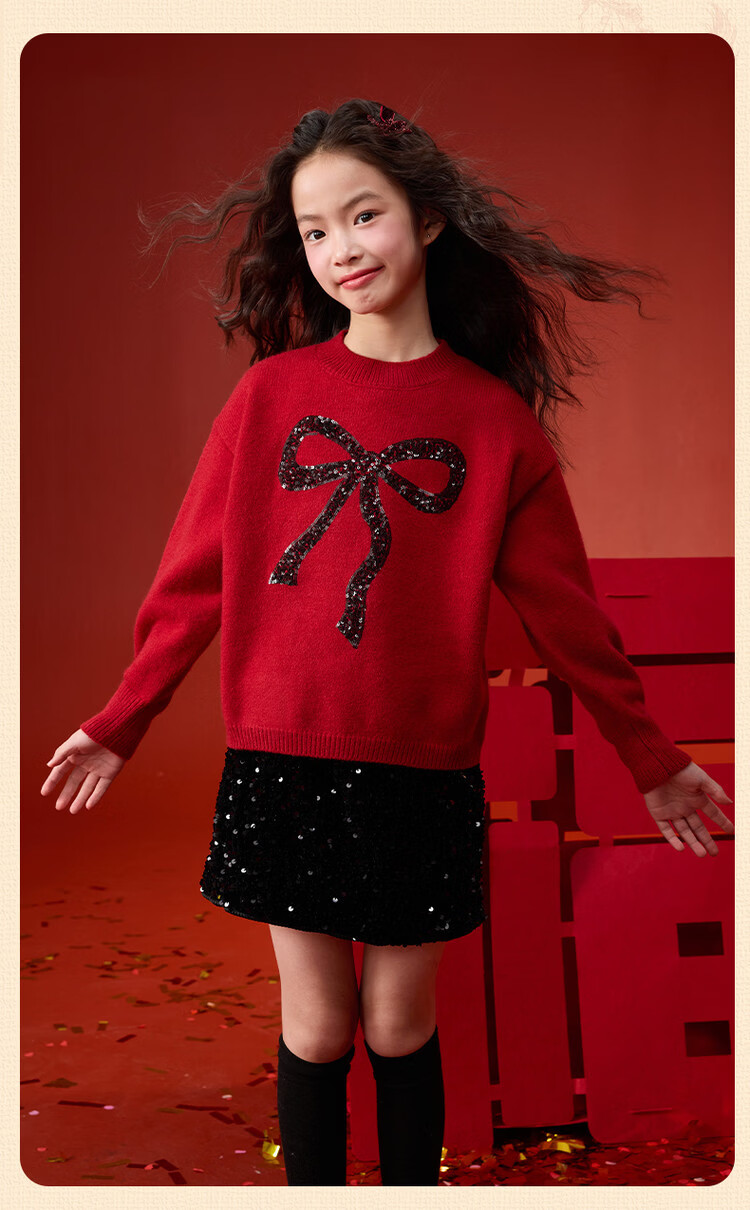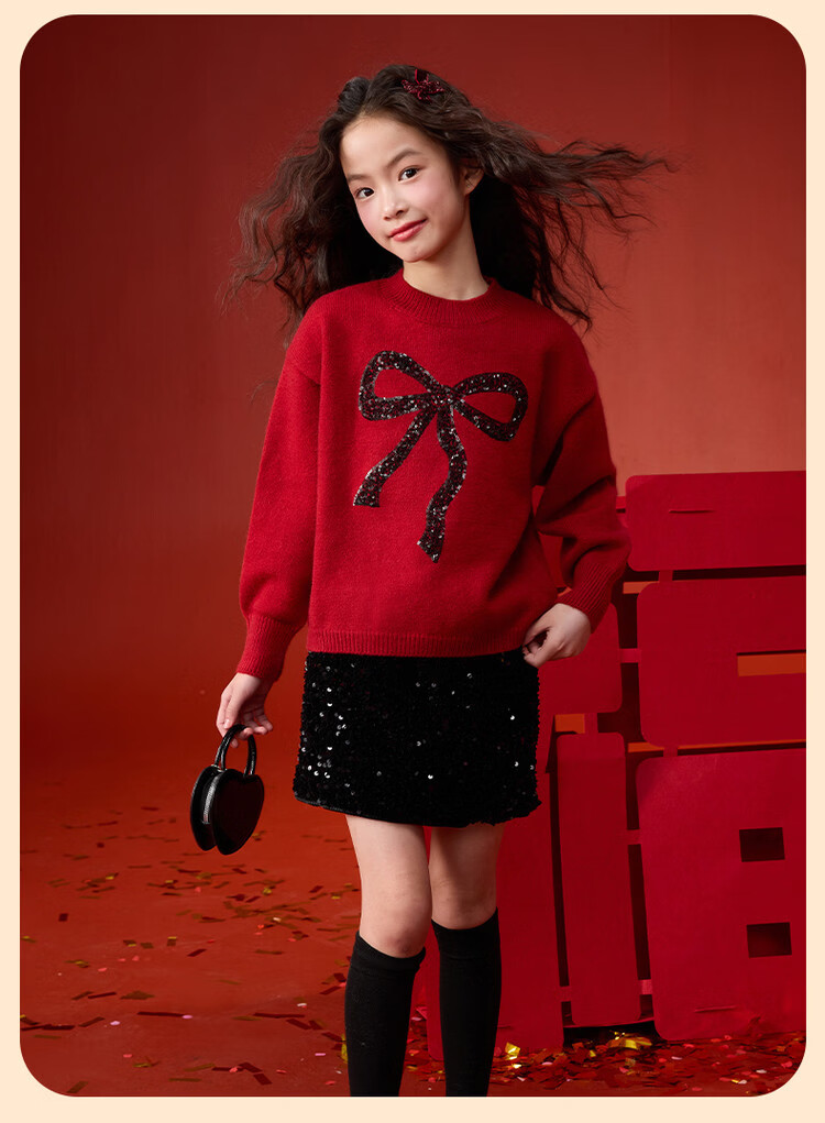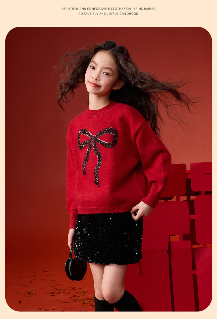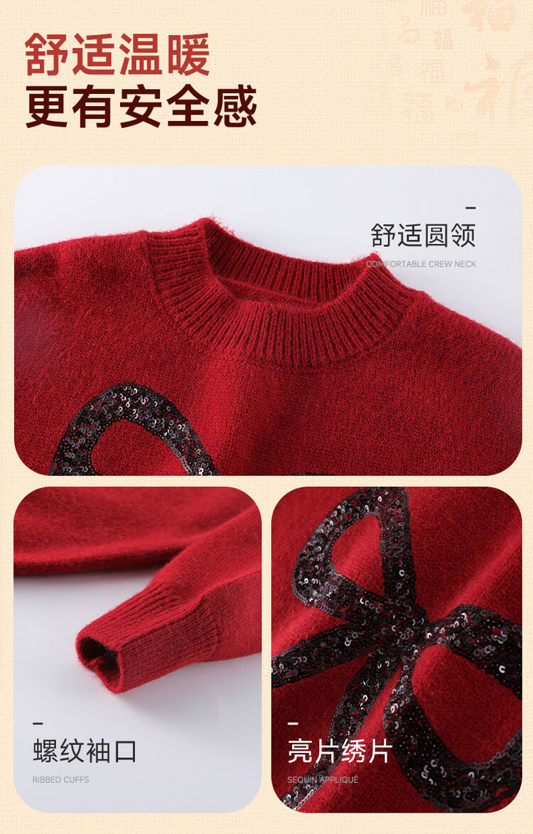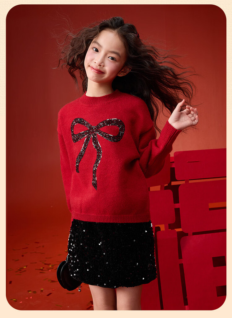 媛媛公主【拜年服】儿童毛衣冬新款女童亮片蝴蝶结线衫中大童保暖打底上衣 红色 110