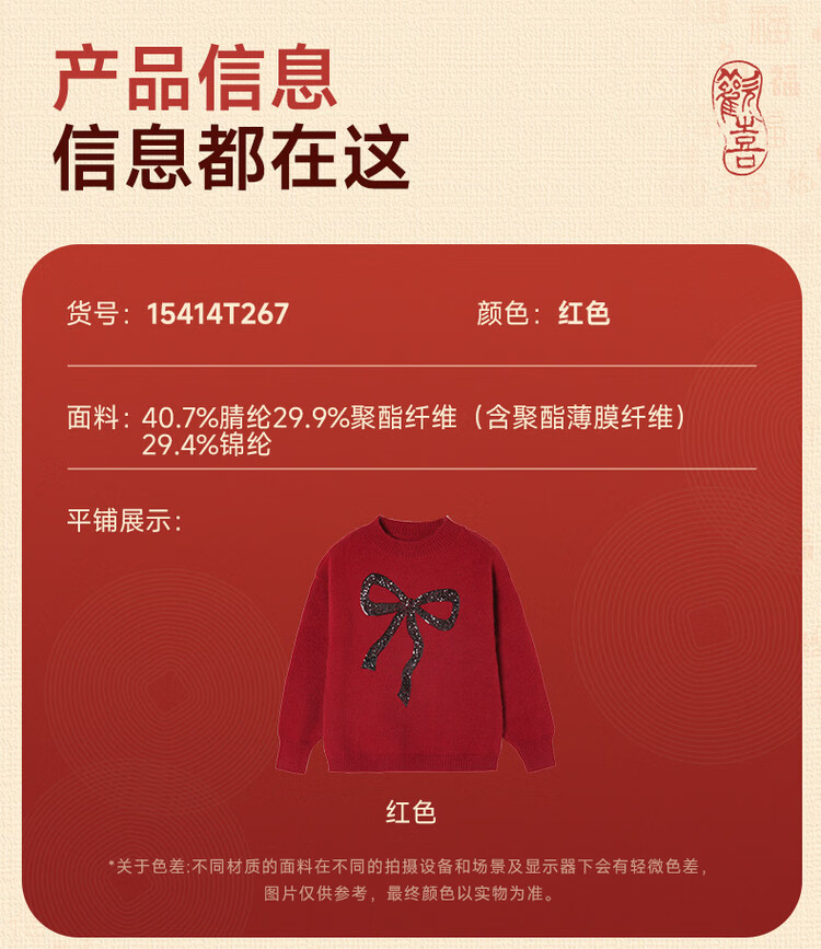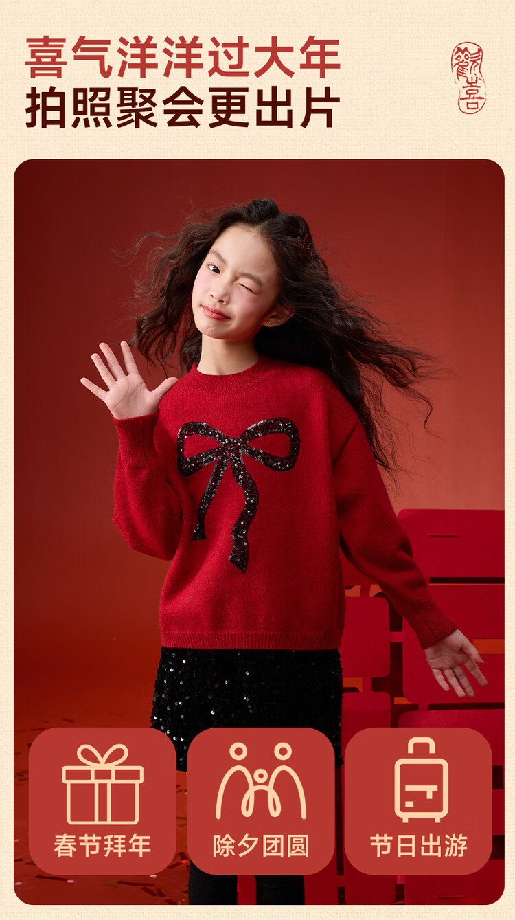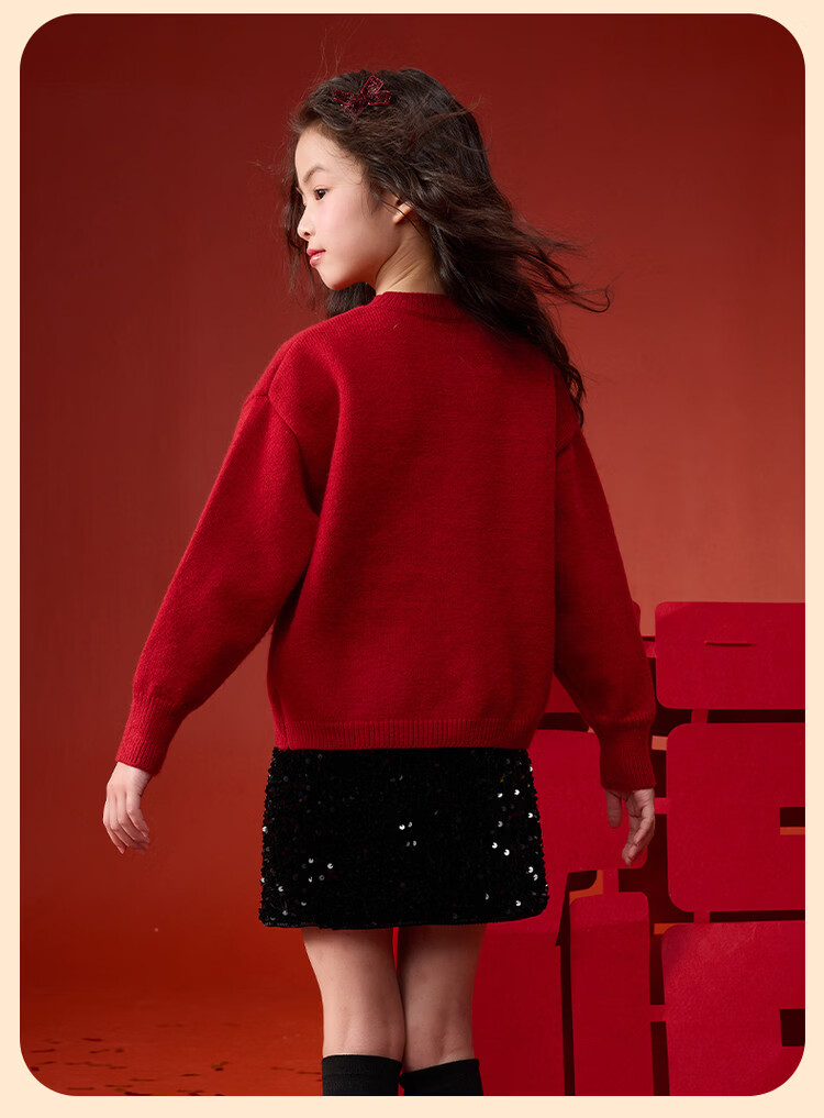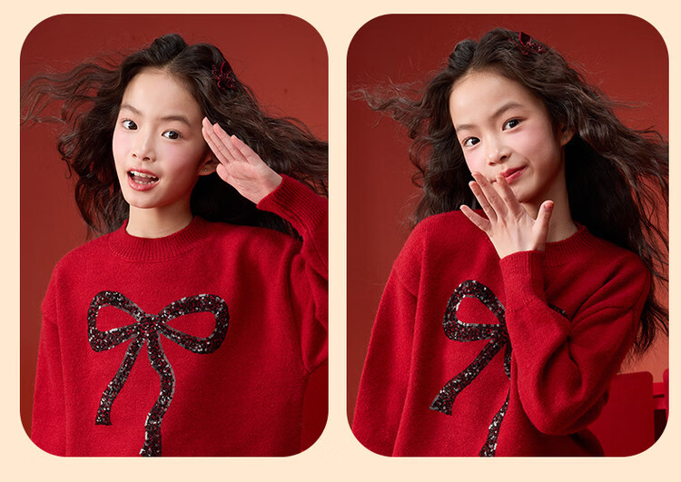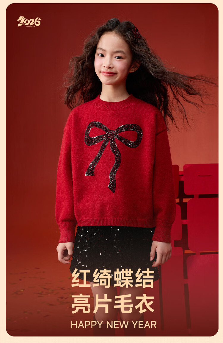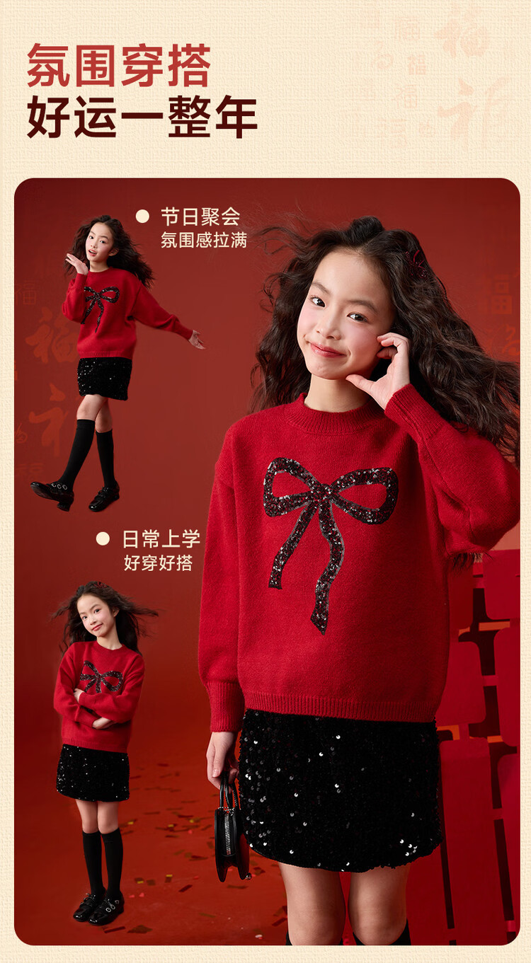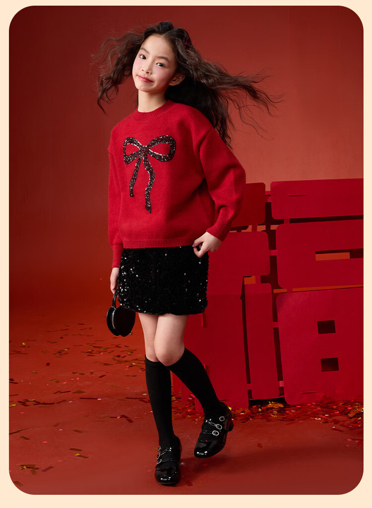 媛媛公主【拜年服】儿童毛衣冬新款女童亮片蝴蝶结线衫中大童保暖打底上衣 红色 110
