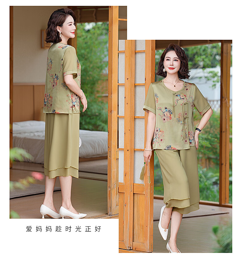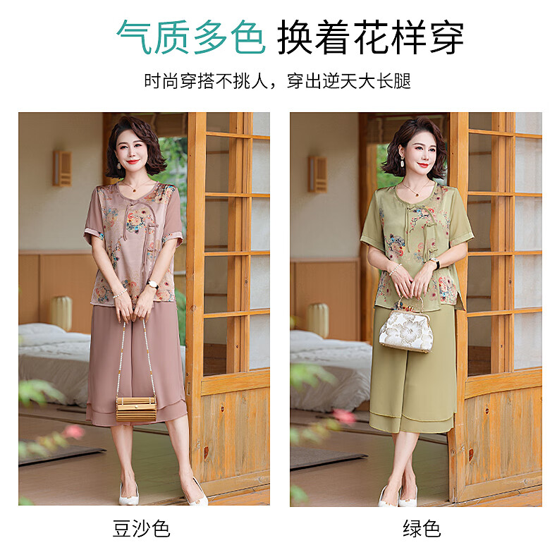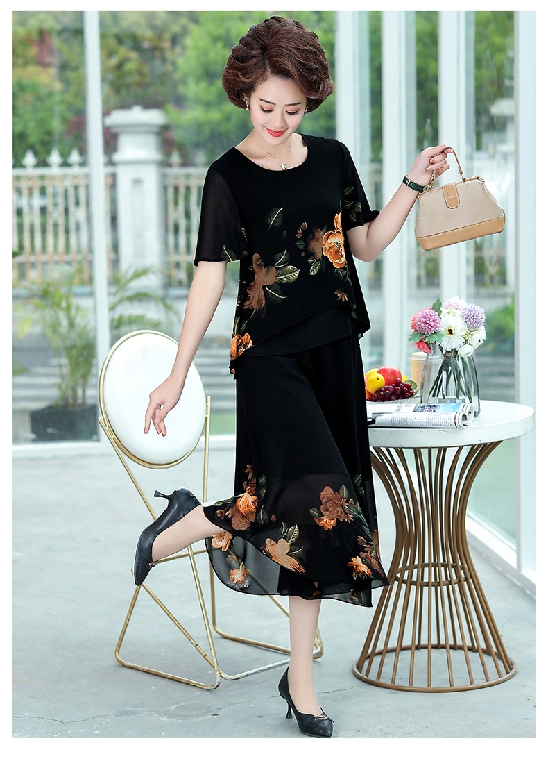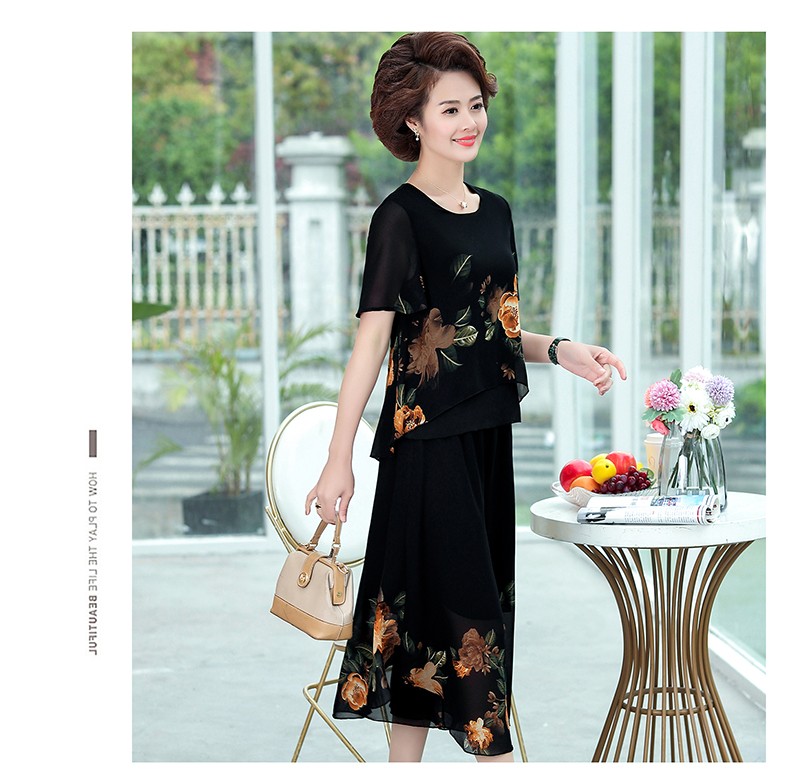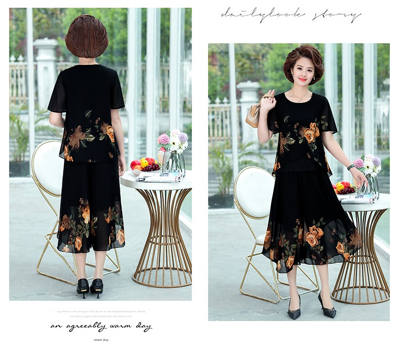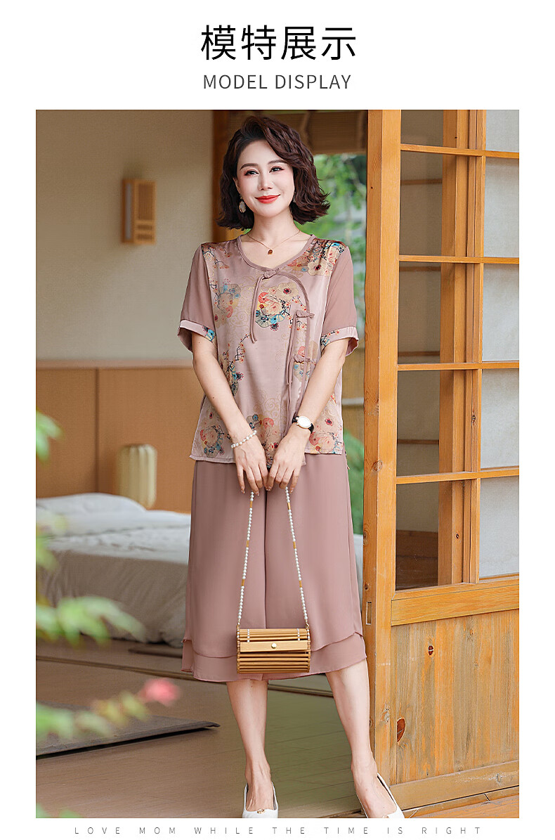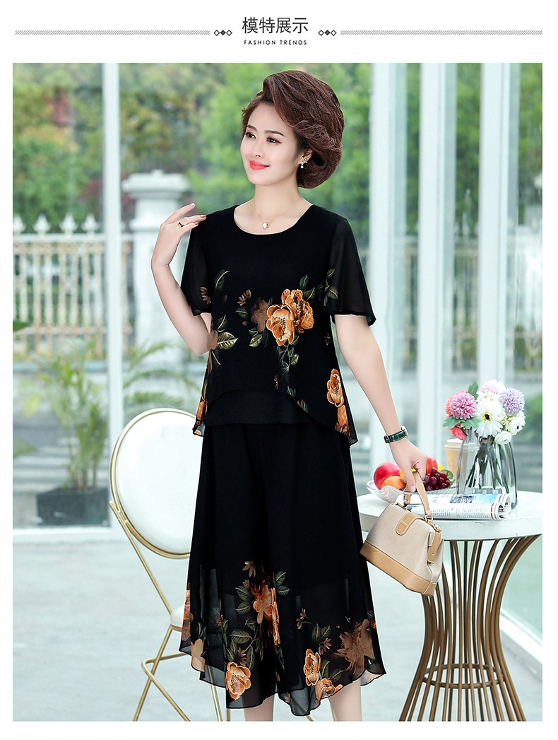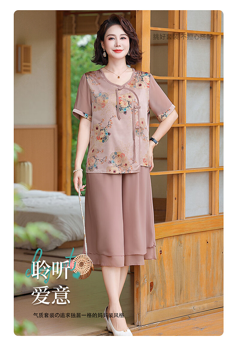 孜颜中老年女装夏装妈妈套装夏季短袖雪纺两件套50到60岁老人母亲衣服 211黄花【套装】 XL 【建议80-100斤】