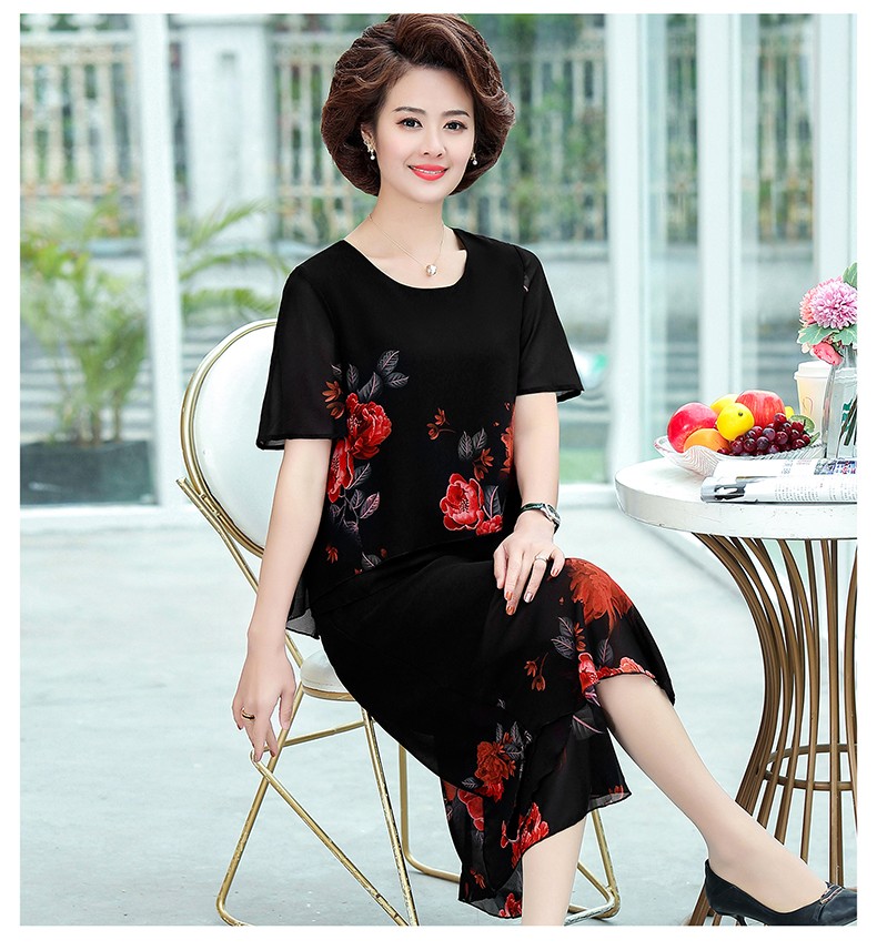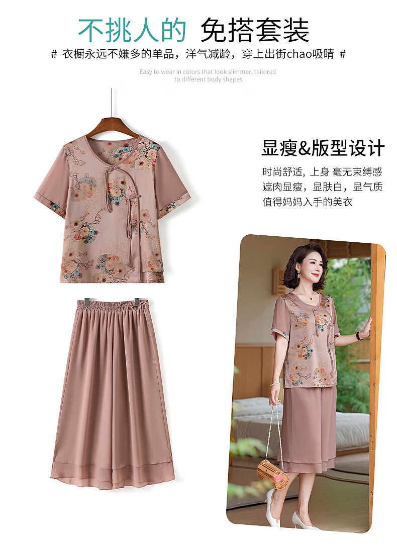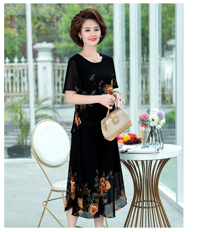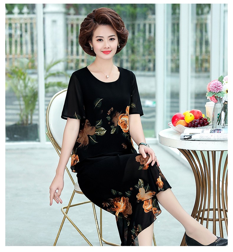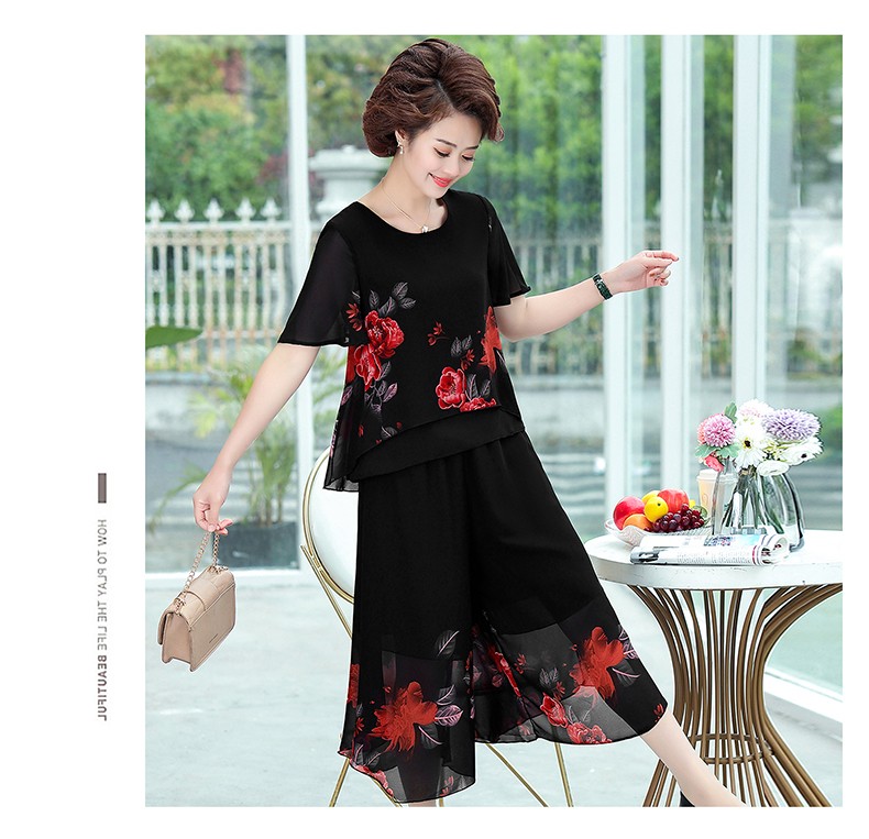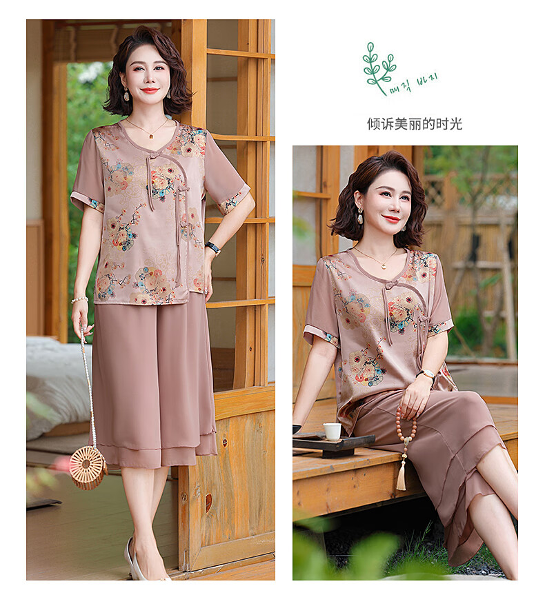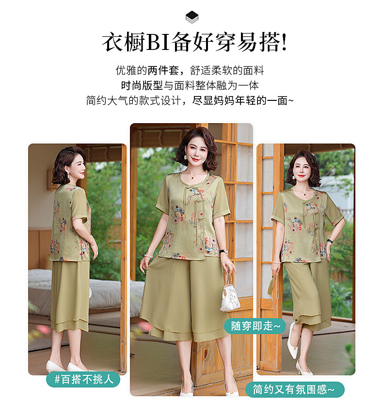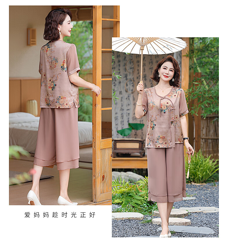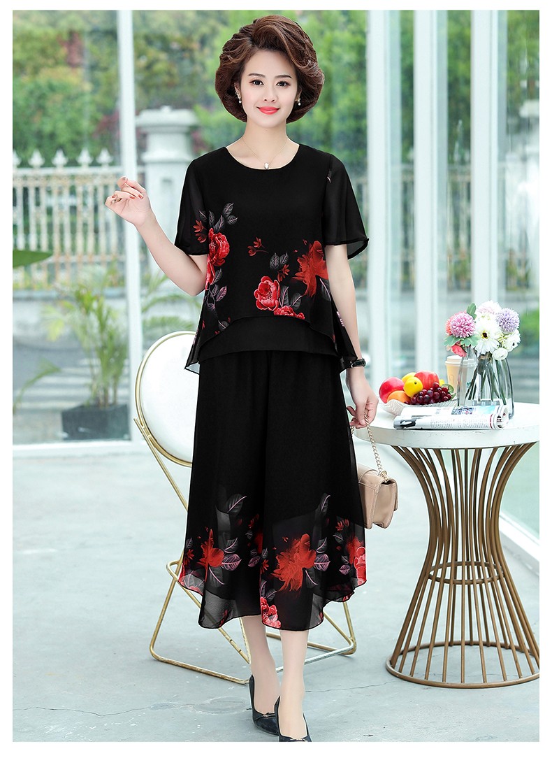 孜颜中老年女装夏装妈妈套装夏季短袖雪纺两件套50到60岁老人母亲衣服 211黄花【套装】 XL 【建议80-100斤】