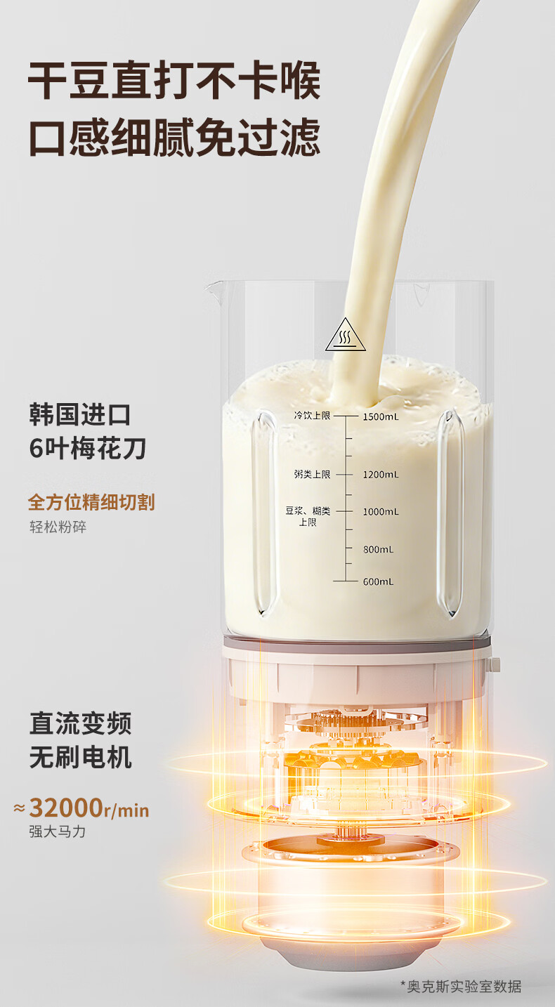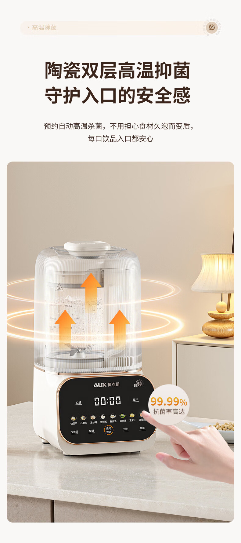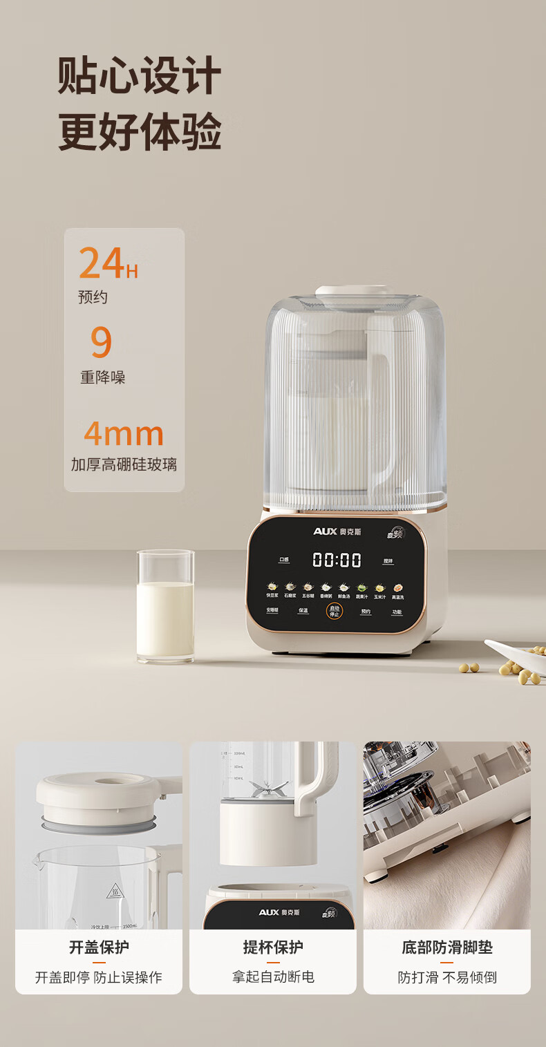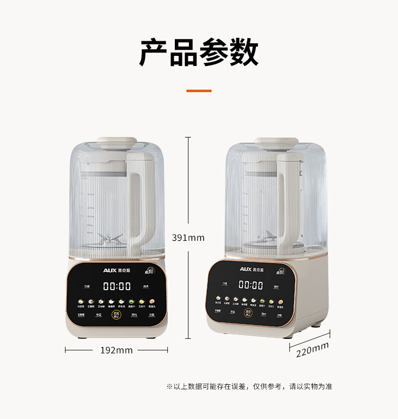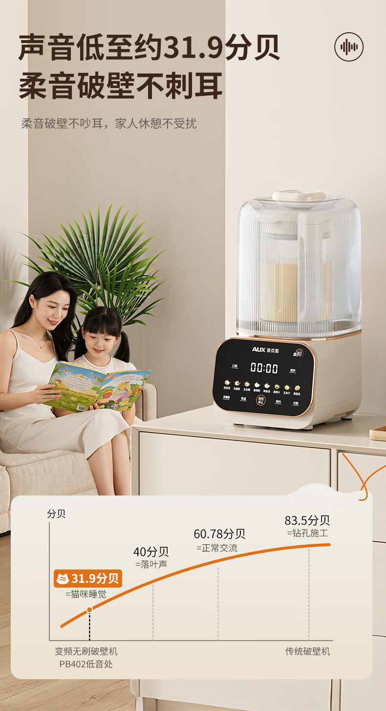 奥克斯(AUX)破壁机家用豆浆机全自动免煮免滤变频轻音无刷电机2-3-4-5人大容量榨汁机加热破壁料理机免手洗 1.5L