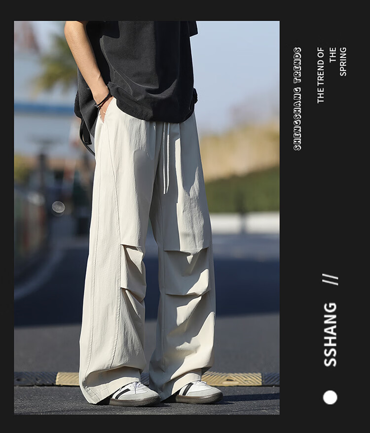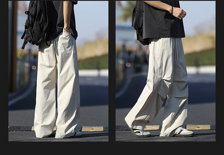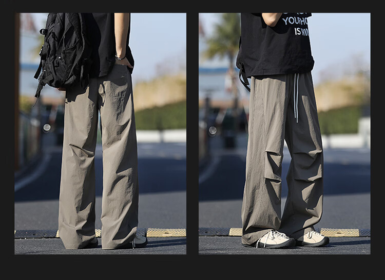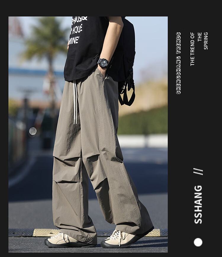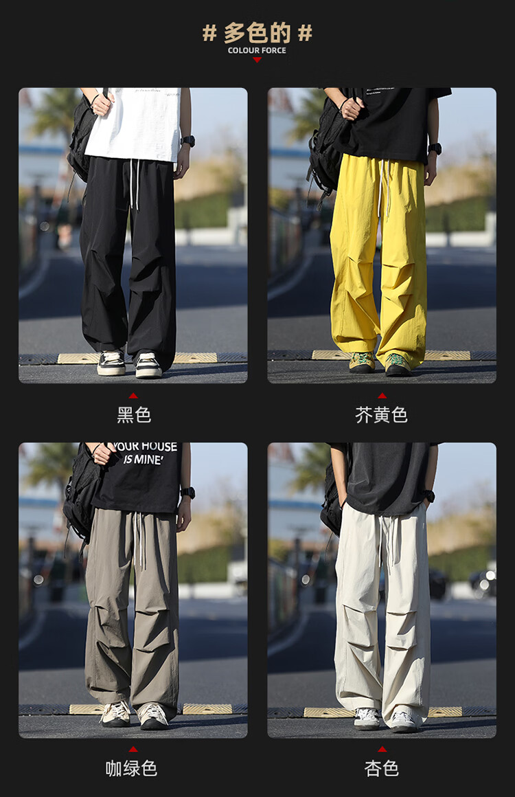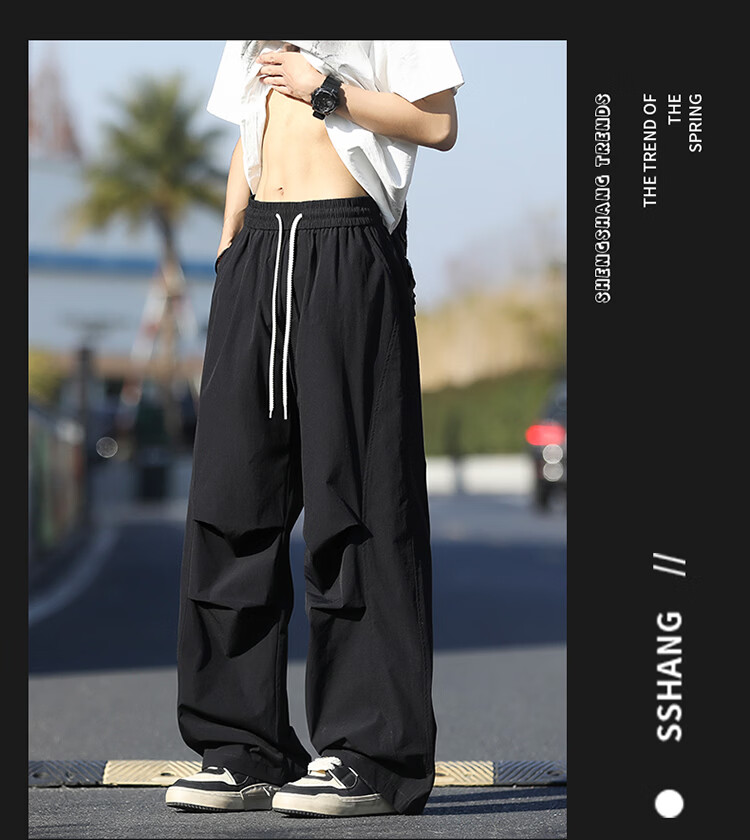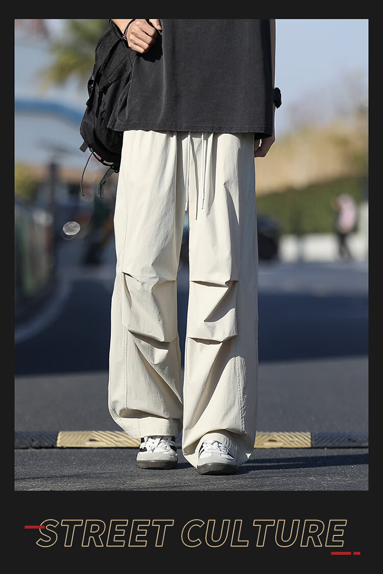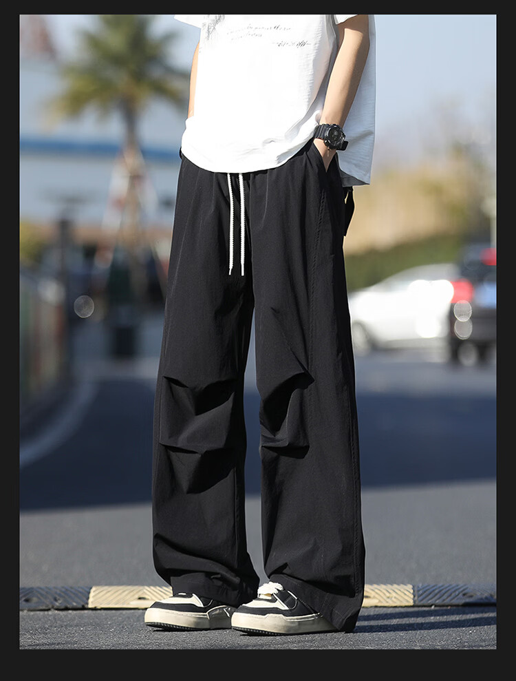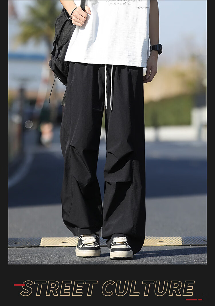 真维斯(Jeanswest)美式褶皱冲锋裤2026夏季新款休闲裤男打褶直筒宽松长裤登山伞兵裤 黑色 纯色 M