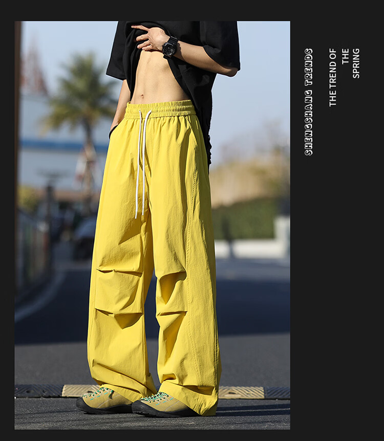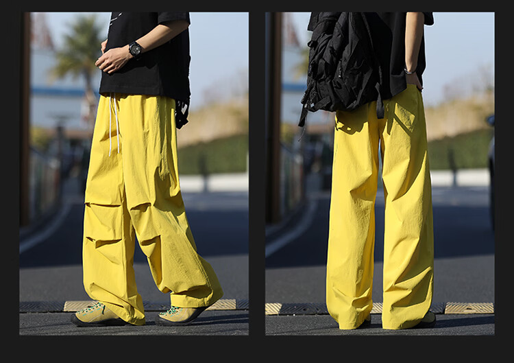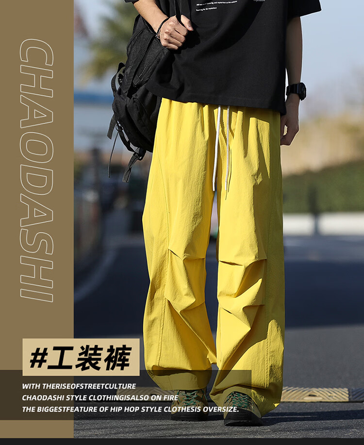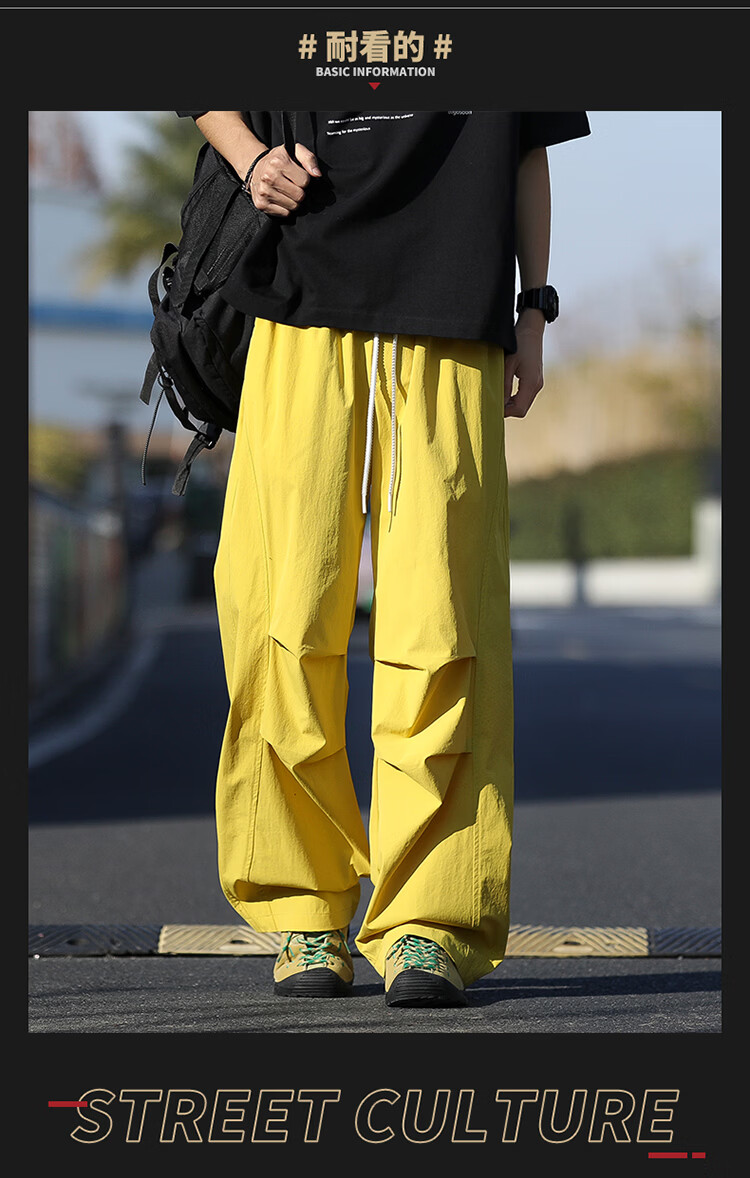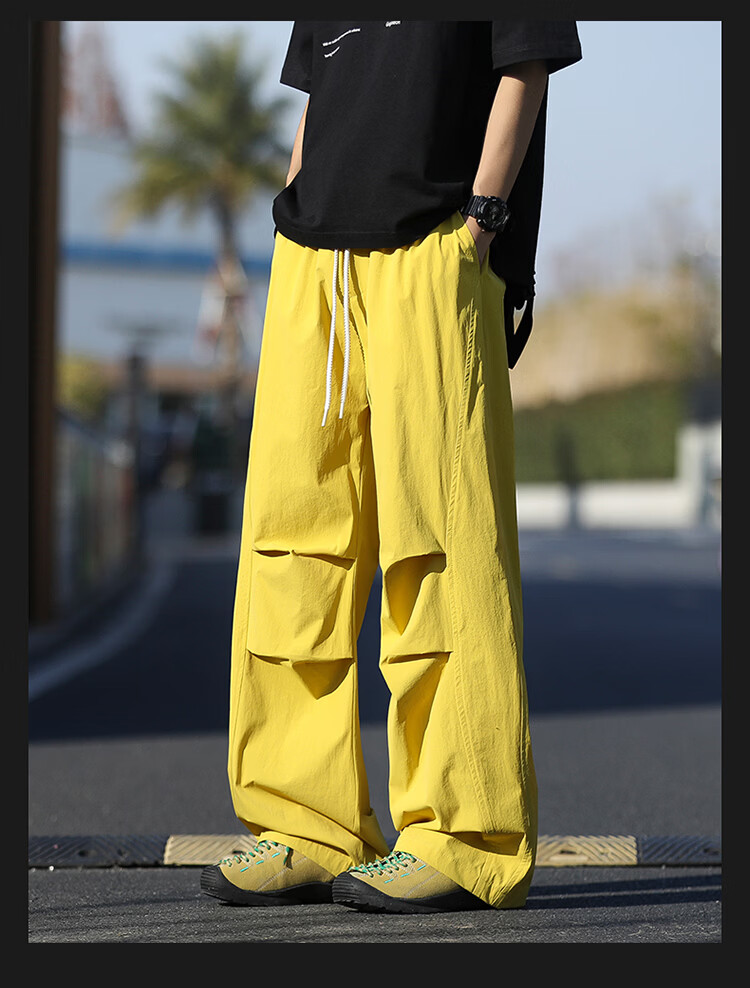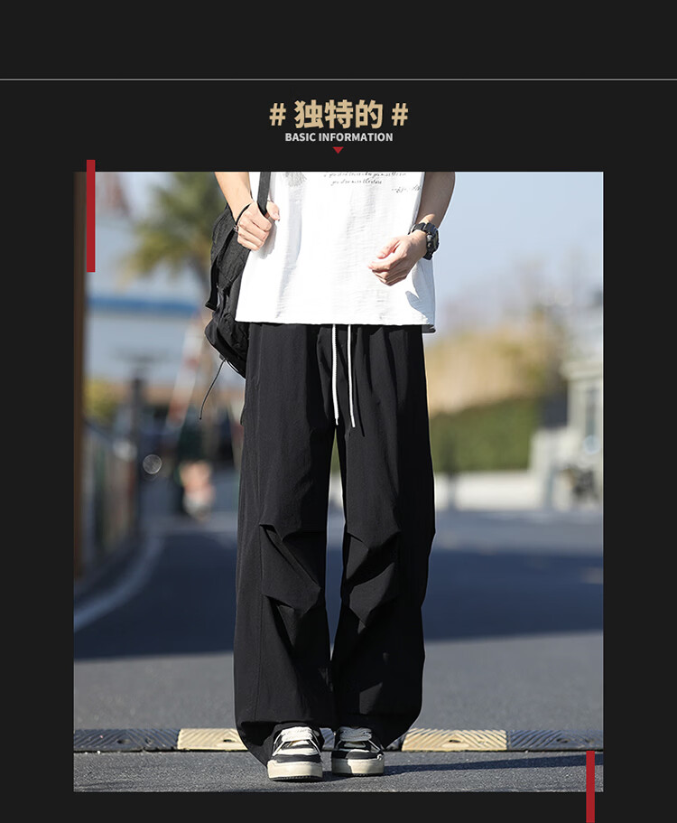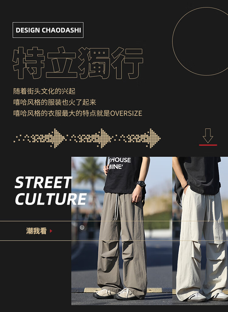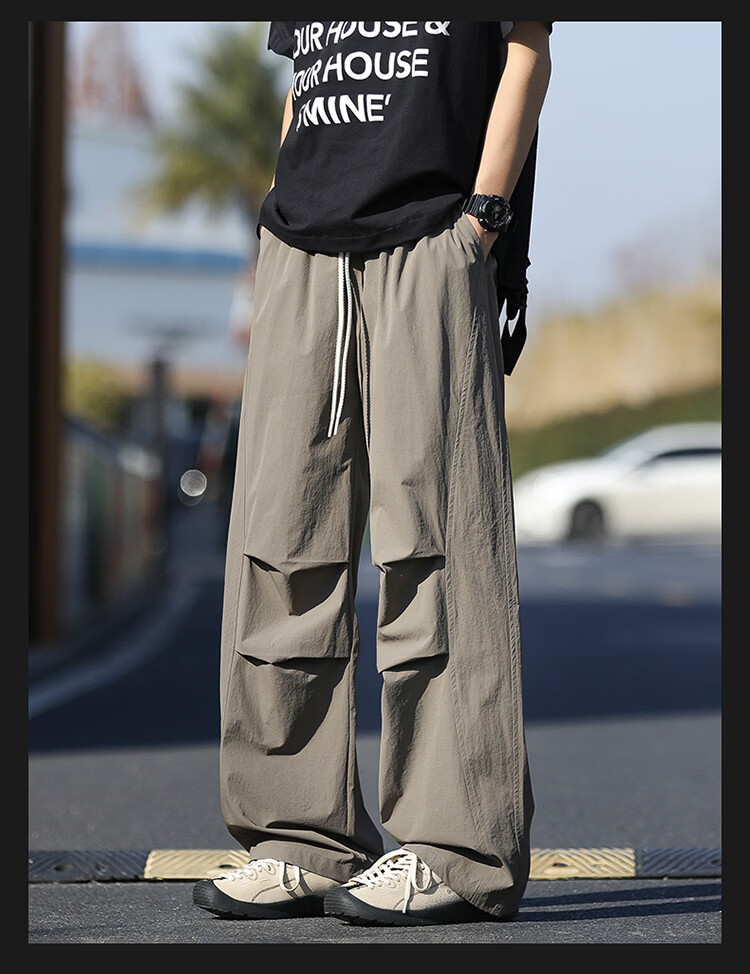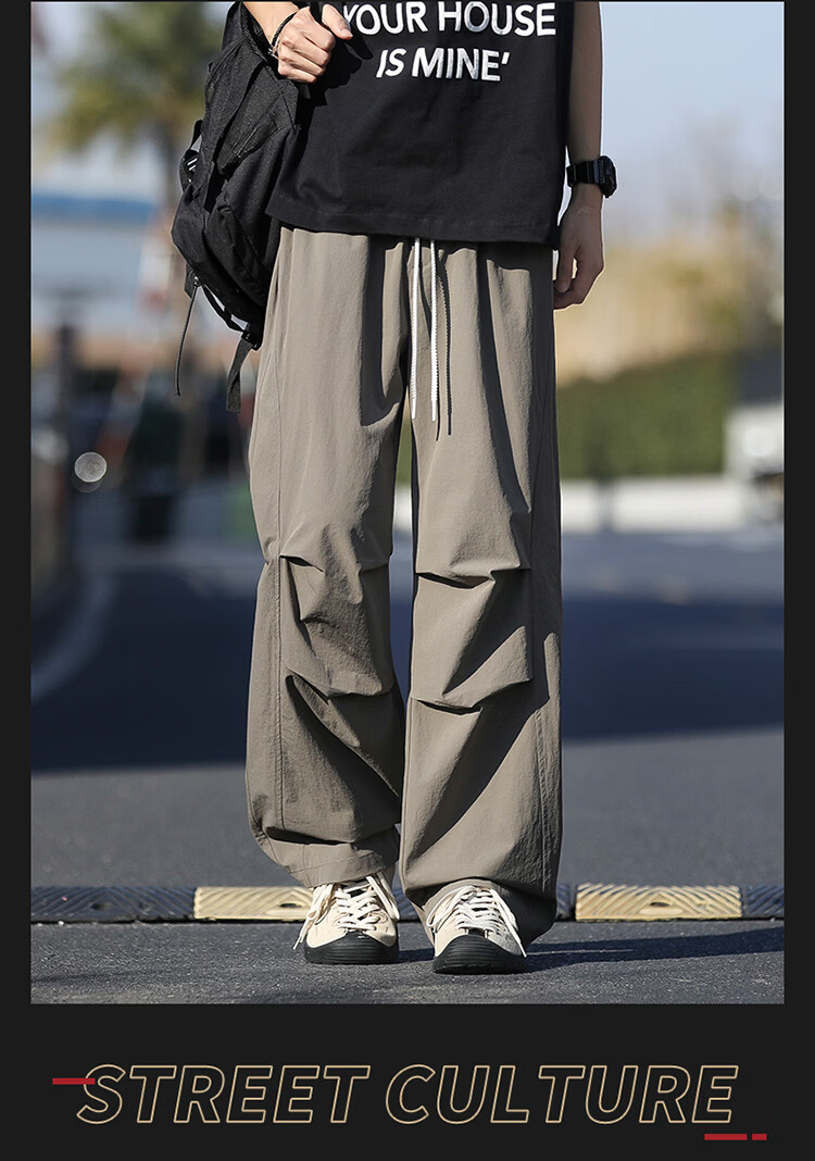 真维斯(Jeanswest)美式褶皱冲锋裤2026夏季新款休闲裤男打褶直筒宽松长裤登山伞兵裤 黑色 纯色 M