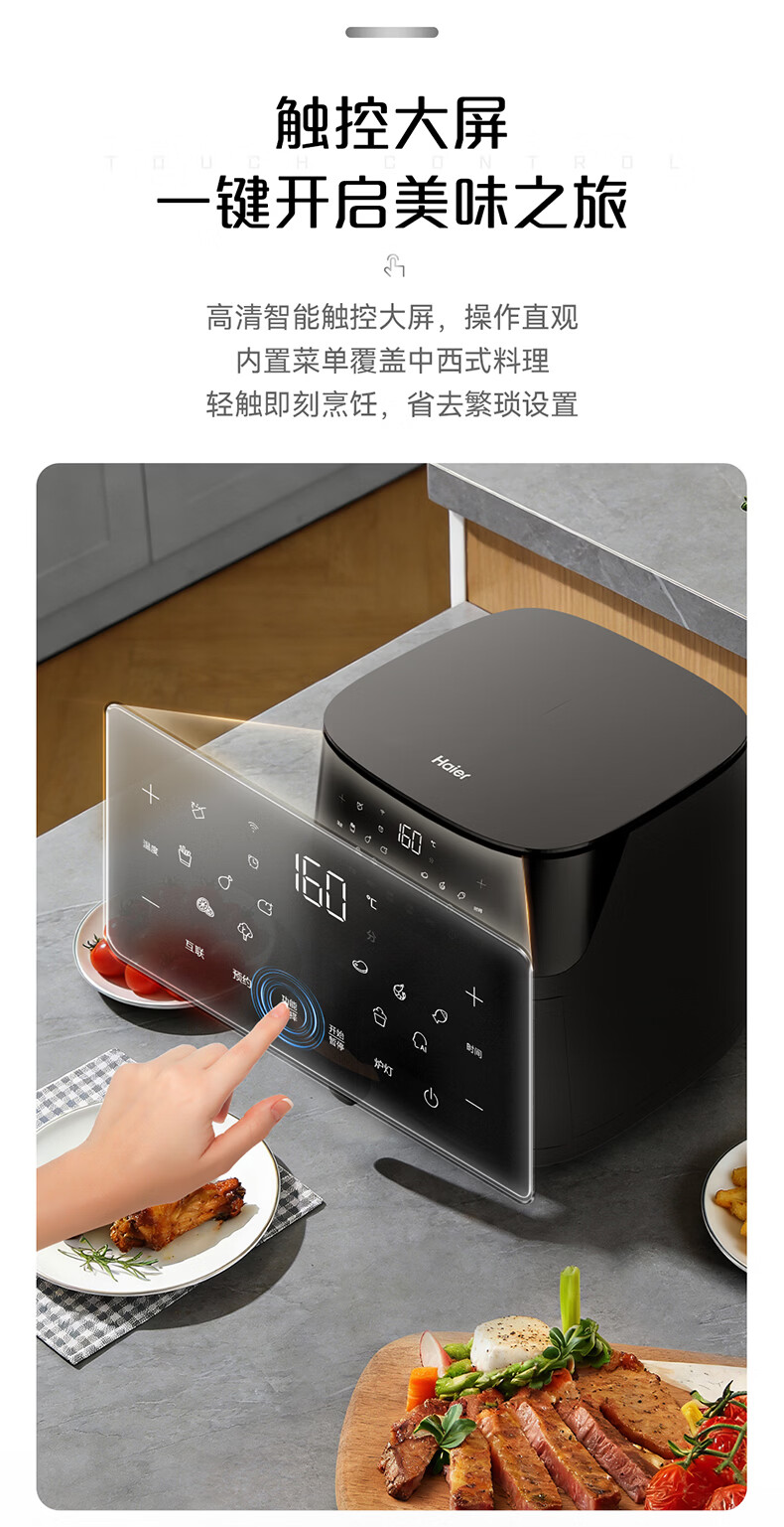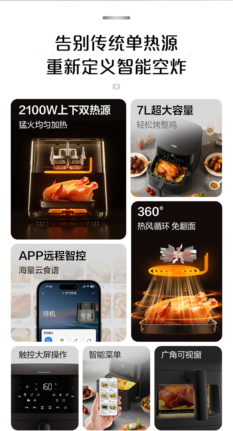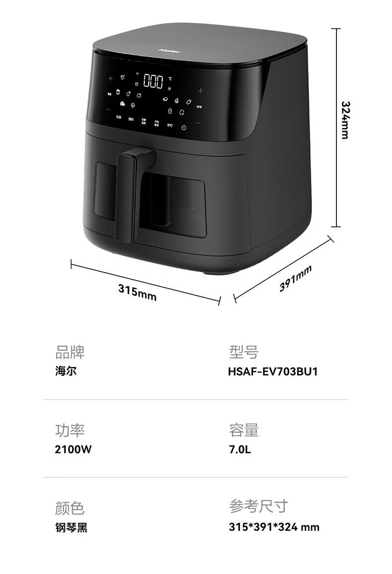 海尔空气炸锅家用多功能 双热源 可视电子触控 大容量全金属内腔 APP远程智控 7L 智家APP操控HSAF-EV703BU1
