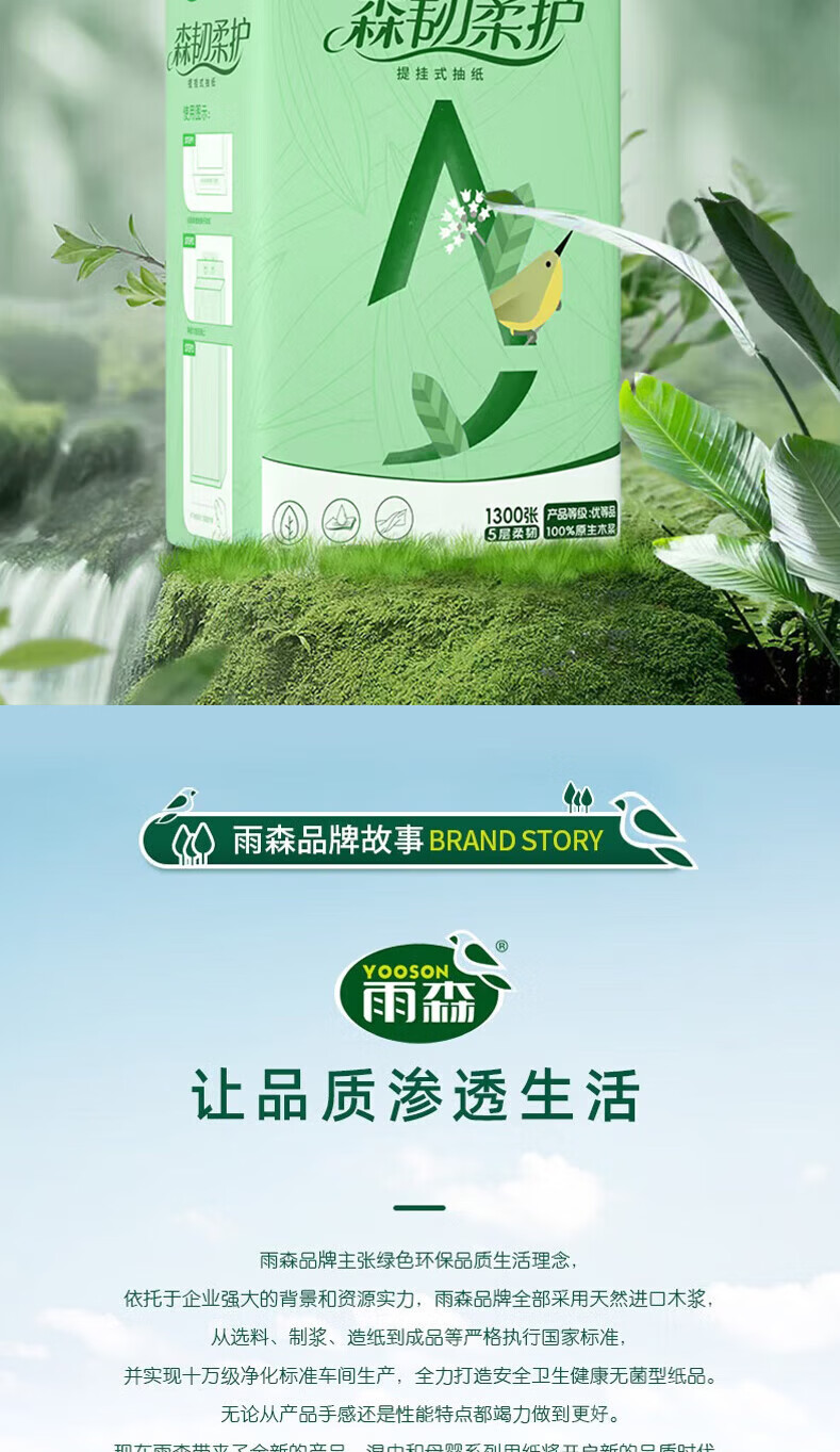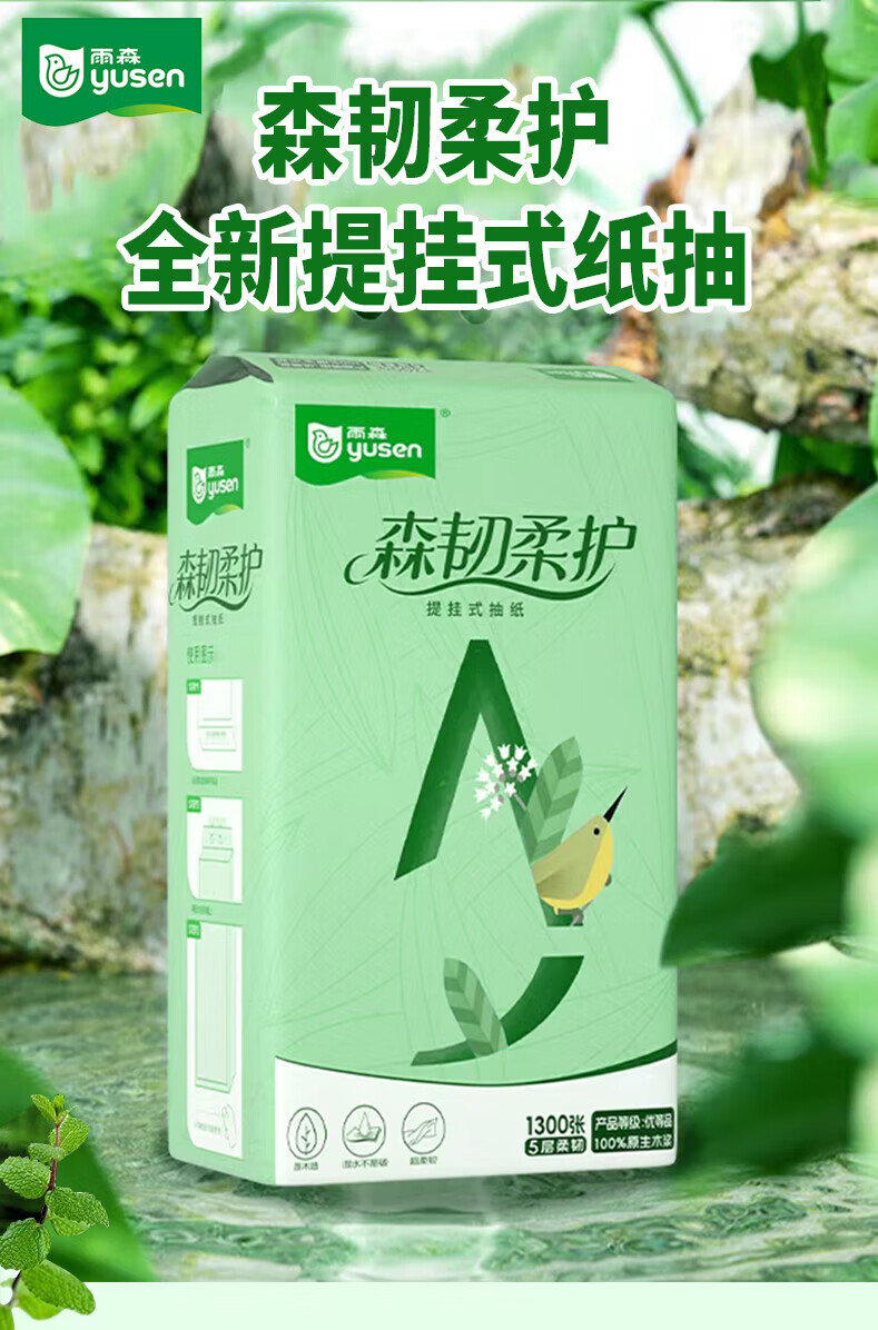 雨森(YUSEN)抽纸悬挂式纸巾卫生间厨房卫生纸大包湿水不易破纸抽 5层1300张 5层*260抽*5包