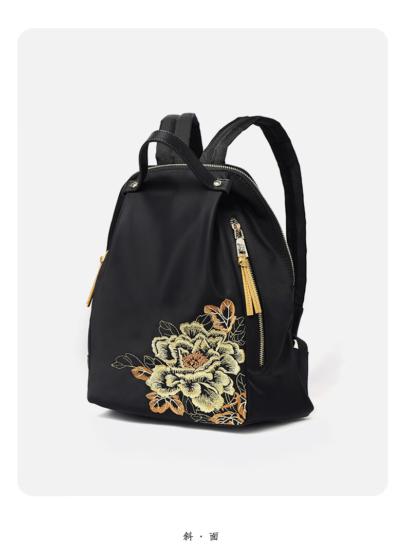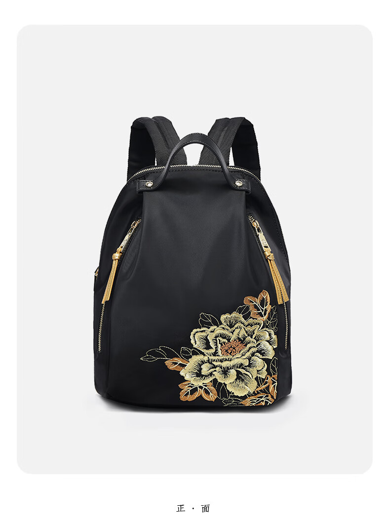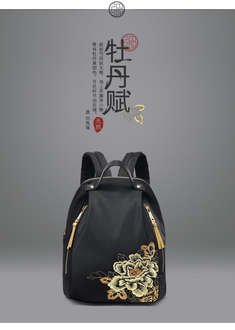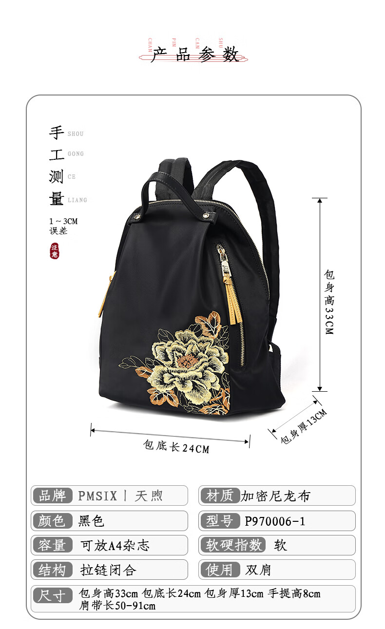 PmSix新中式牡丹绣花女包大容量双肩包中年妈妈包老年背包婆婆旅行布包 黑色-牡丹花刺绣-送礼品袋