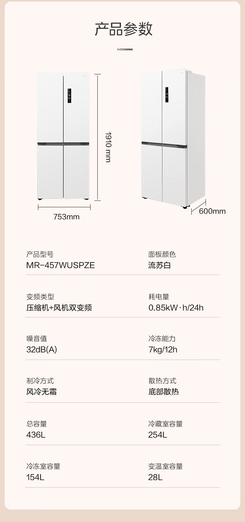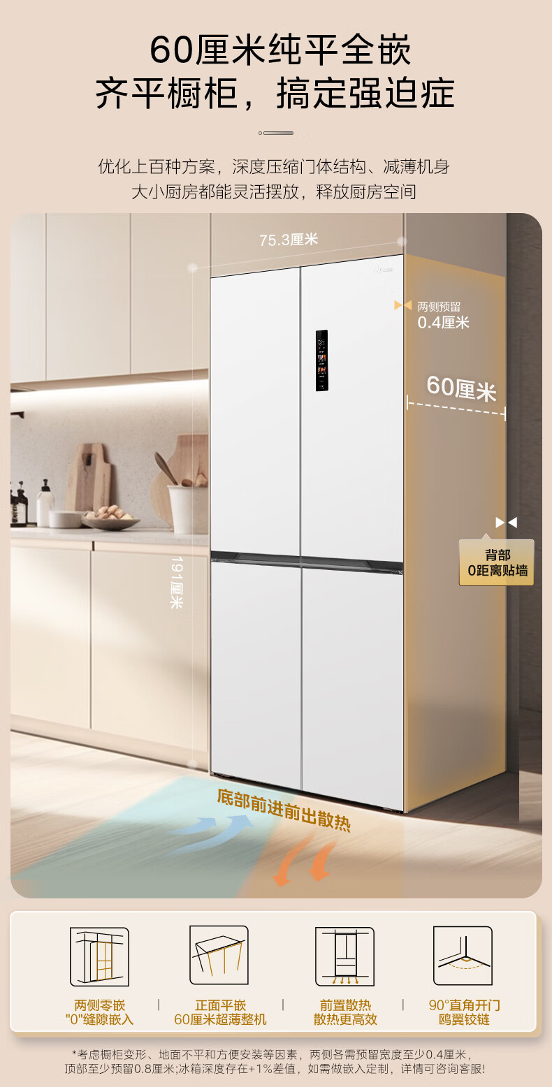 美的(Midea)436L十字门冰箱60厘米超薄零嵌入式全空间养鲜一级能效风冷无霜以旧换新白色MR-457WUSPZE国家补贴
