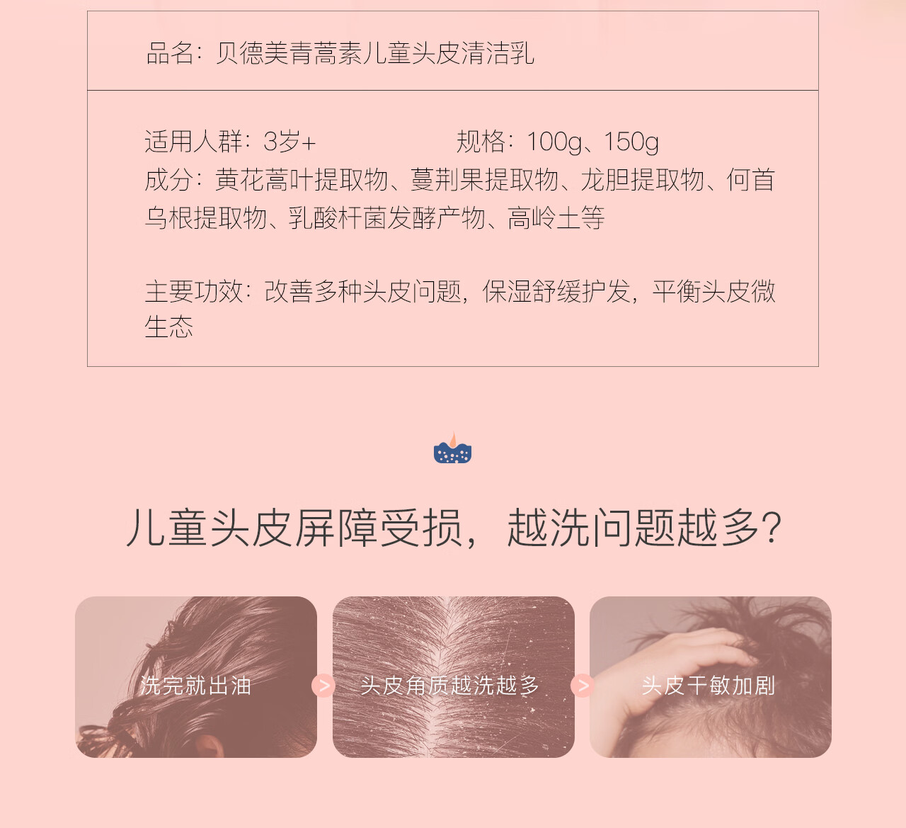 贝德美儿童头皮素控油去屑舒缓清洁乳中大童洗发水青蒿头皮精华100g