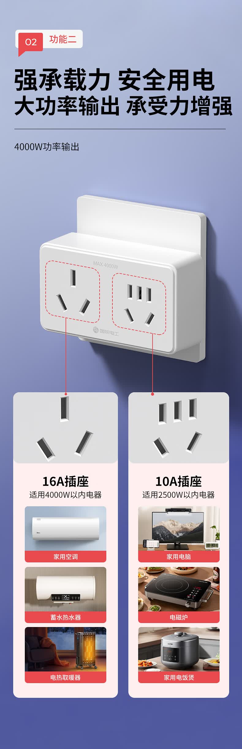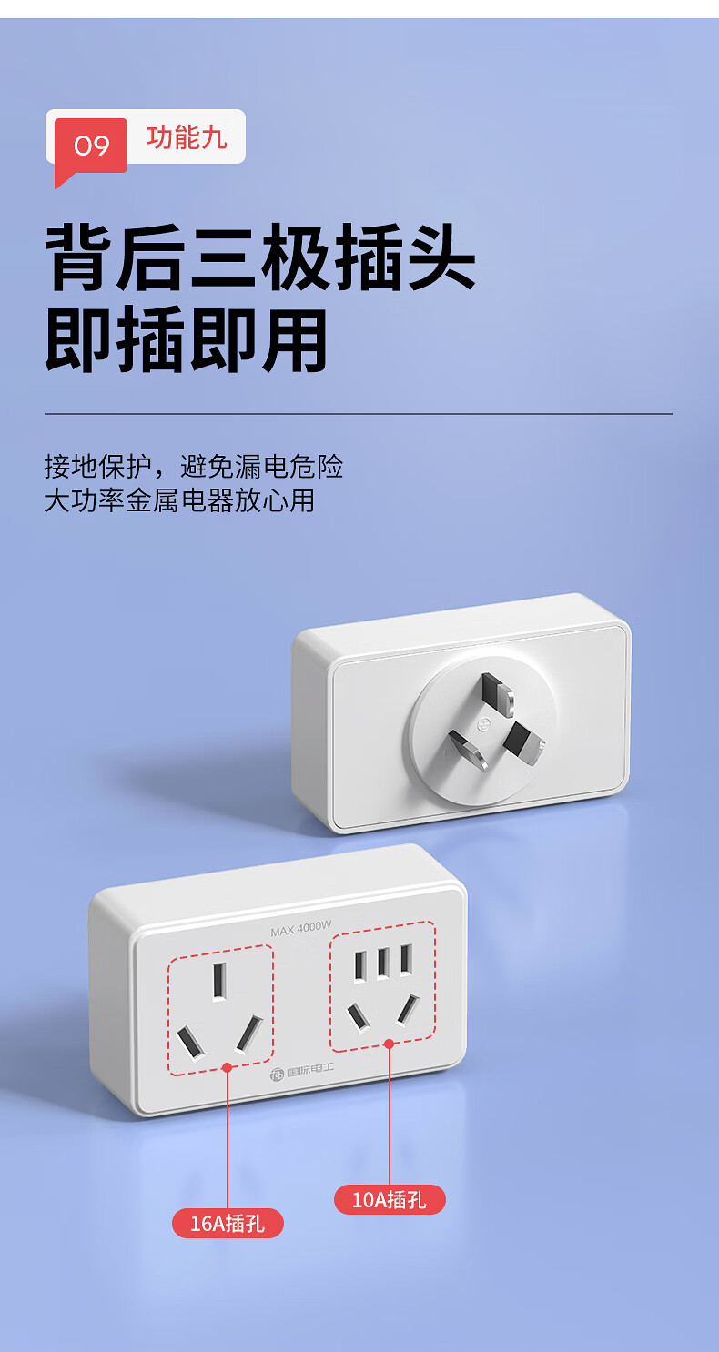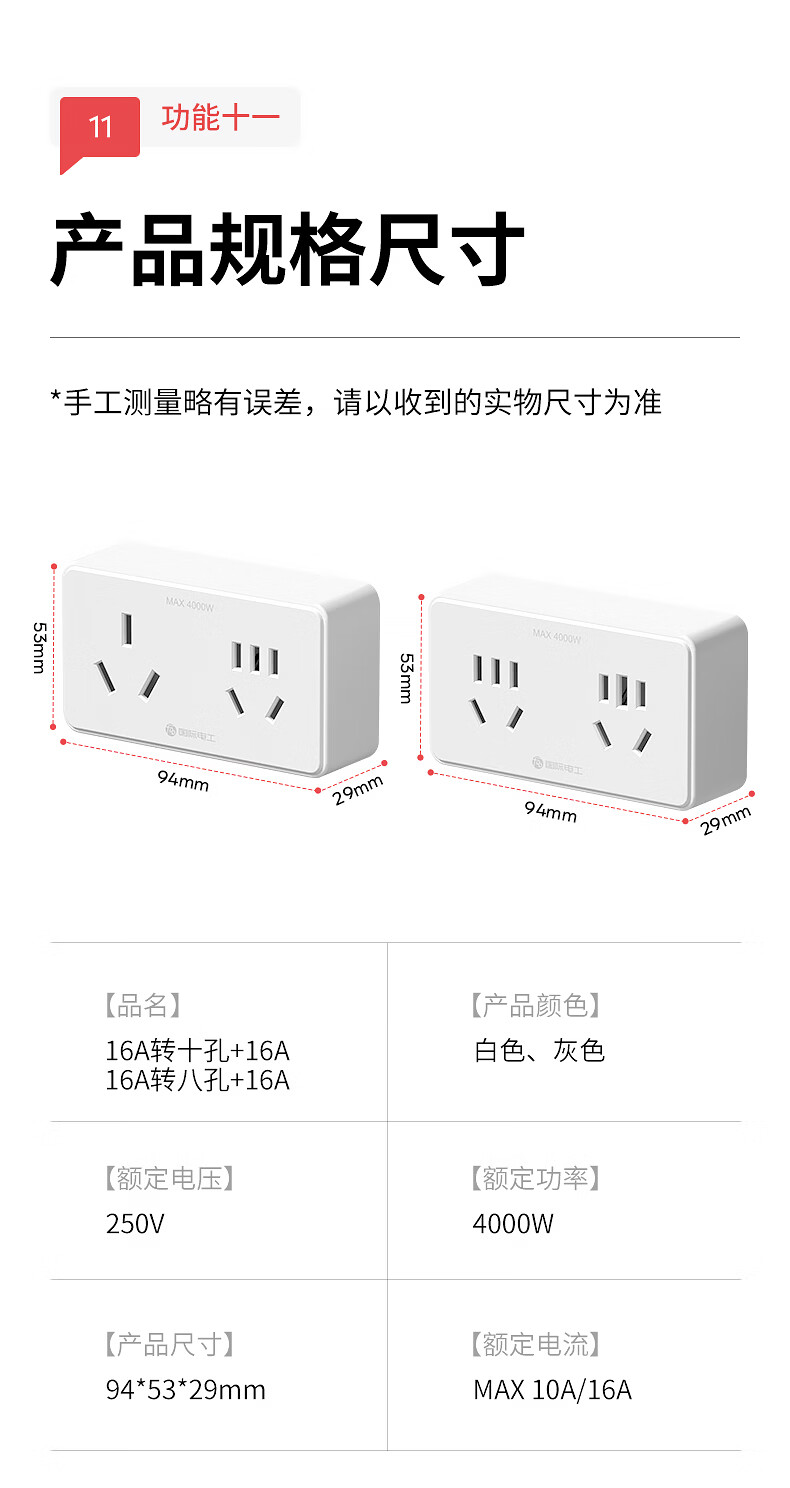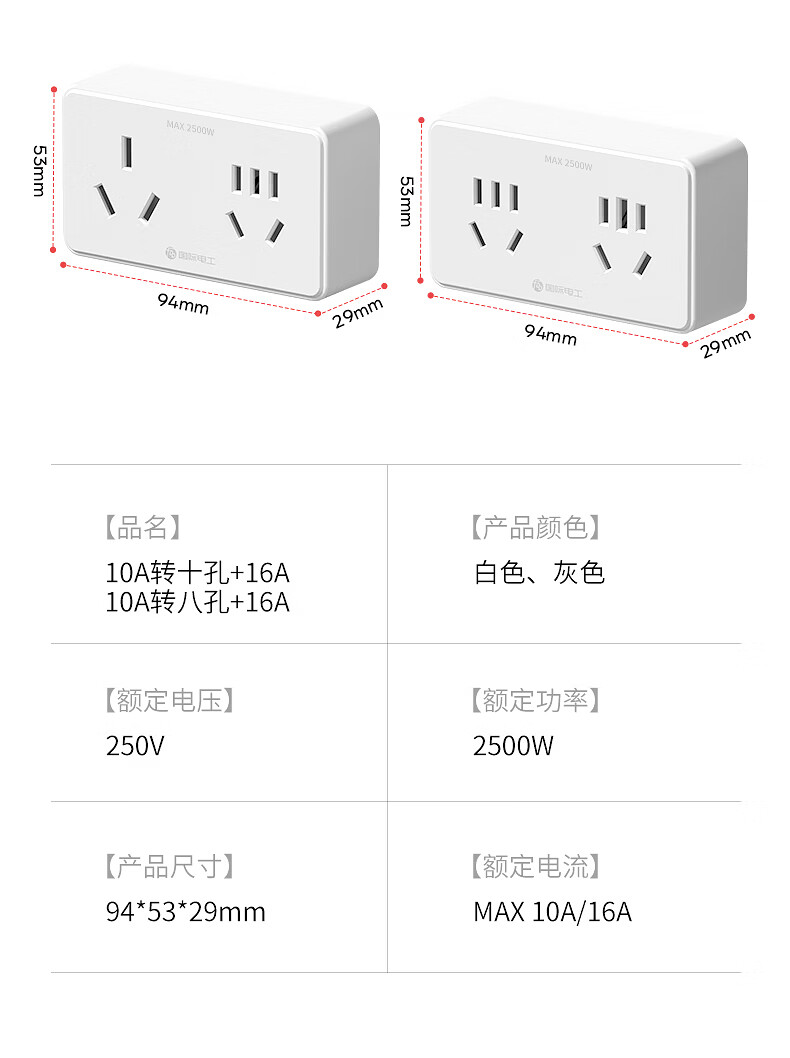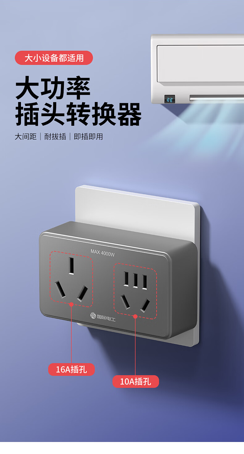 国际电工16A转10A插座转换器插头一转二空调专用大三孔扩展插板插排转换头 白色10A转16A三孔+10A五孔【2500W】