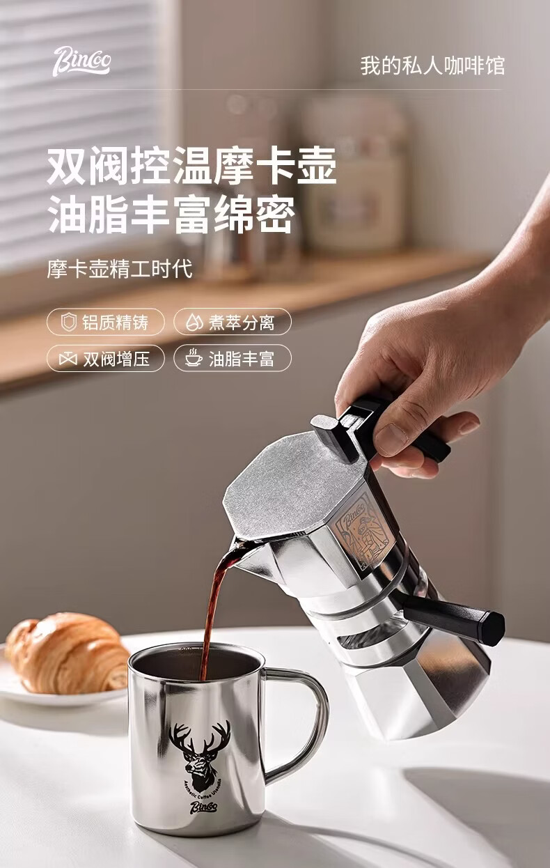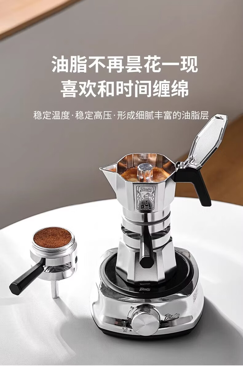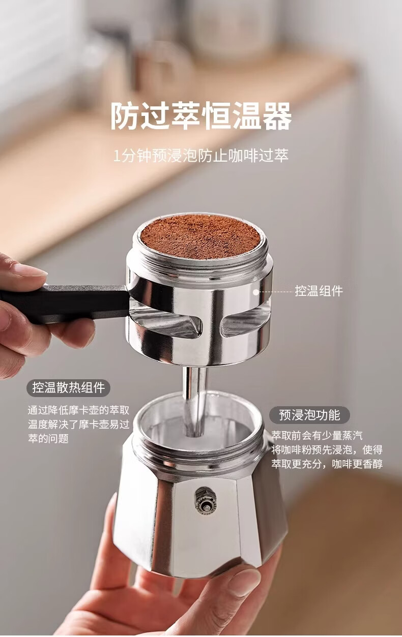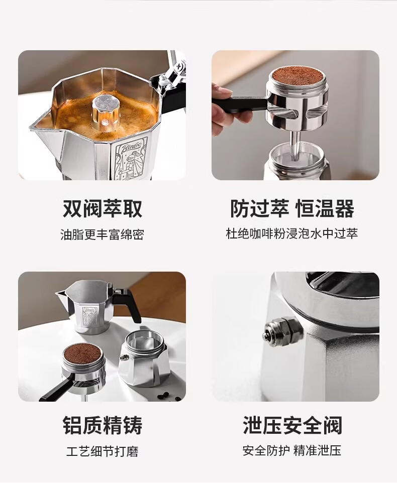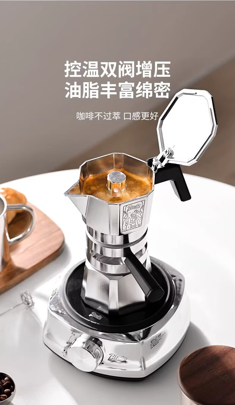 Bincoo恒温双阀摩卡壶煮咖啡壶意式浓缩家用户外露营咖啡机套装 银色120ml+布粉器+滤纸100张 双阀
