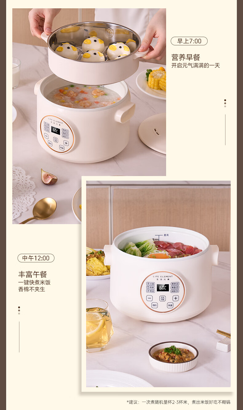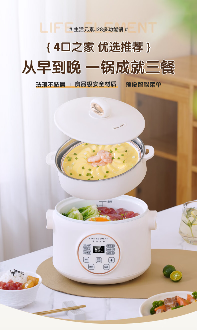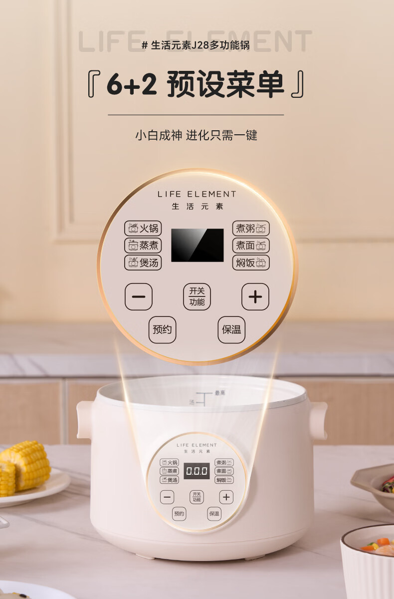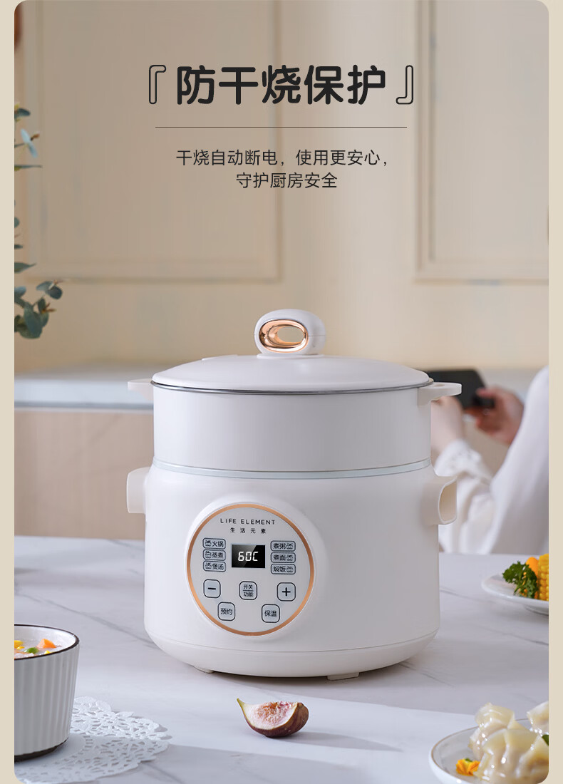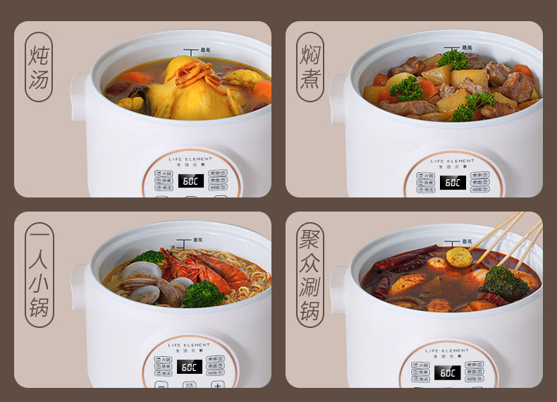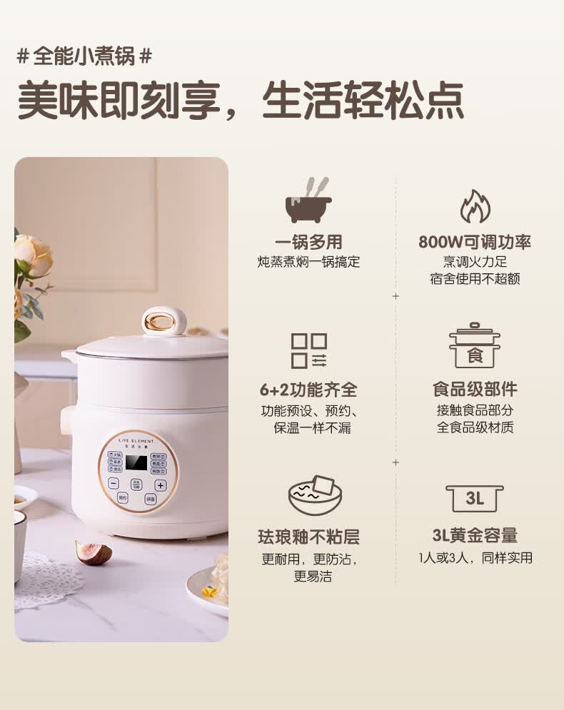 生活元素(LIFE ELEMENT)多功能锅 可涮/煮/炖 6大功能触控 定时/预约 800W大功率 3L容量 适合2-4人 小煮锅电饭煲-J28