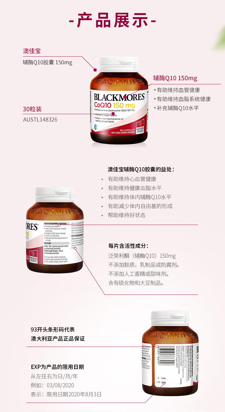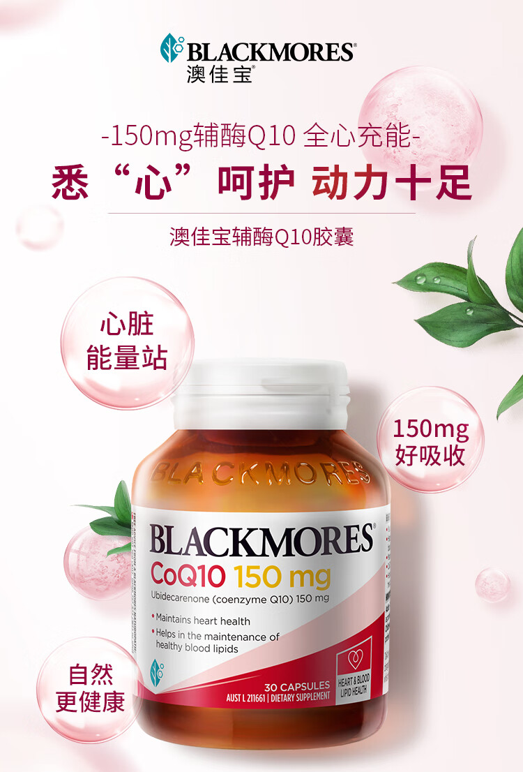 澳佳宝(Blackmores)150mg辅酶q10软胶囊高脂溶性易吸收澳洲进口送长辈保护心脏90粒