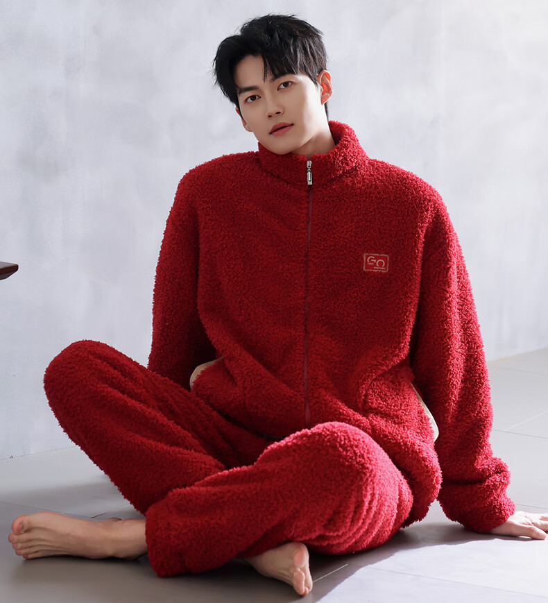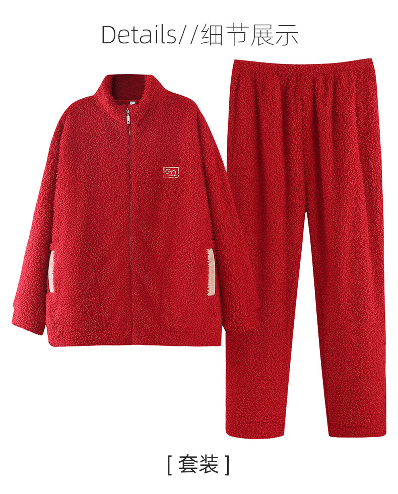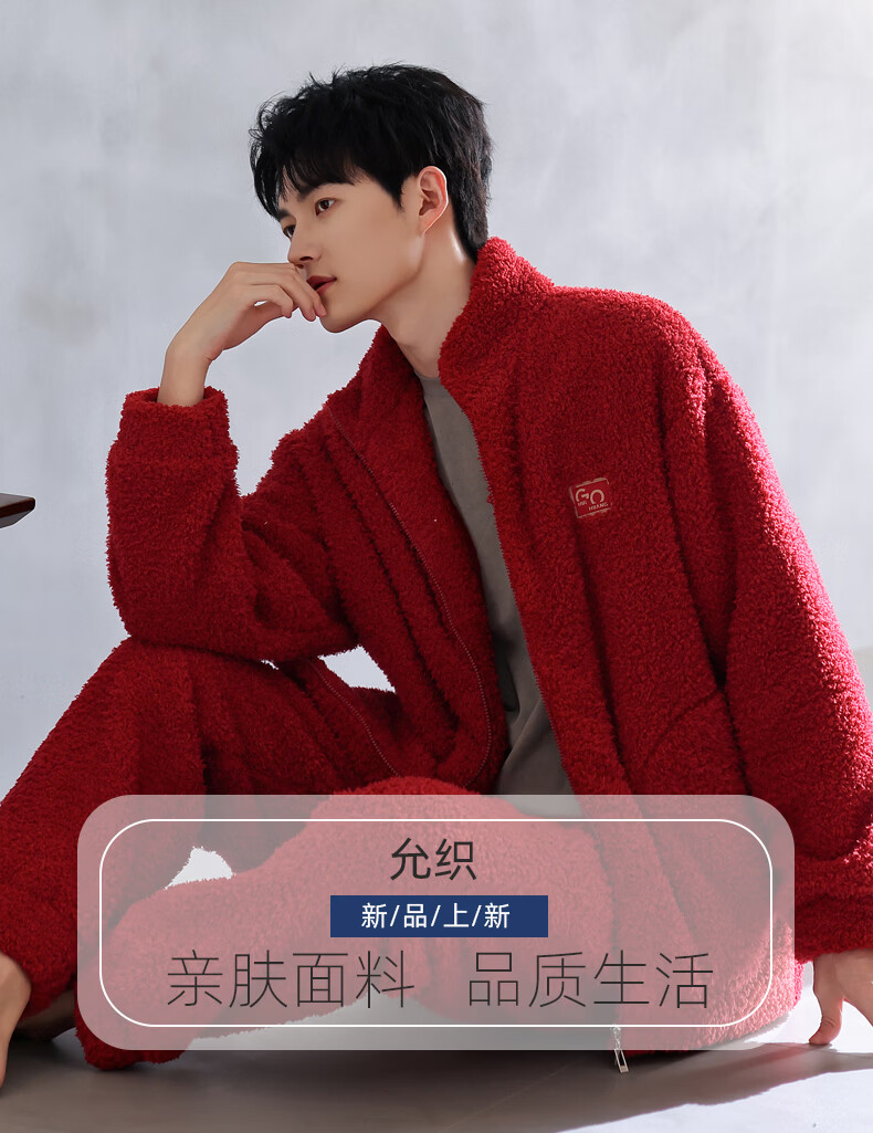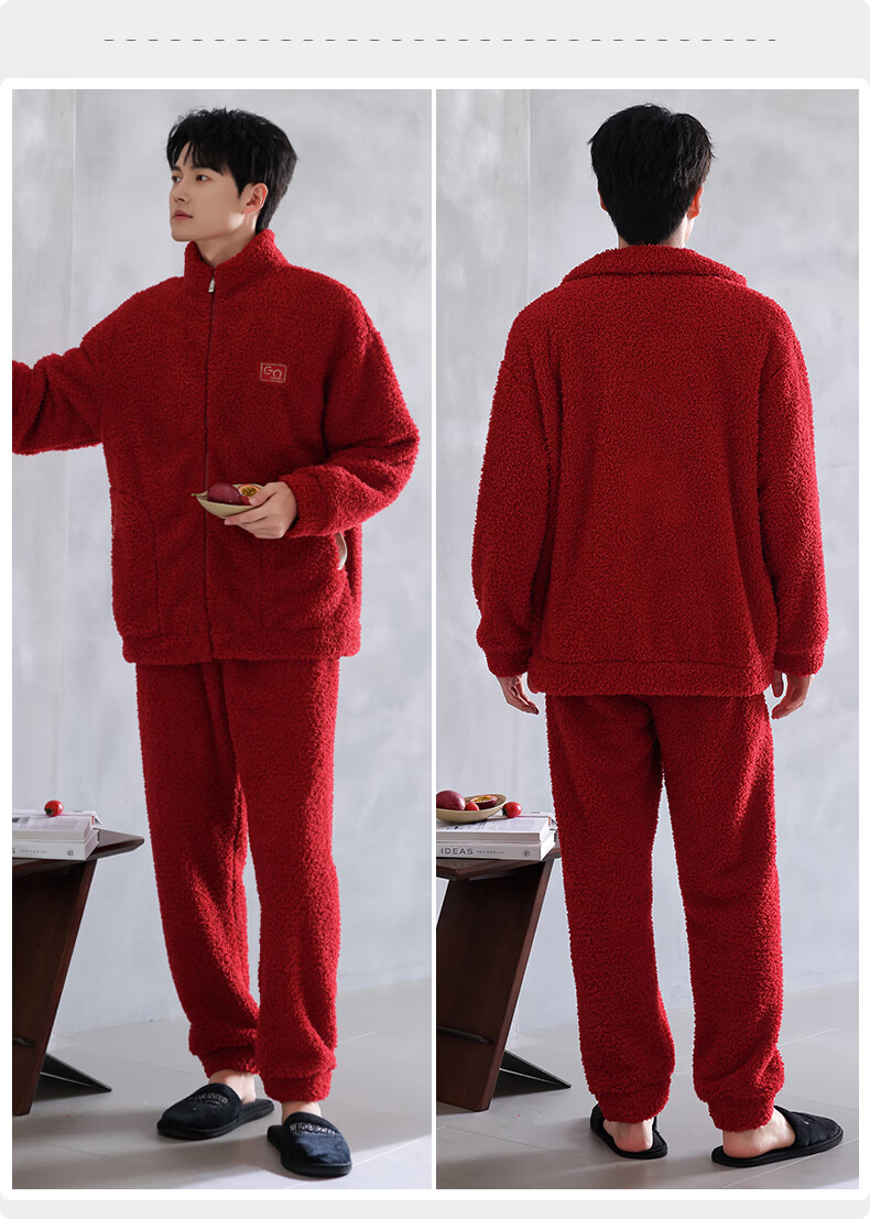 允织半边绒睡衣男士冬季加厚加绒秋冬款拉链高级感冬天家居服保暖套装 9061-枣红 M (165) :建议100-120斤穿着