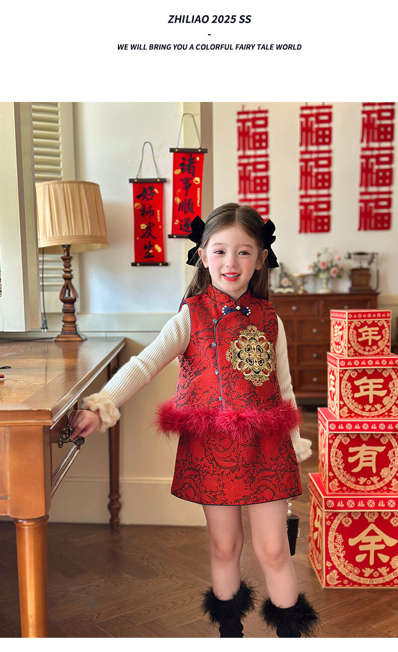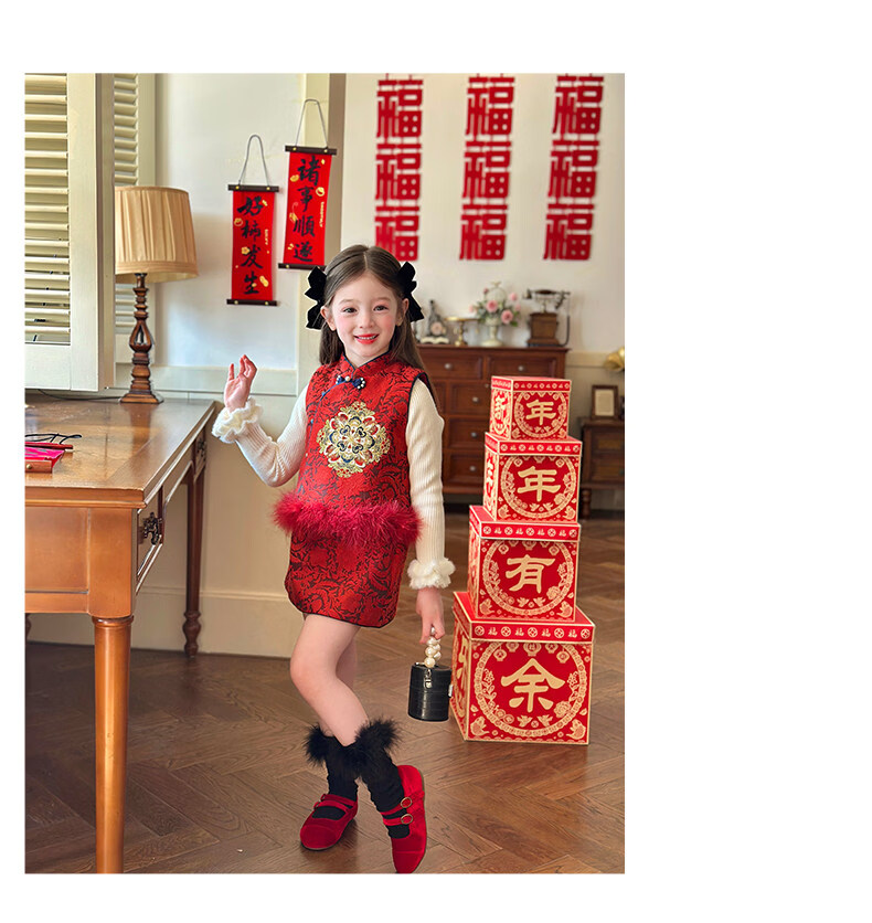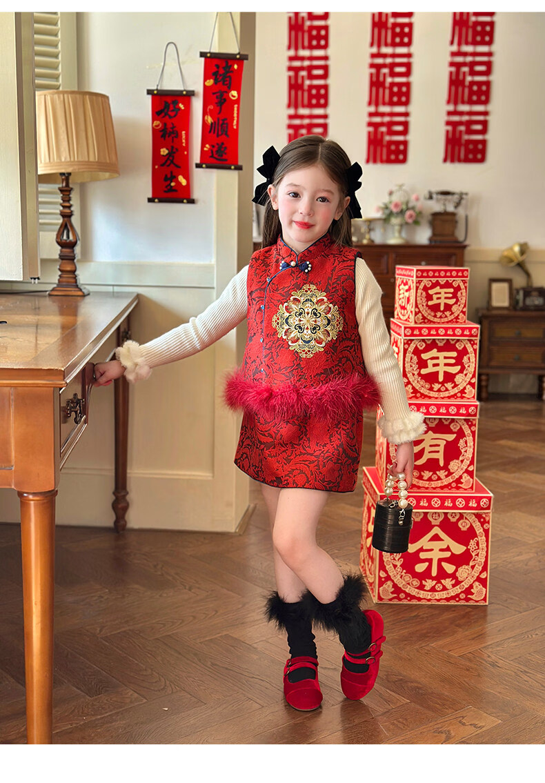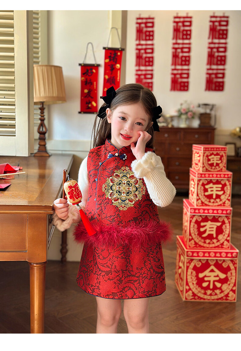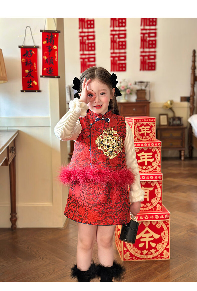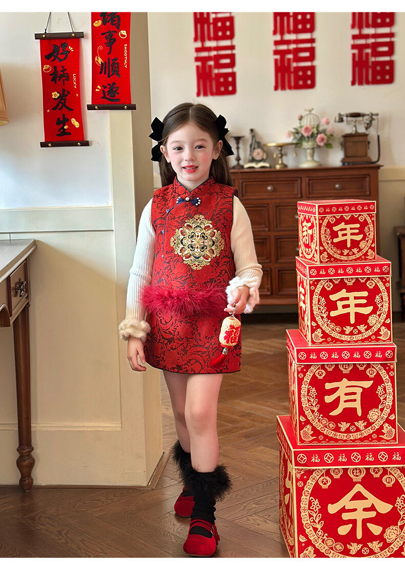 栀了成长记童装女童红色国风套装2025冬季儿童新年夹棉马甲两件套 红色 套装 100 cm