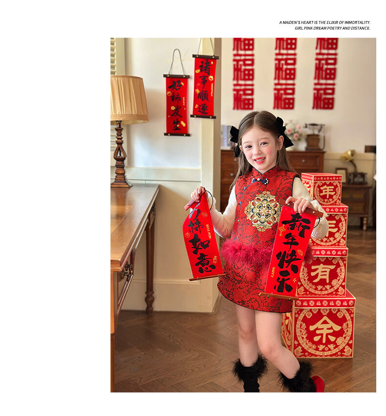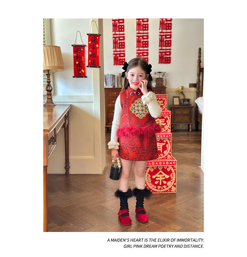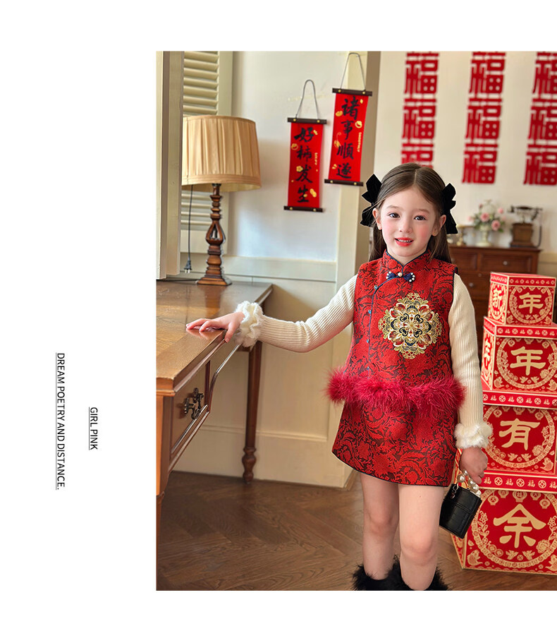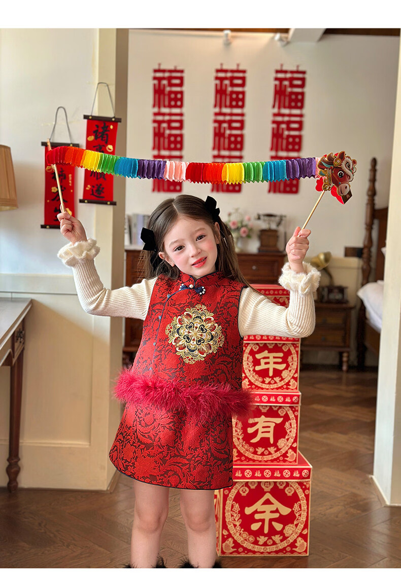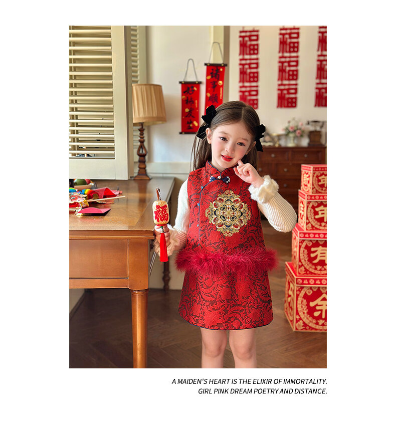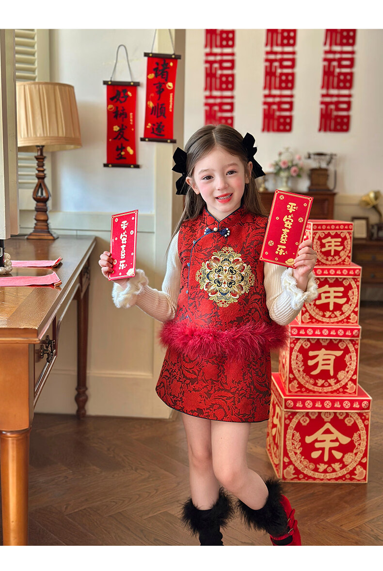 栀了成长记童装女童红色国风套装2025冬季儿童新年夹棉马甲两件套 红色 套装 100 cm