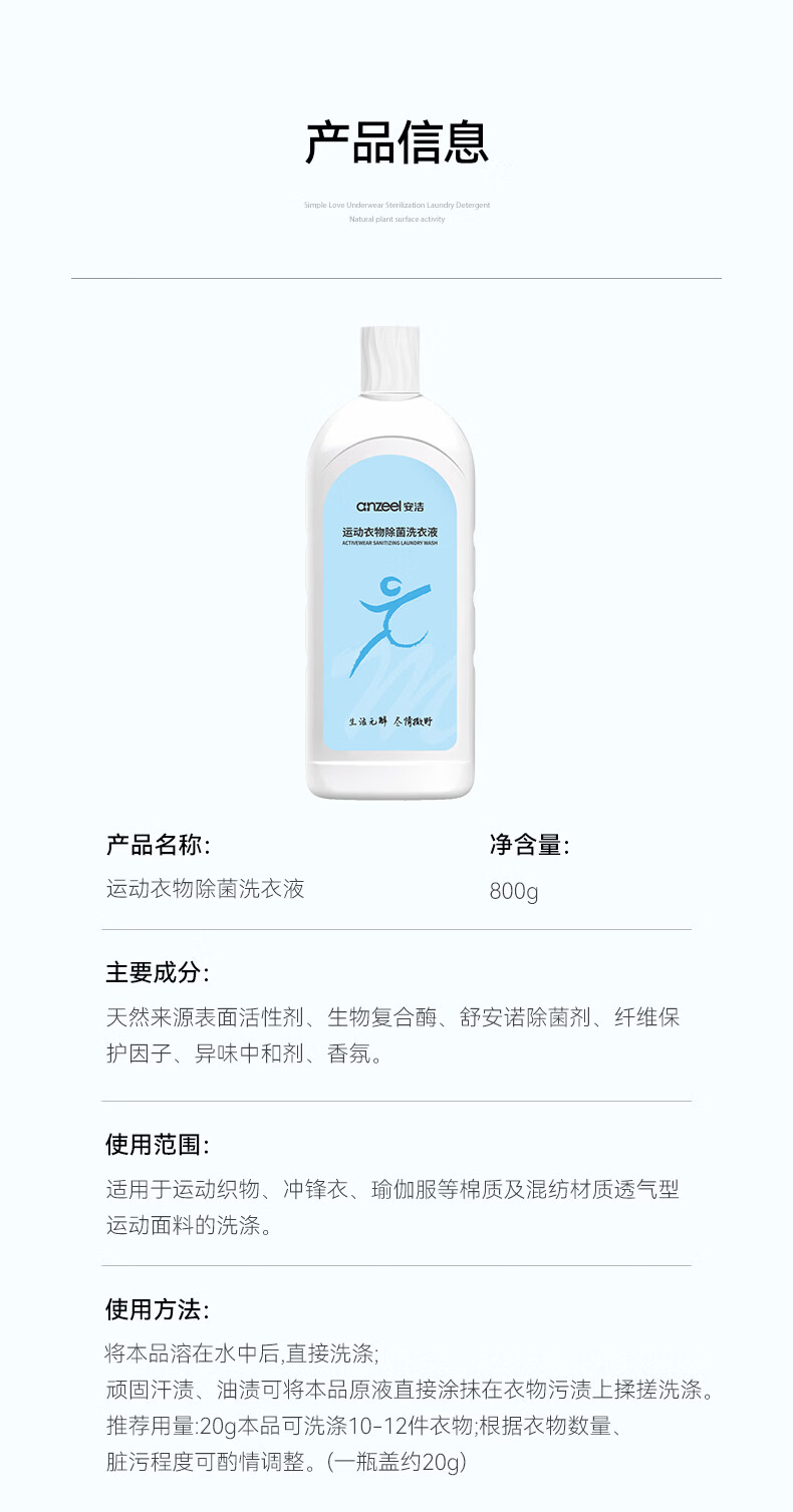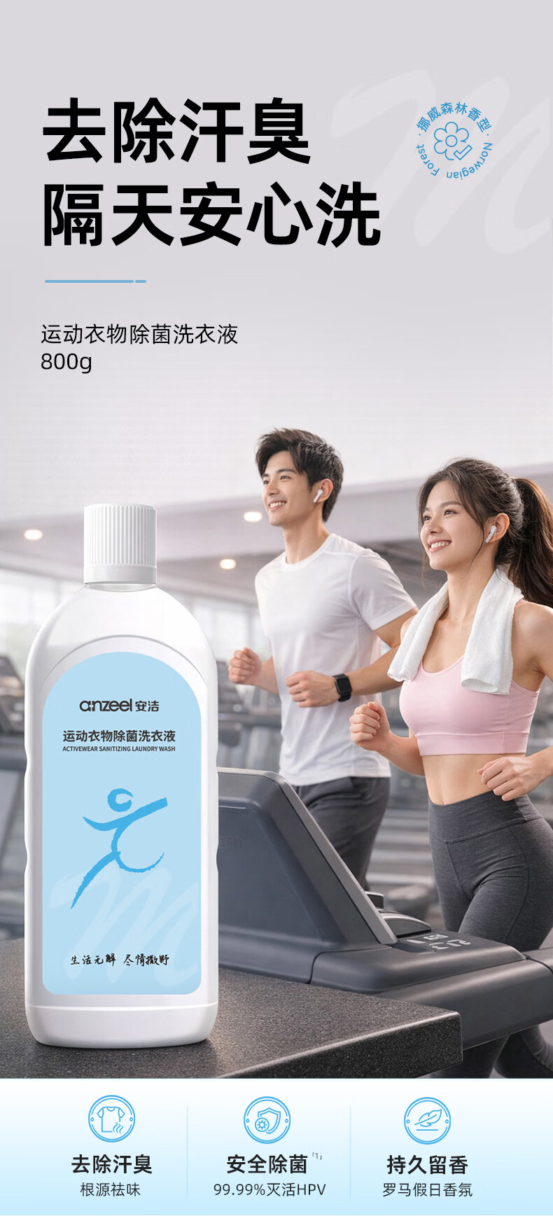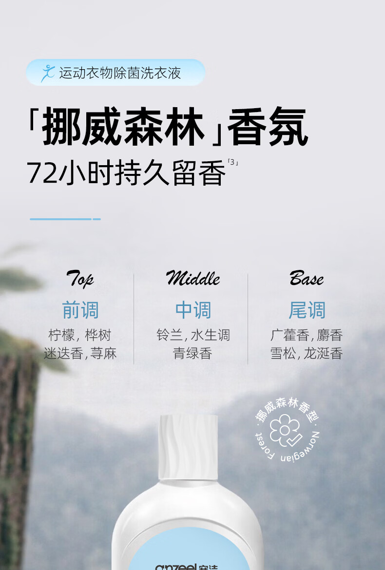安洁(Anzeel)运动衣物除菌洗衣液800g 根源除味去除汗臭HPV 隔天安心洗 挪威森林香型