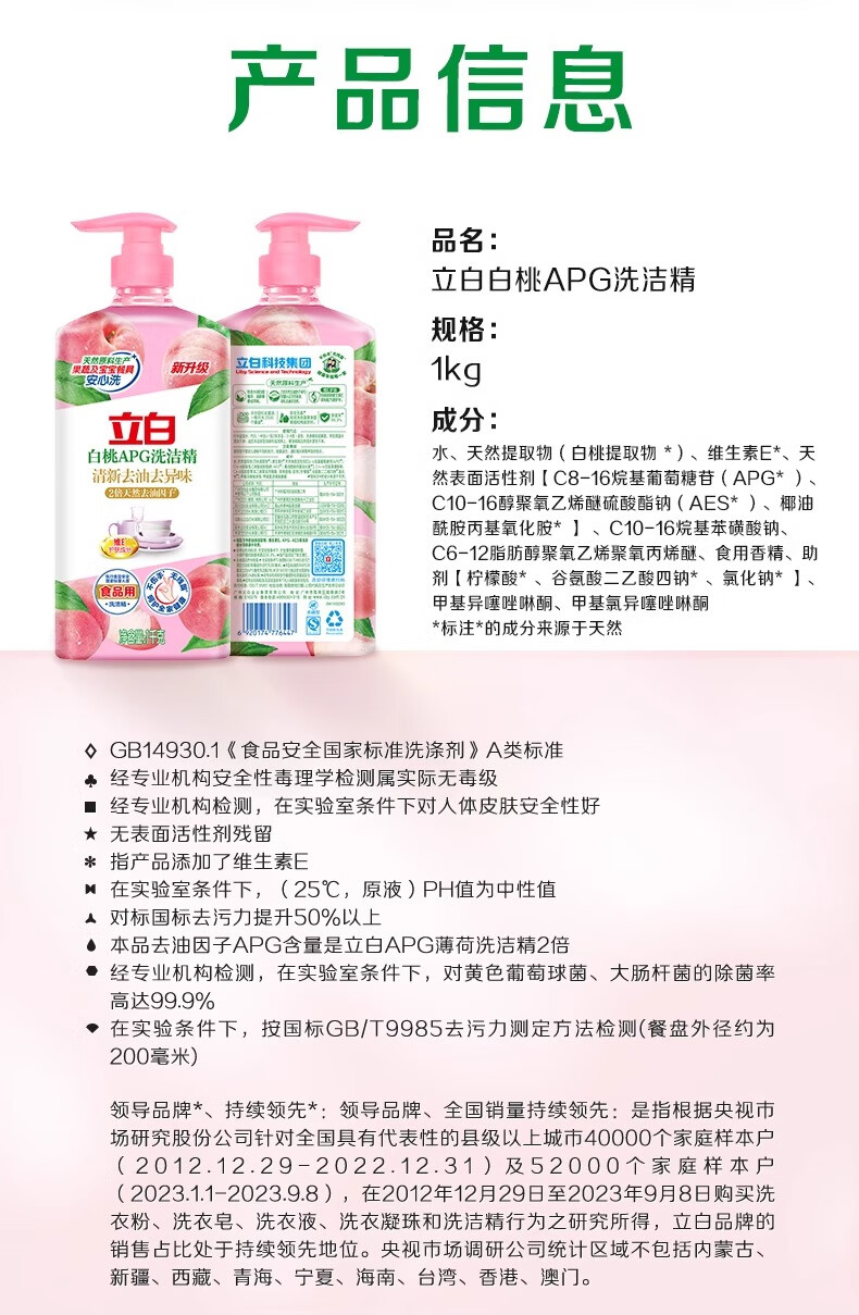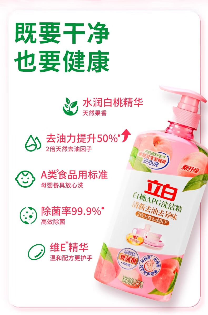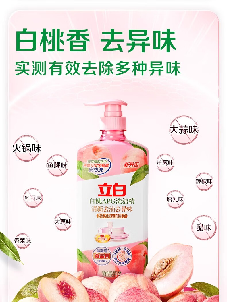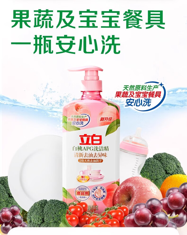 立白白桃洗洁精APG有效去油果蔬餐具清洁温和不伤手食品用家用 2瓶*1kg