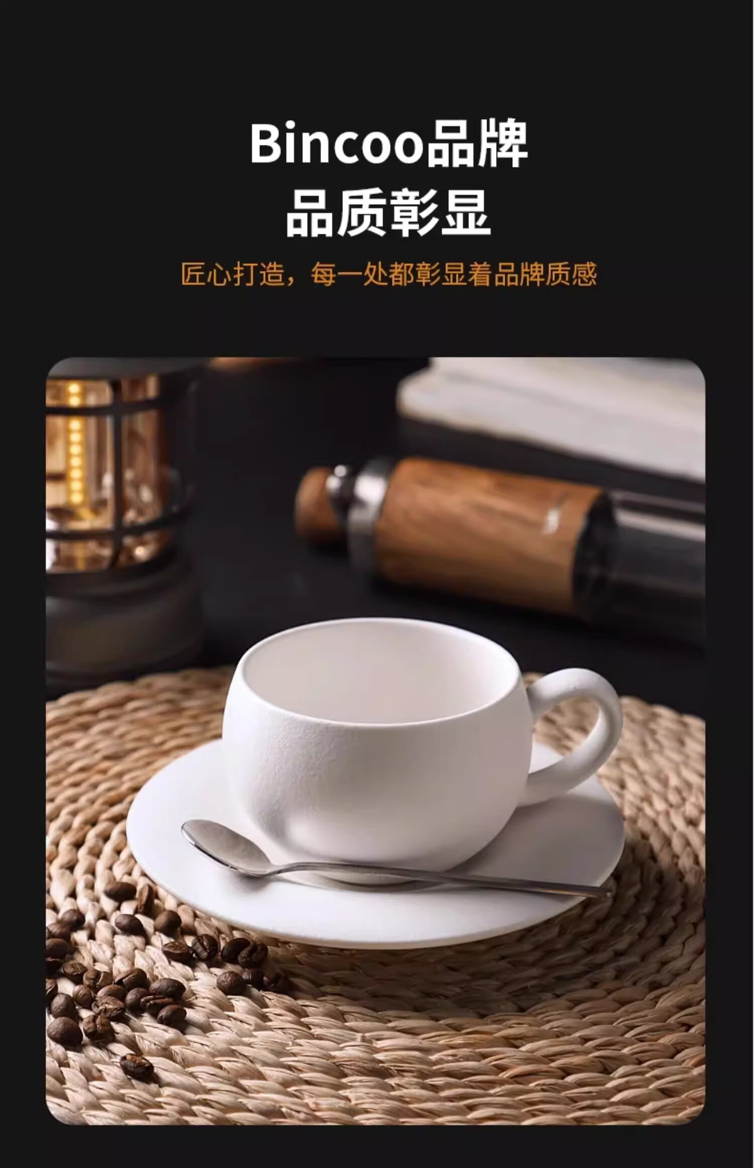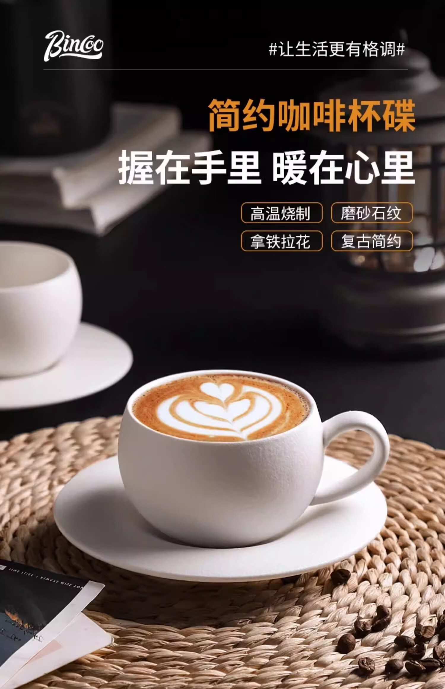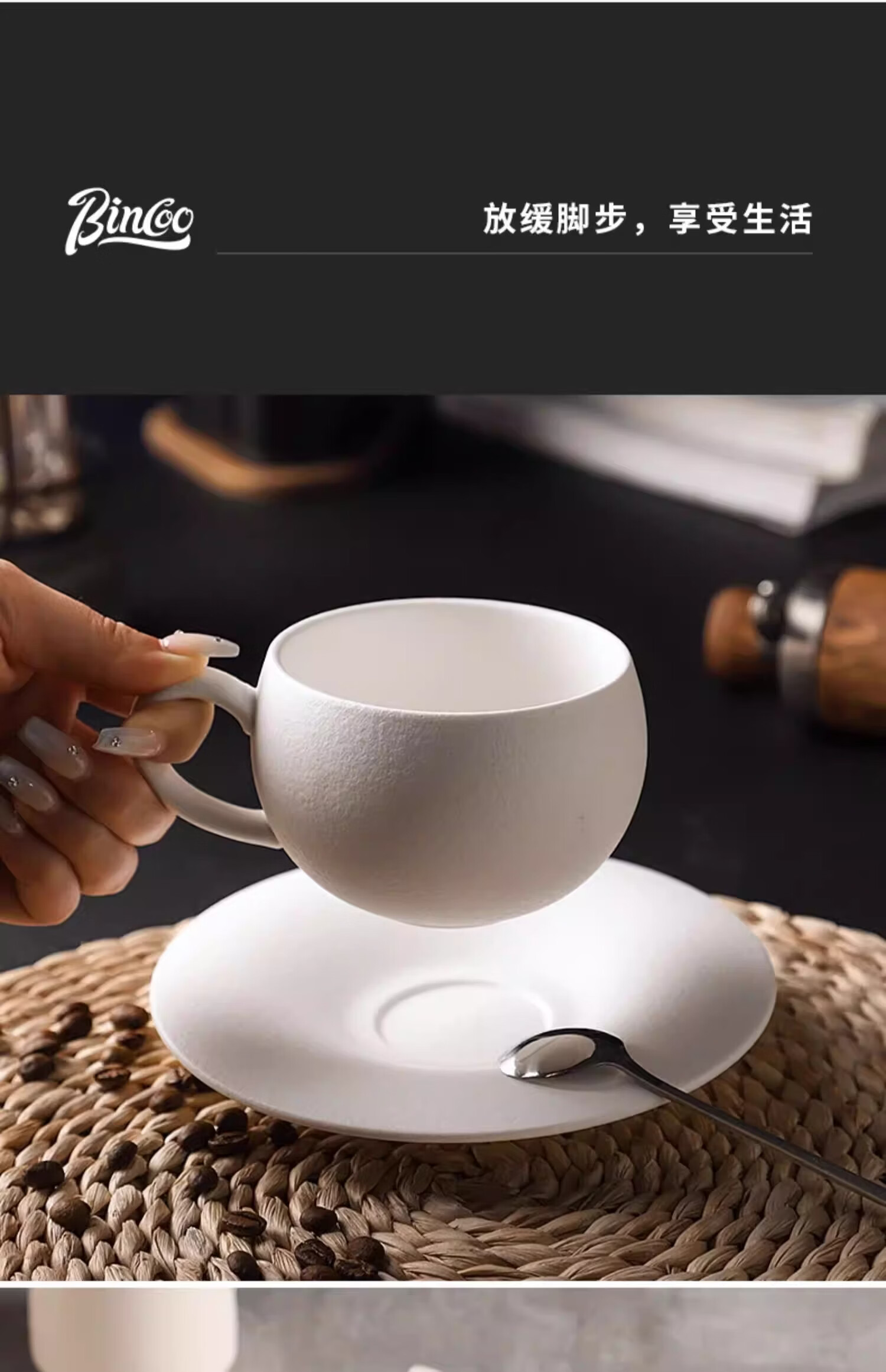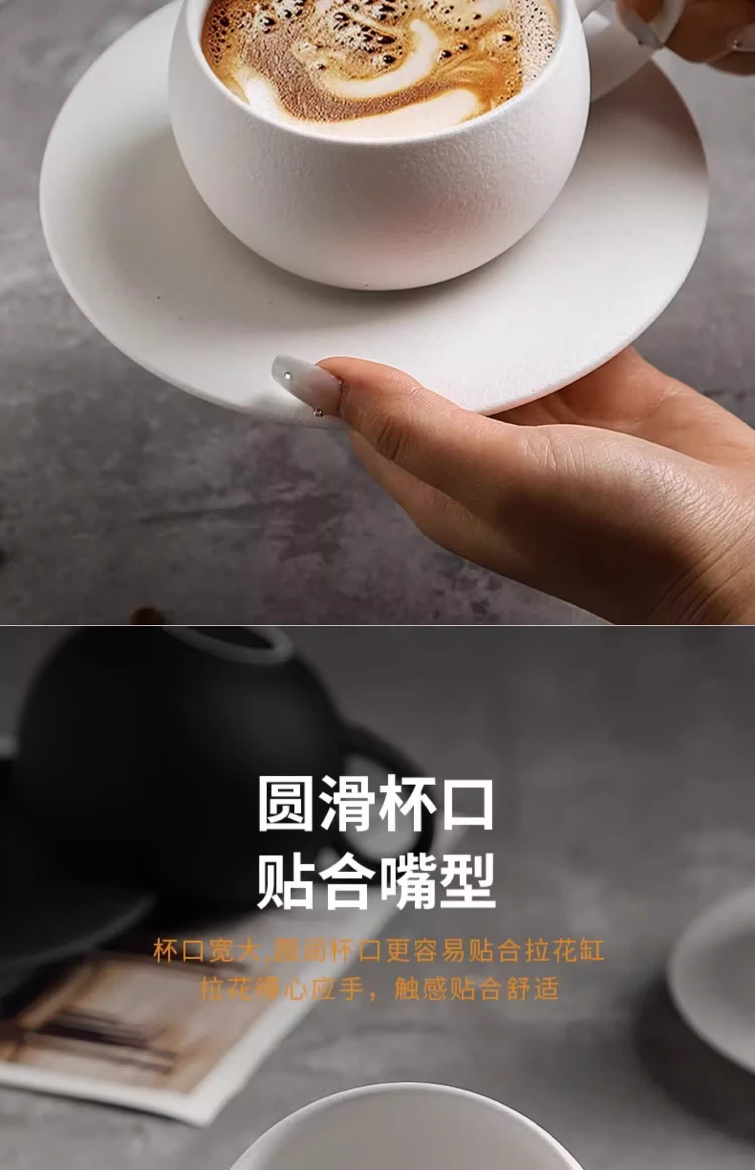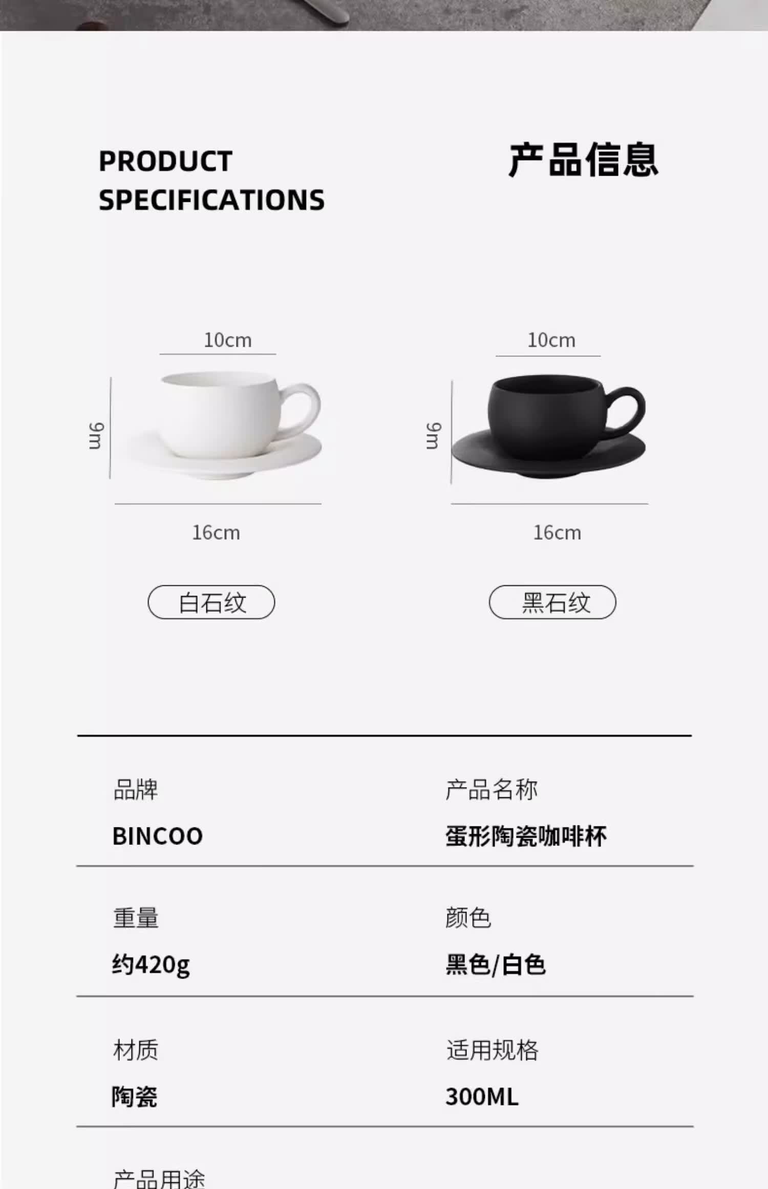 Bincoo陶瓷咖啡杯子设计感蛋形拿铁拉花专用杯精致下午茶杯碟套装 白色石纹-280ml