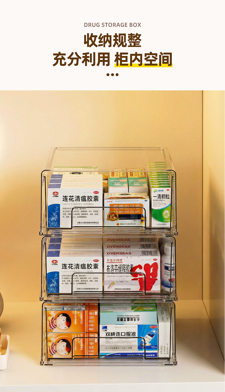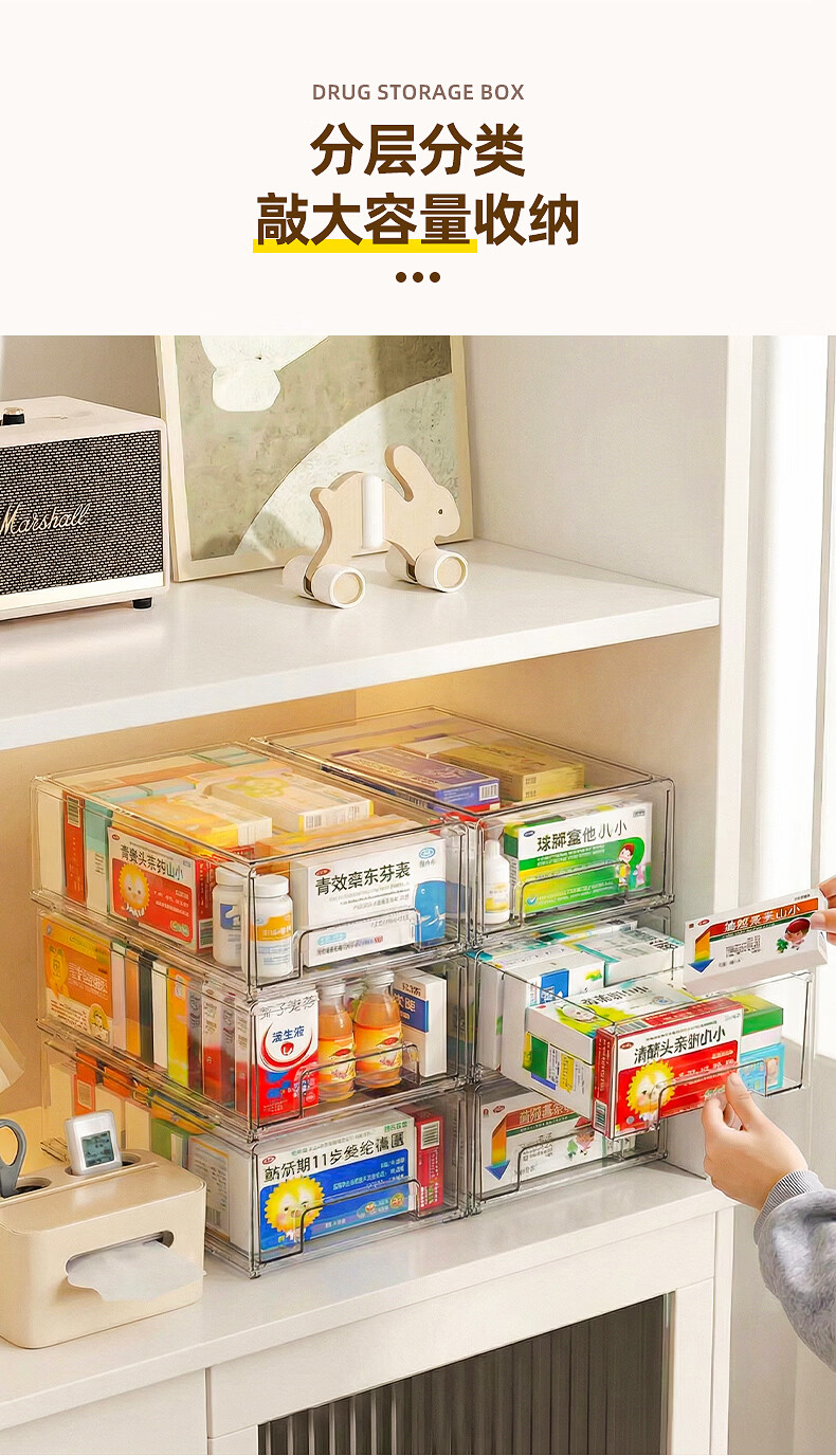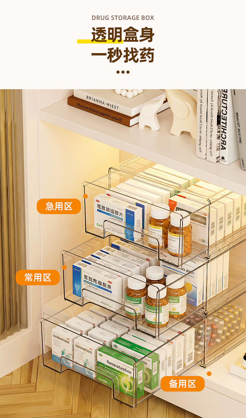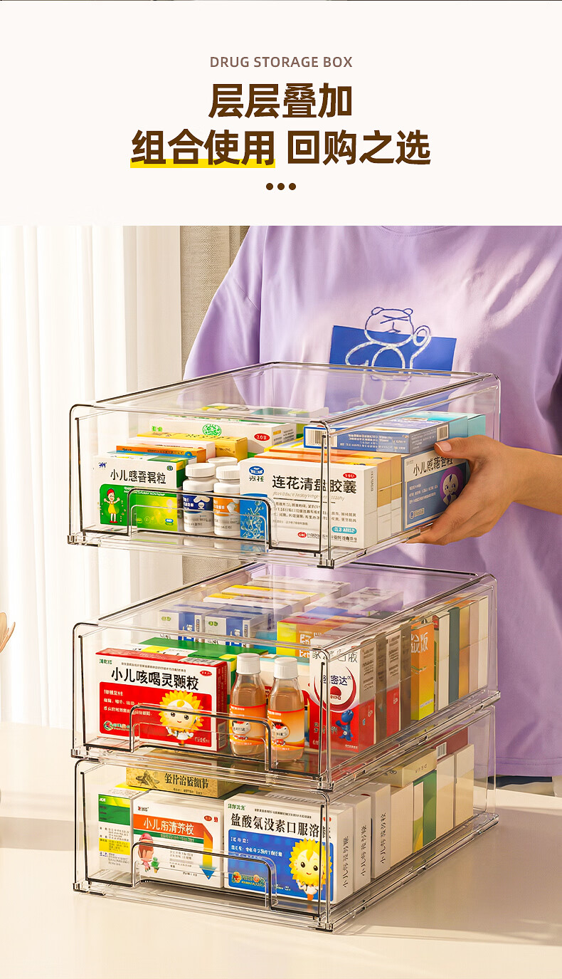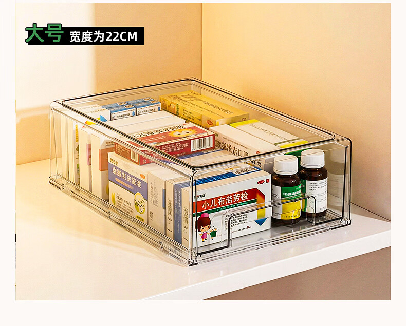 稻草熊药品抽屉式收纳盒透明桌面杂物收纳盒小物件塑料容器可叠加医药箱 透明大号【3个装】