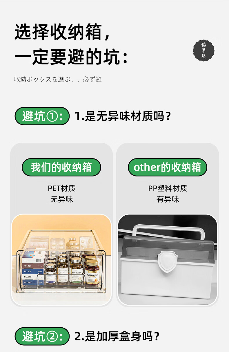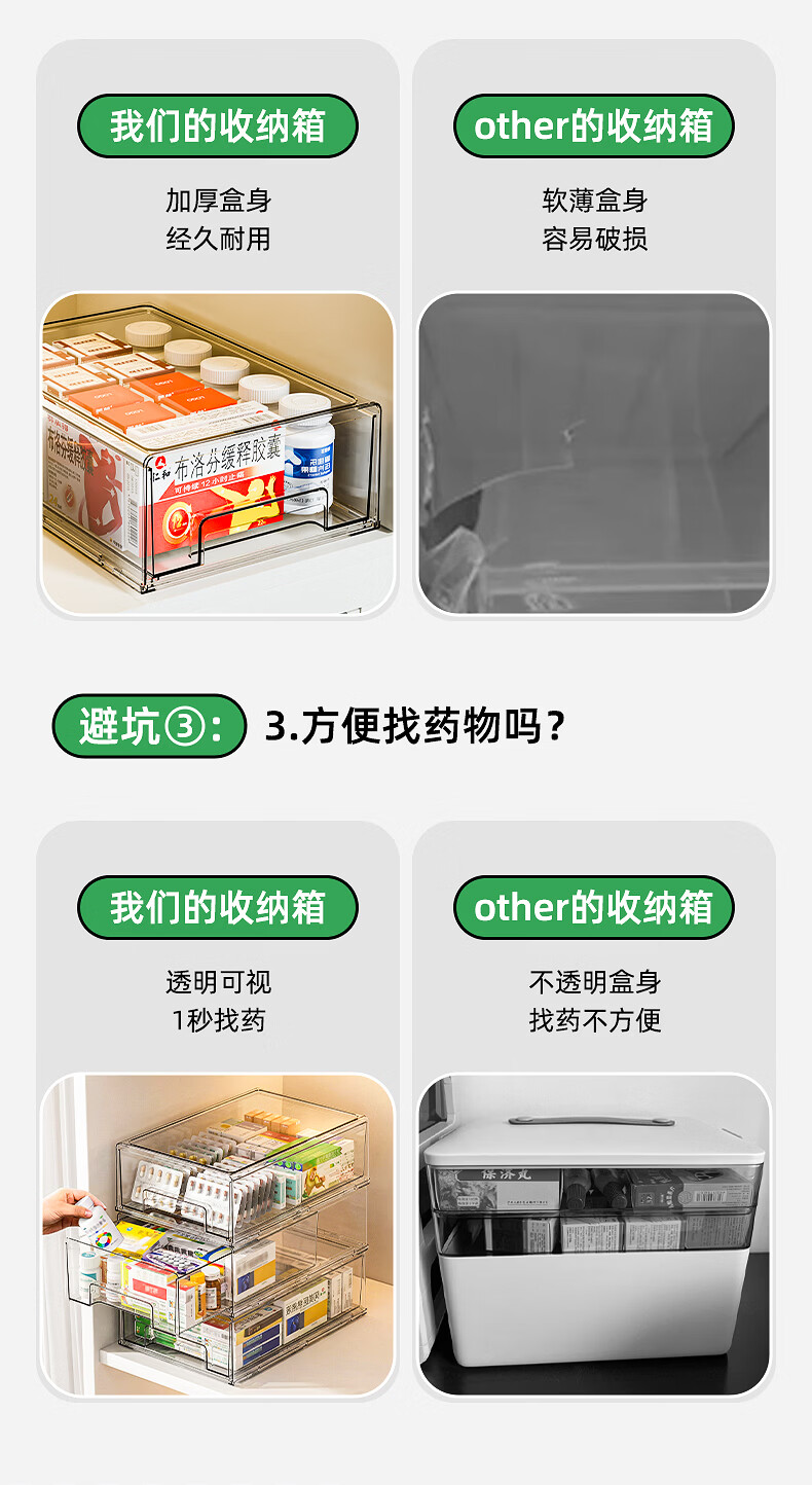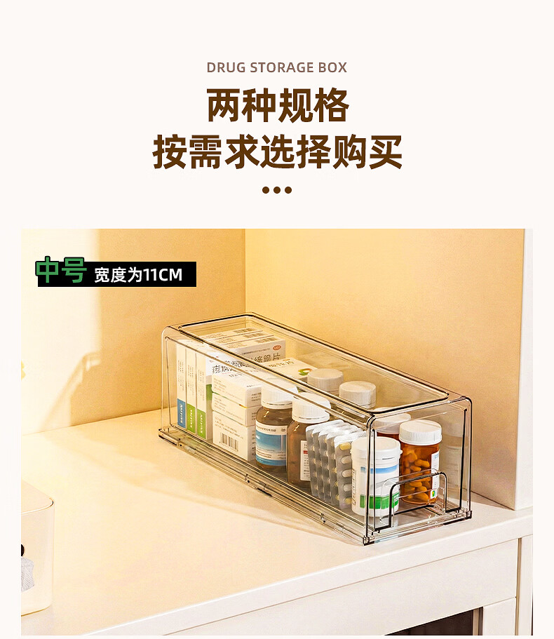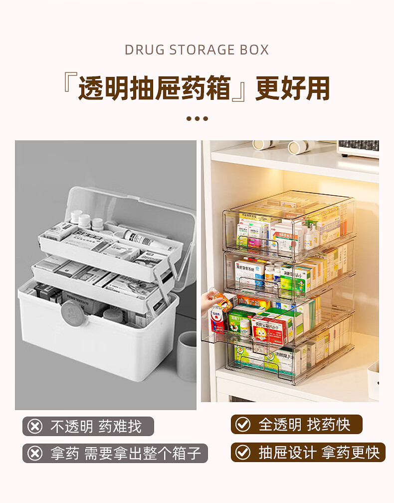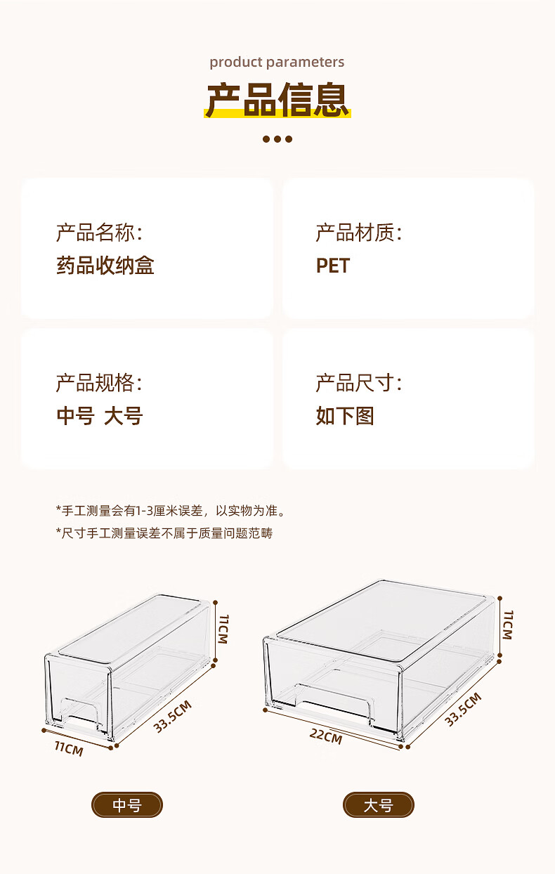 稻草熊药品抽屉式收纳盒透明桌面杂物收纳盒小物件塑料容器可叠加医药箱 透明大号【3个装】