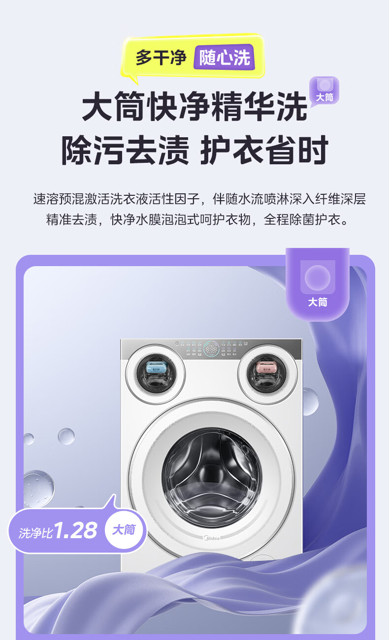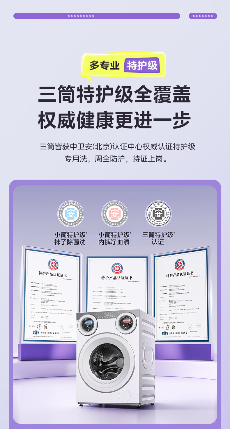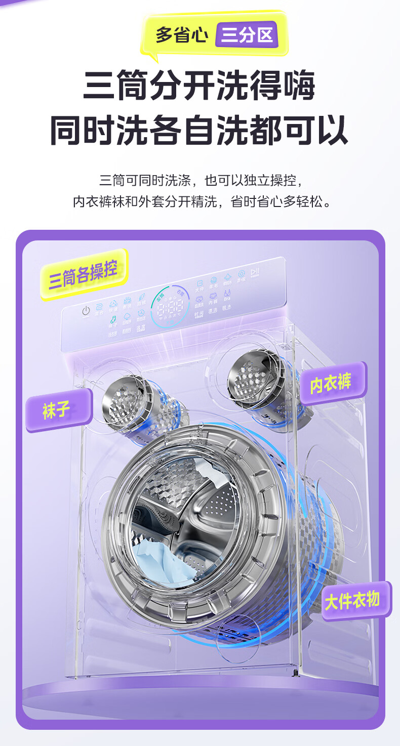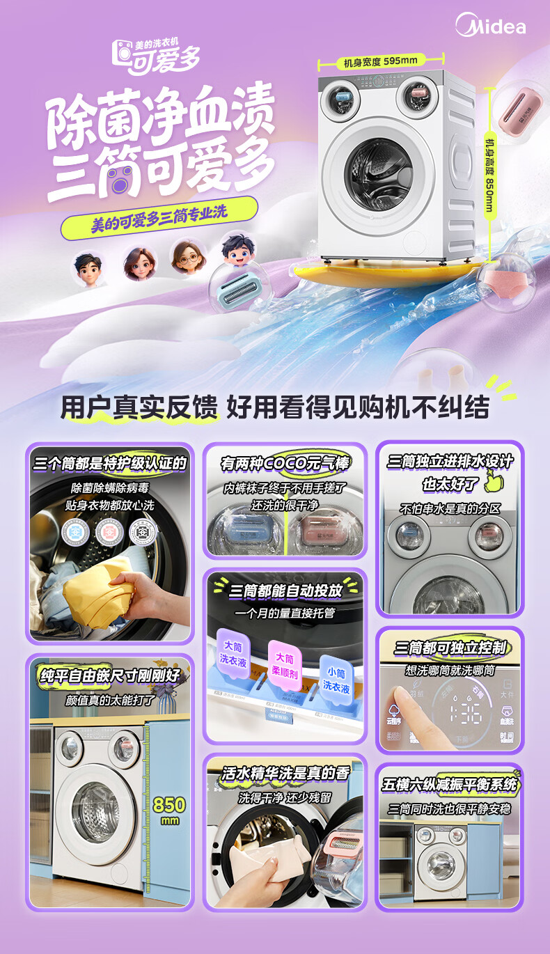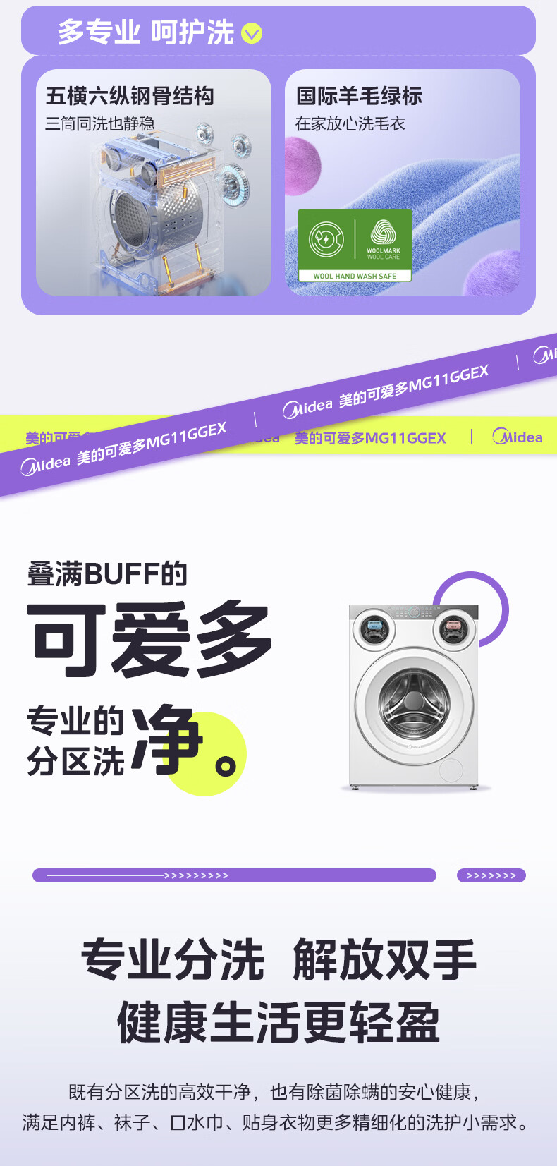 美的(Midea)可爱多滚筒全自动洗衣机分区洗三筒一体机 11kg多筒母婴儿洗智能投放变频 除菌除螨羊毛绿标三桶 MG11GGEX 滚筒