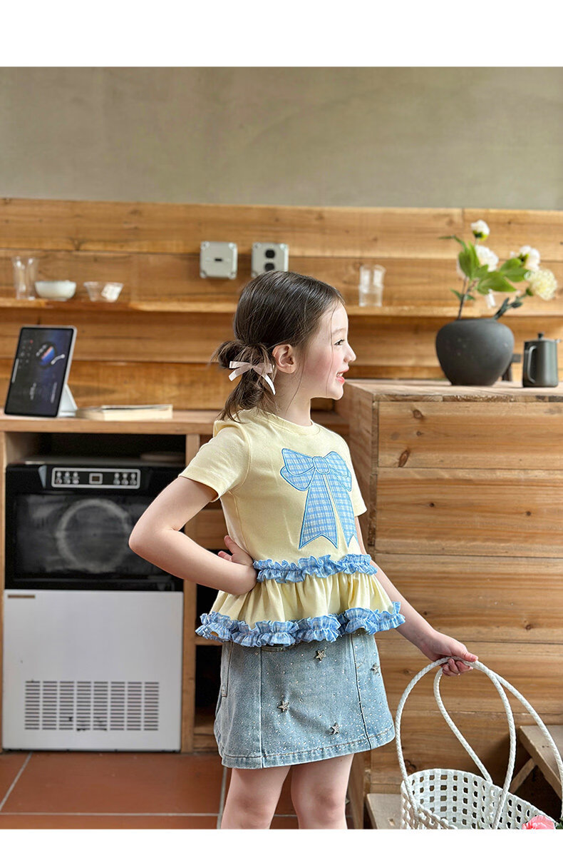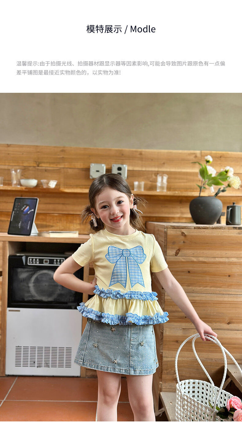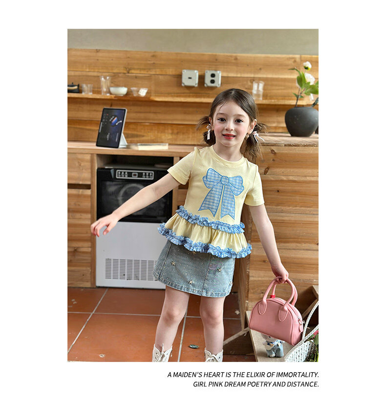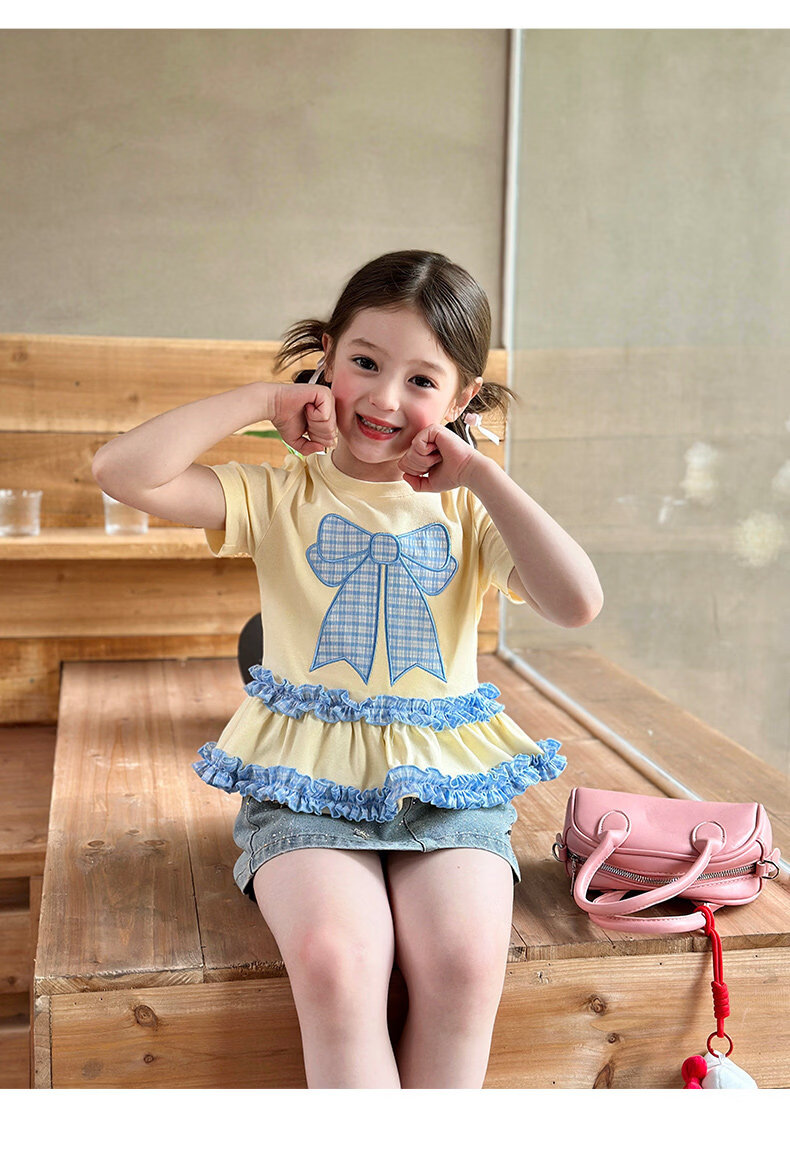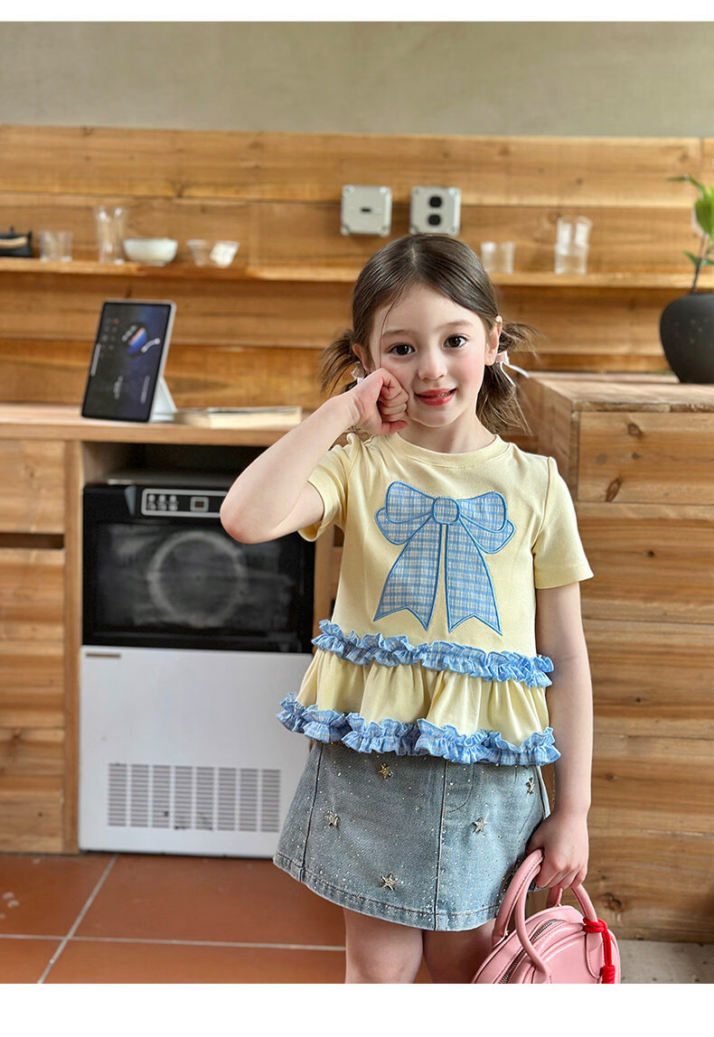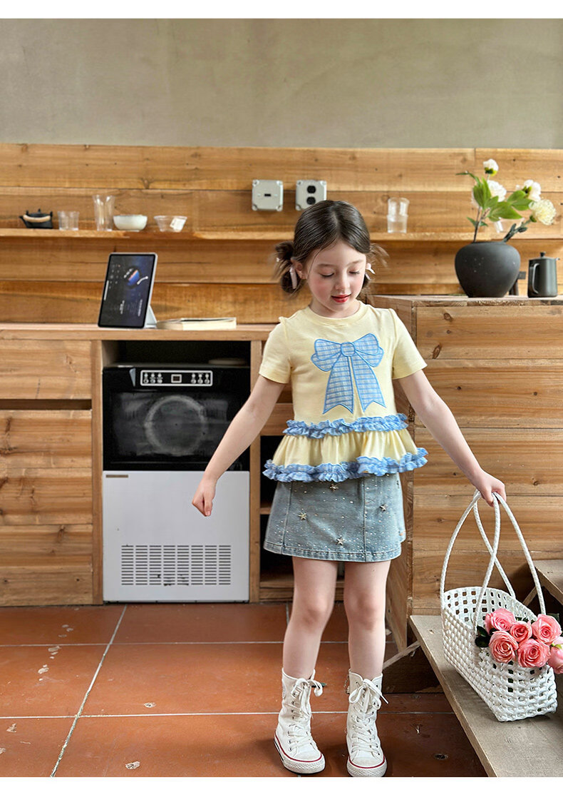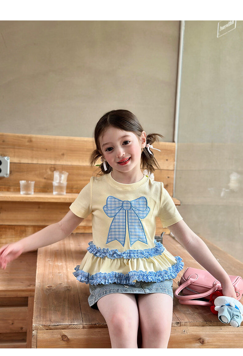 栀了成长记童装女童蝴蝶结撞色上衣2026春季儿童甜美可爱短袖T恤 黄色 上衣 160 cm