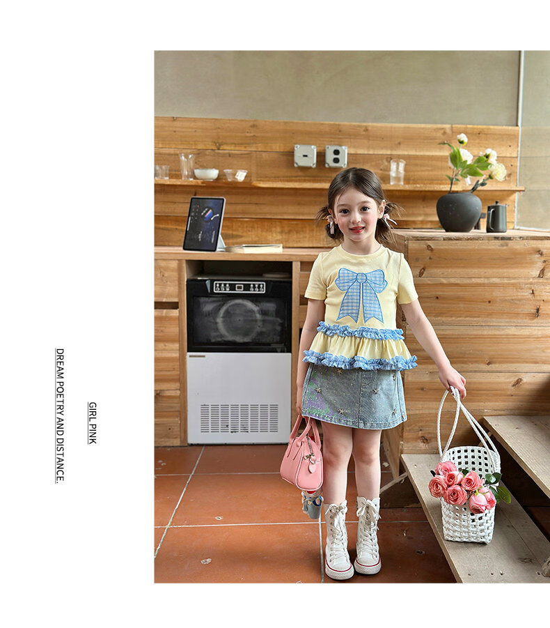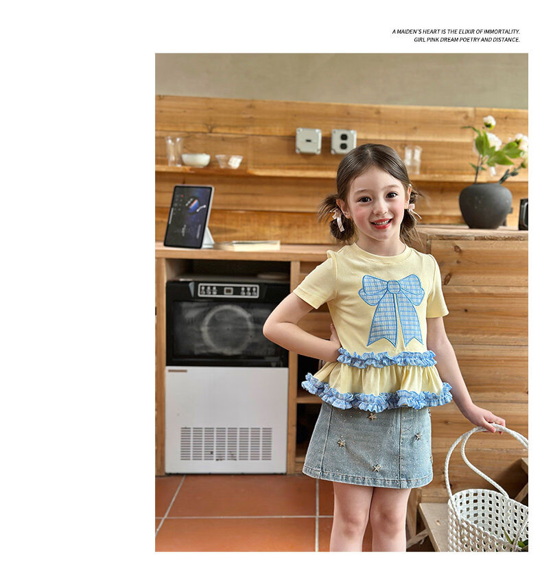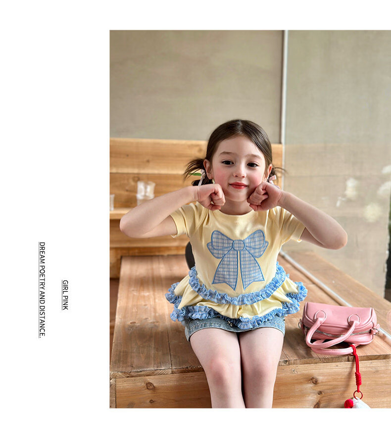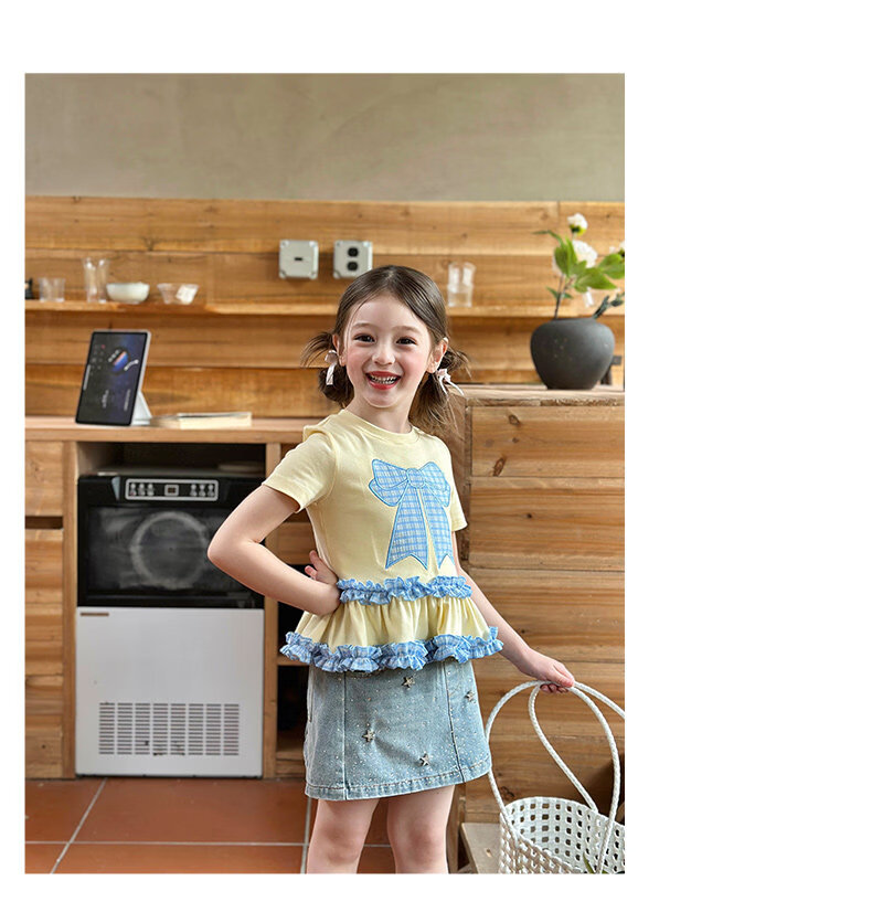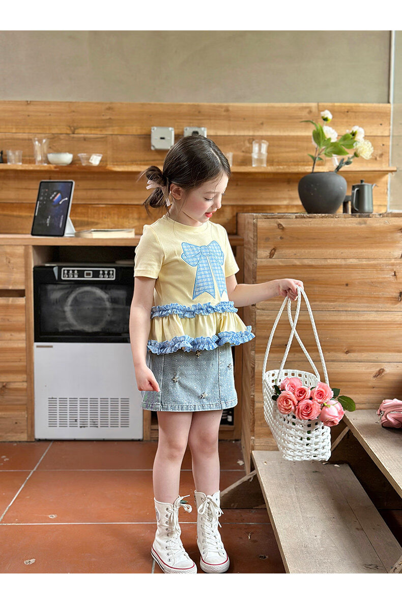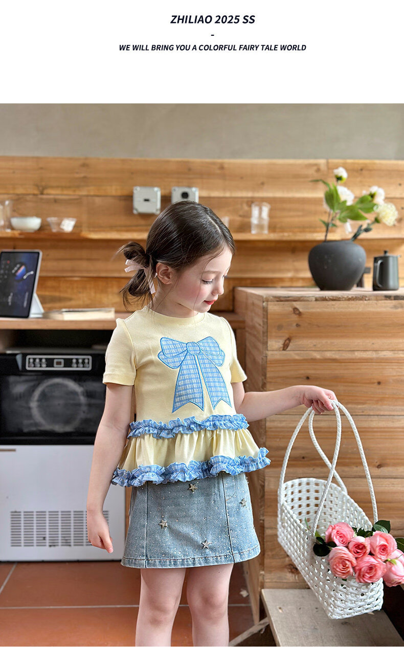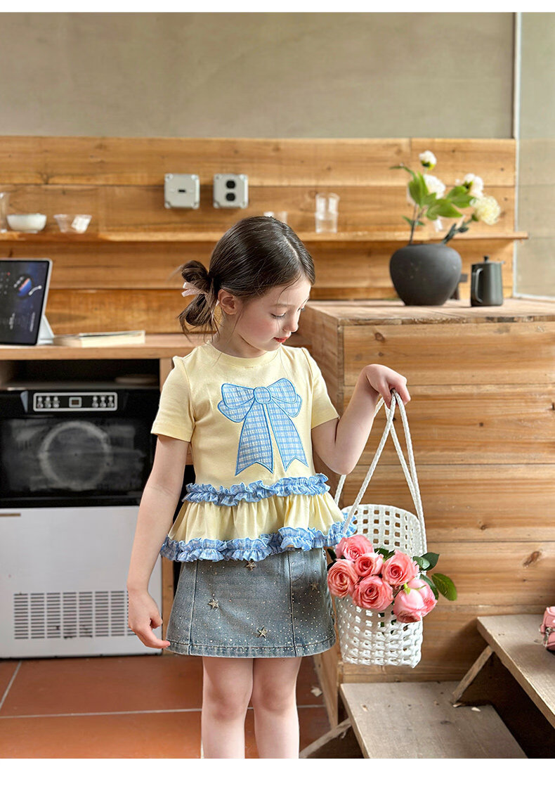 栀了成长记童装女童蝴蝶结撞色上衣2026春季儿童甜美可爱短袖T恤 黄色 上衣 160 cm