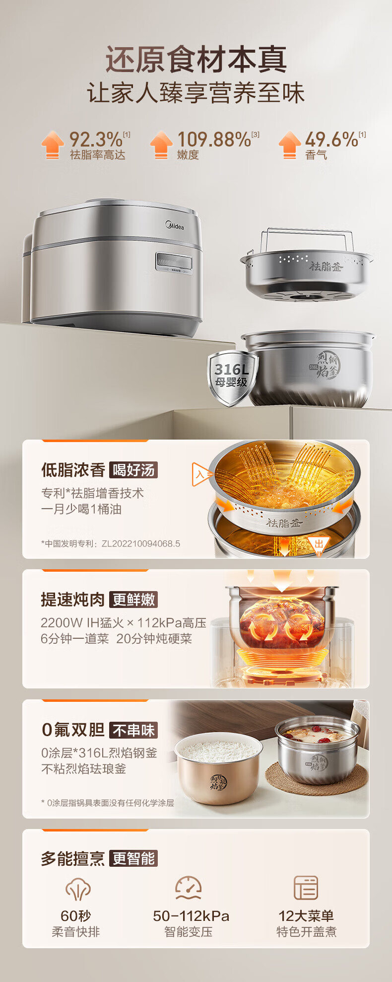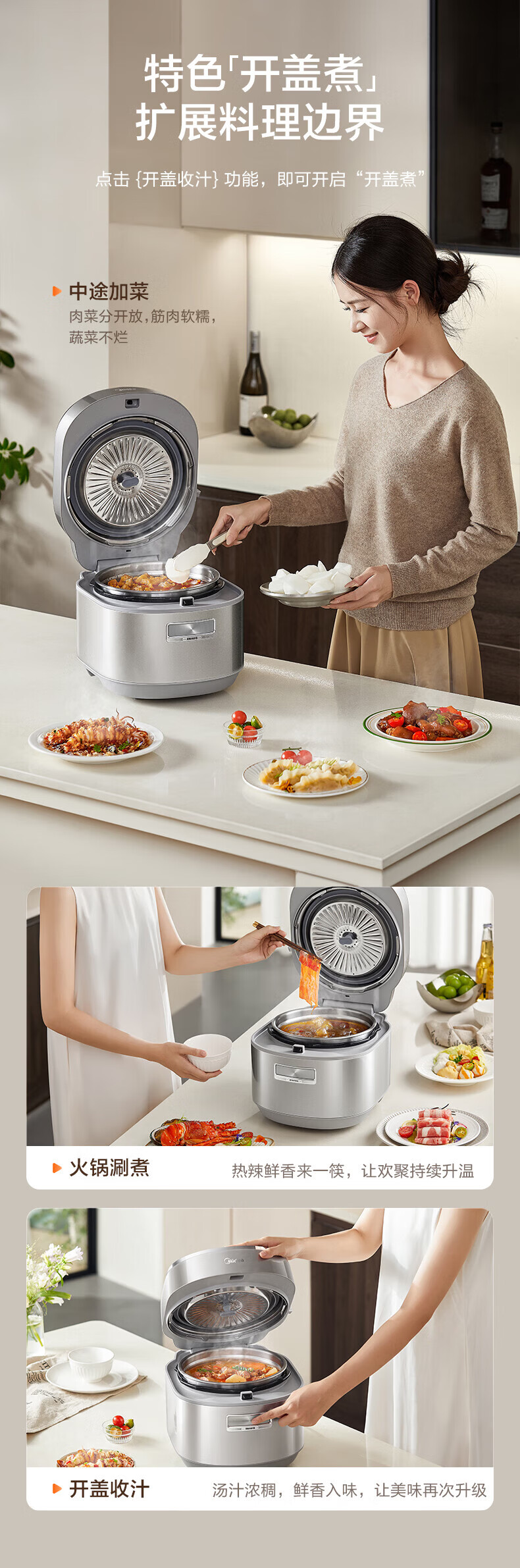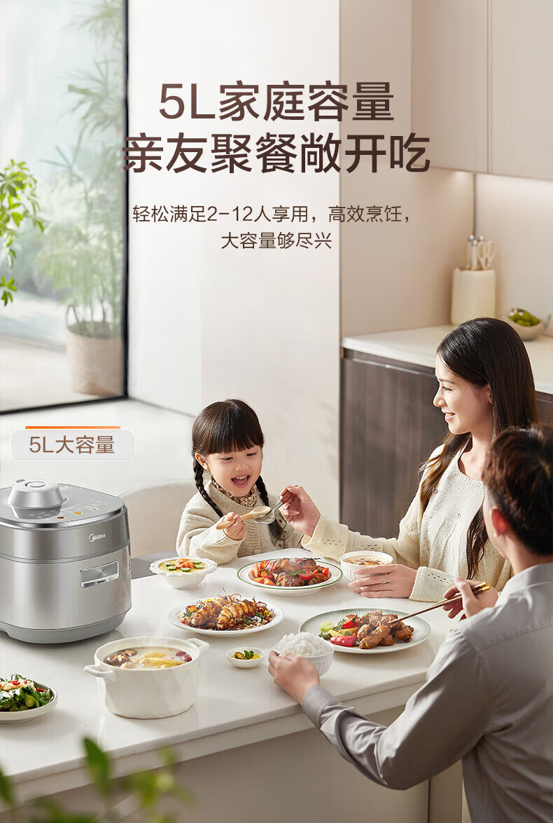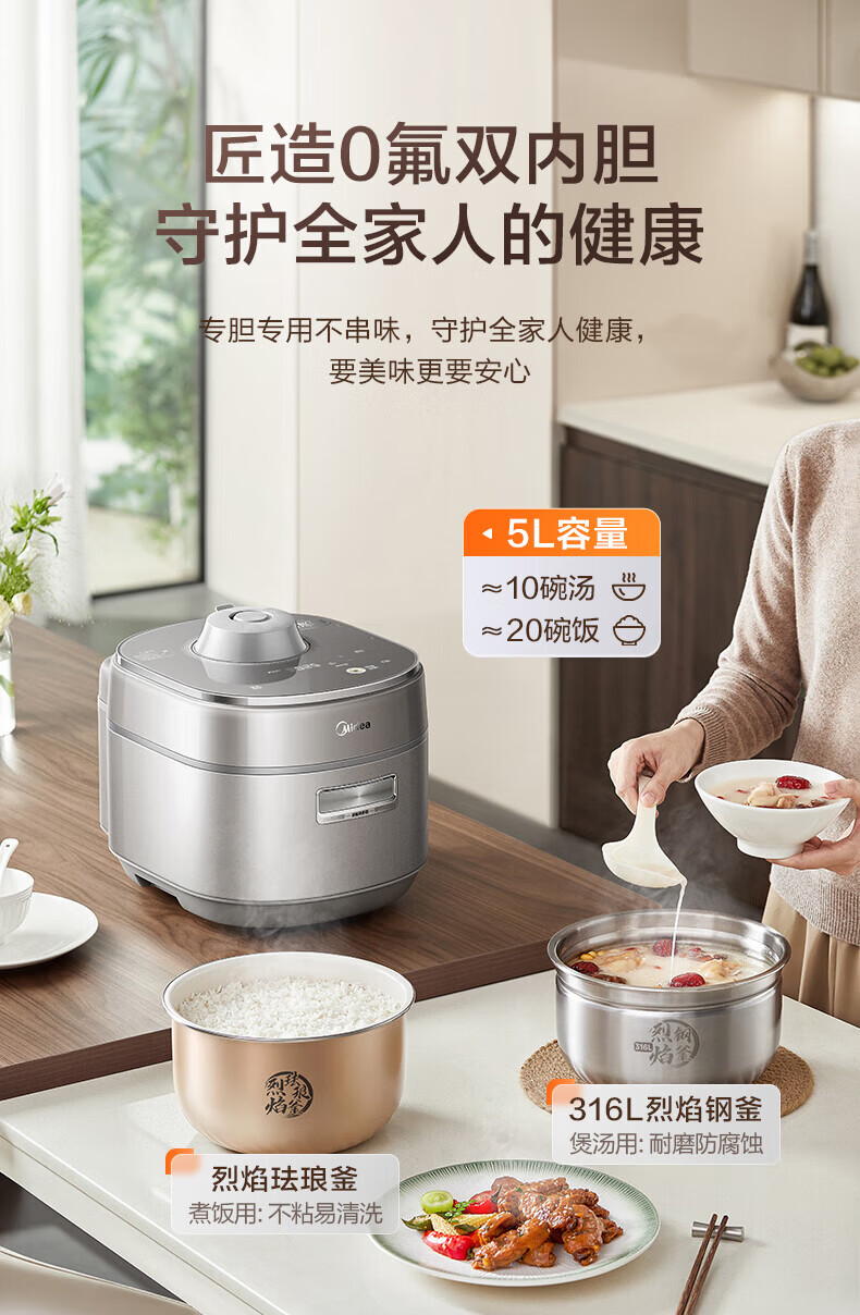 美的(Midea)电压力锅 低脂浓香超高压112KPa大容量5升电压力锅0氟有钛双胆自动排气IH猛火母婴316L煲汤电饭煲 【侧开盖+0涂层+低脂有钛】 5L 智能触控+中途开盖