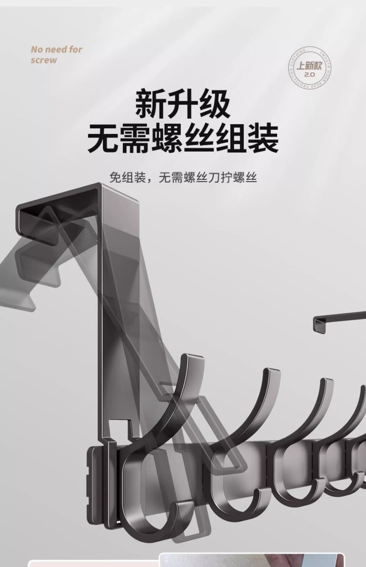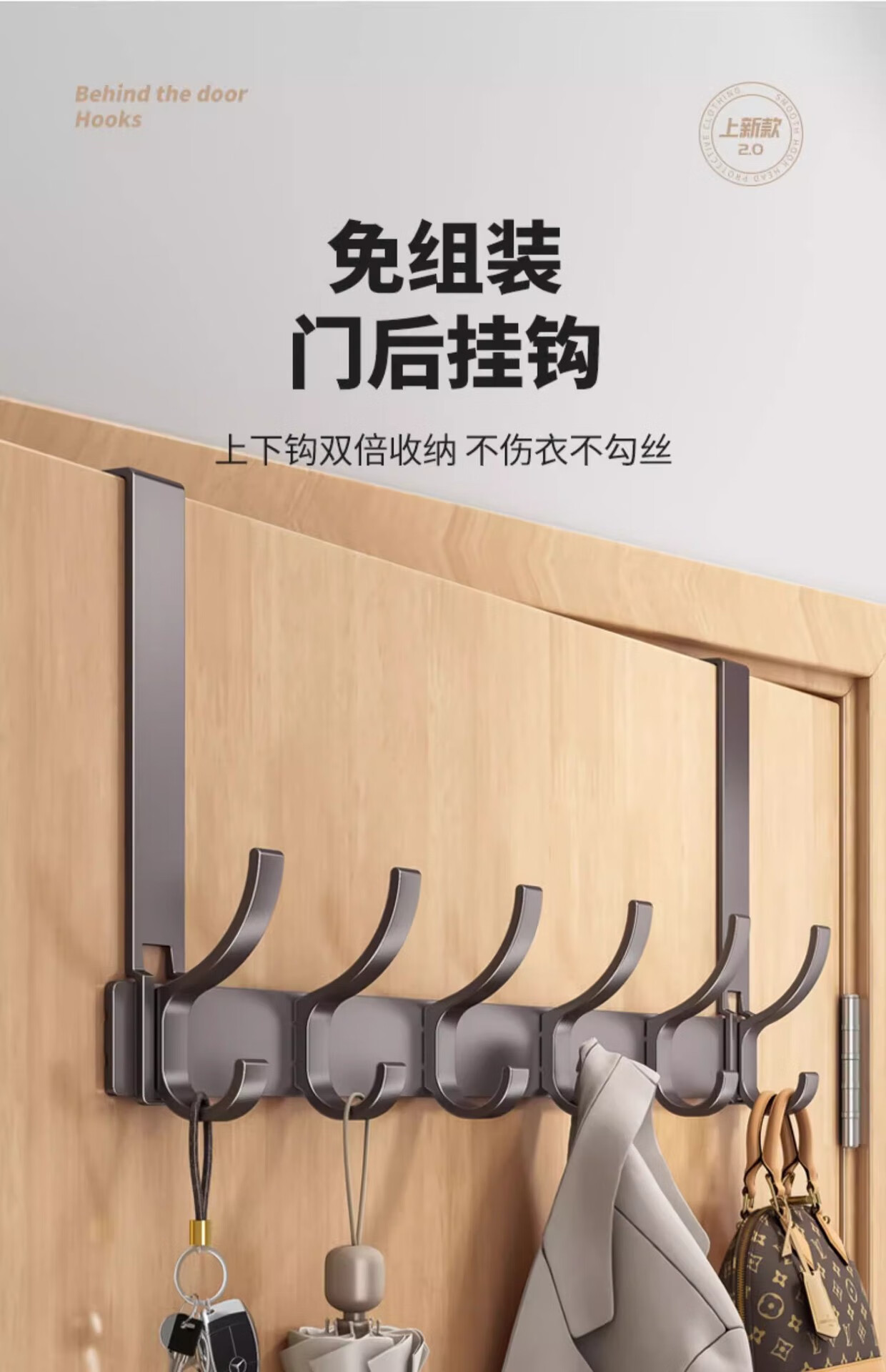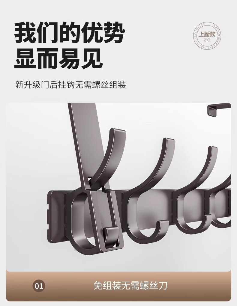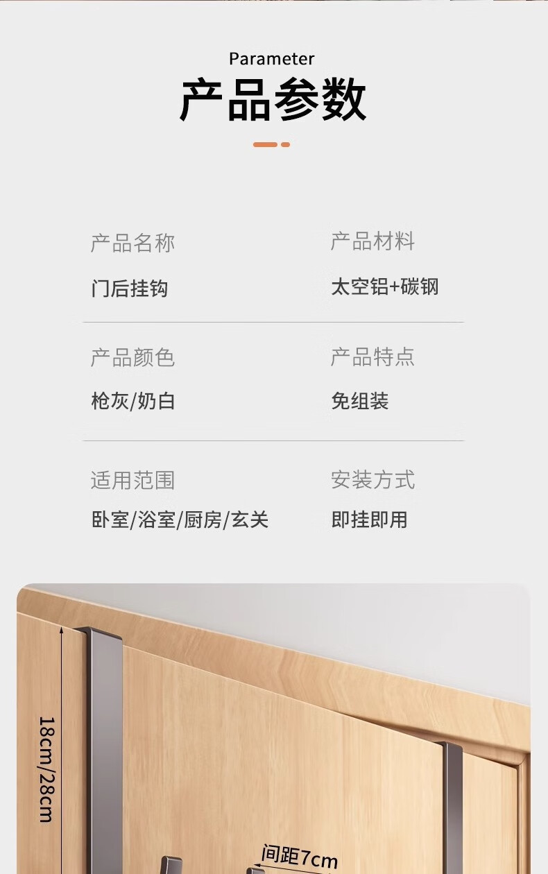 免打孔门后挂钩挂架衣帽钩置物架衣服收纳架门后背条式壁挂钩 【免组装】12CM静音门后钩奶白8钩