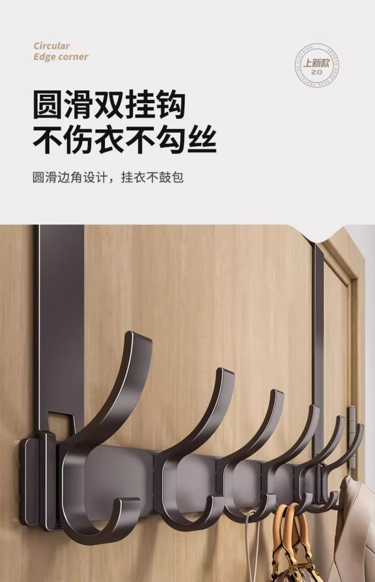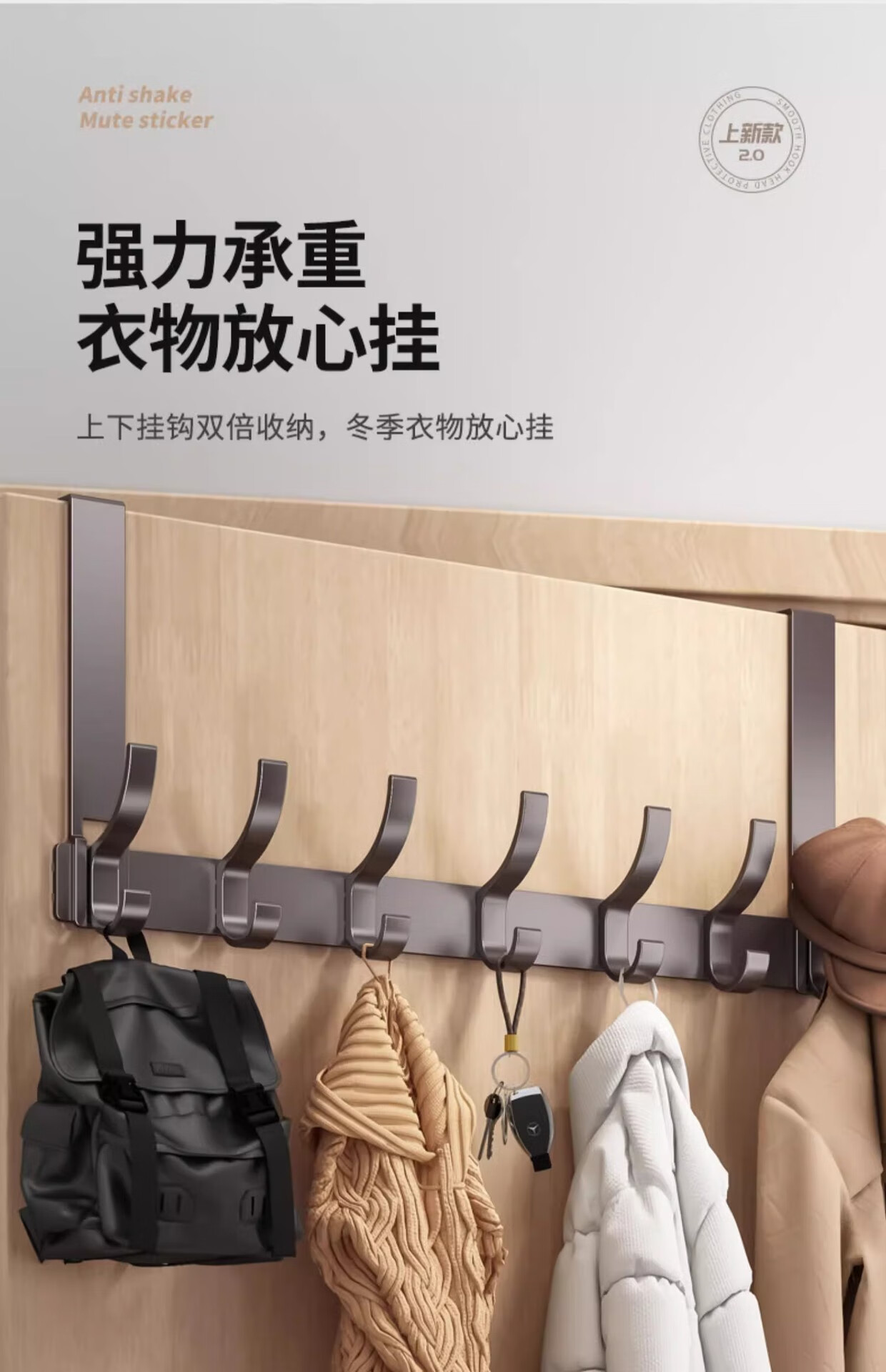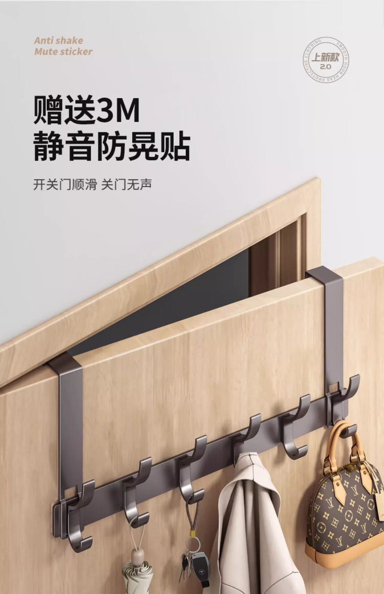 免打孔门后挂钩挂架衣帽钩置物架衣服收纳架门后背条式壁挂钩 【免组装】12CM静音门后钩奶白8钩