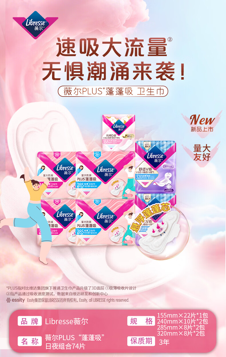 薇尔蓬蓬吸超薄贴合透气防漏日夜组合装74片卫生巾京东自营姨妈巾
