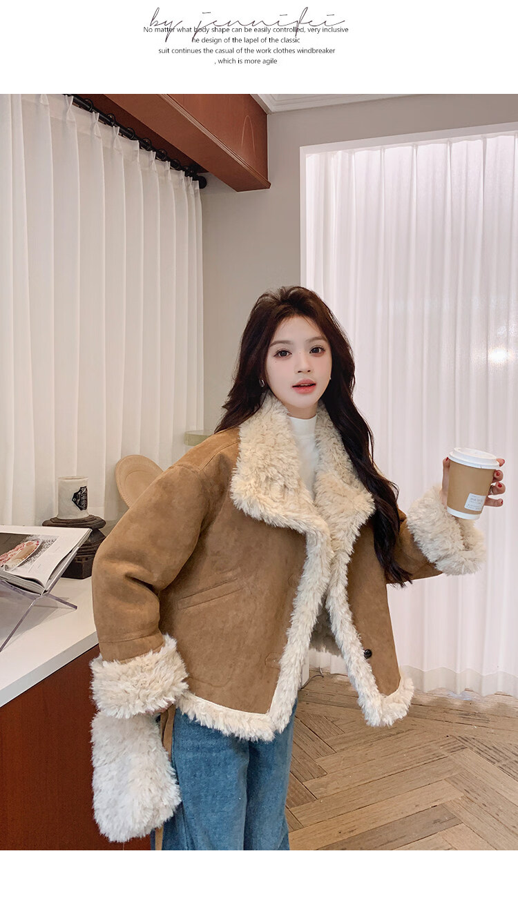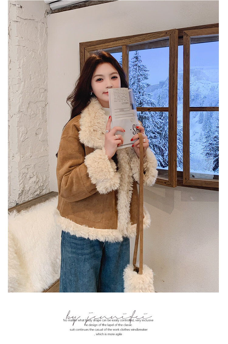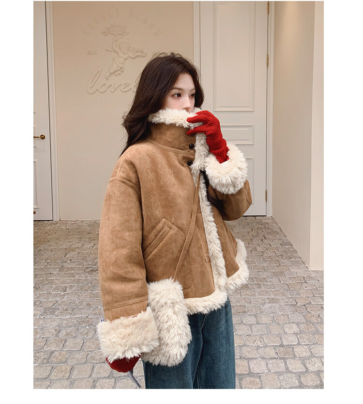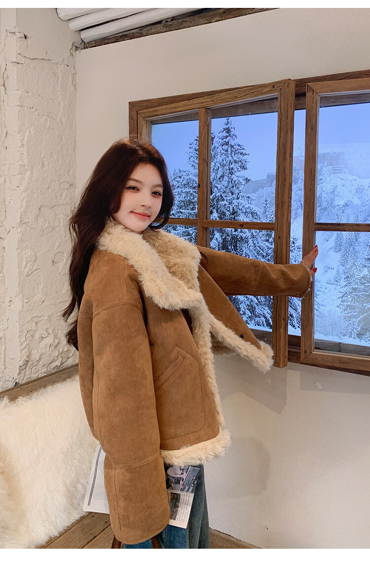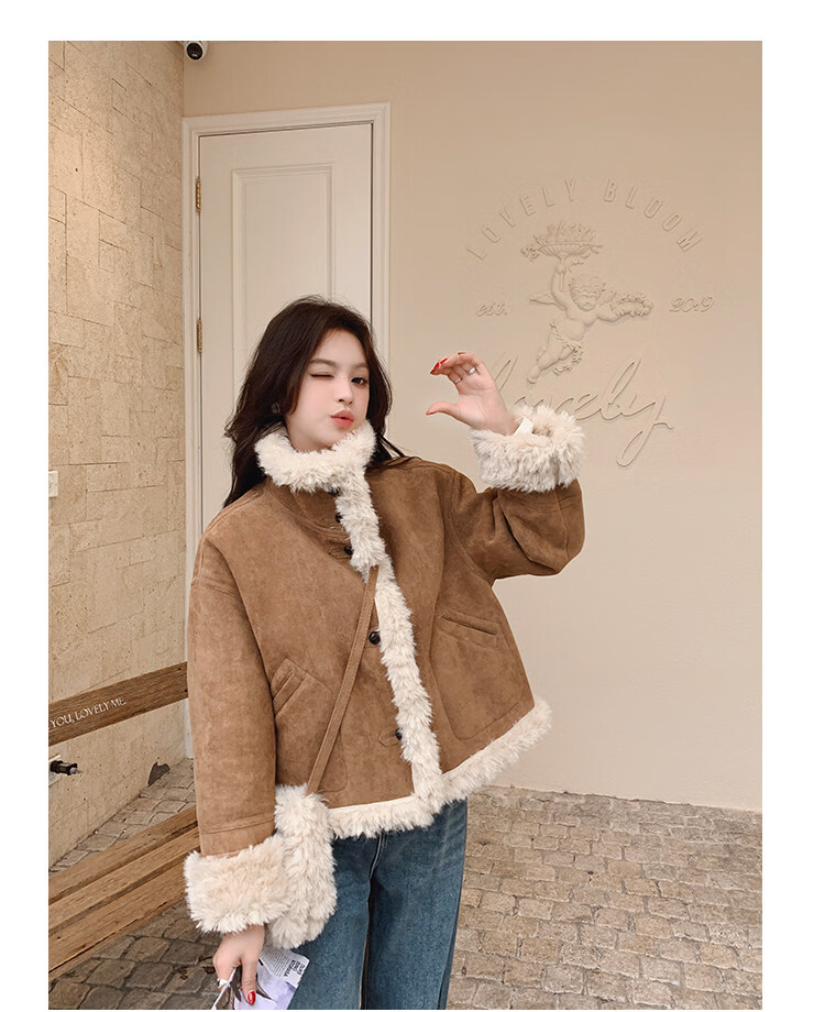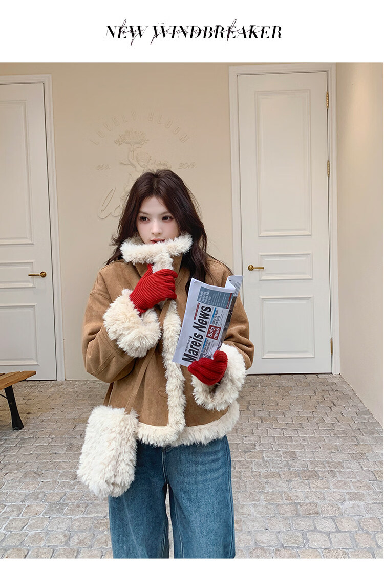 MODX羊羔毛皮毛一体外套女短款2026新款冬季加绒加厚小个子羊羔绒棉服 卡其色 S 95-110斤