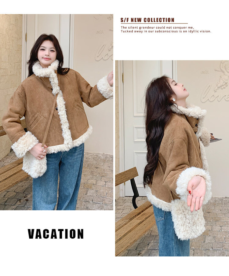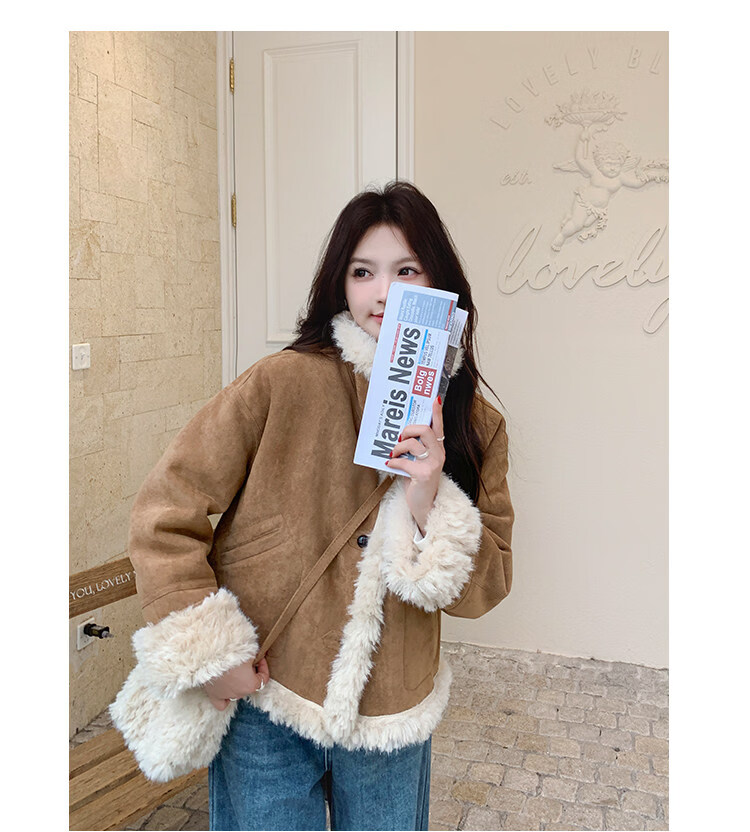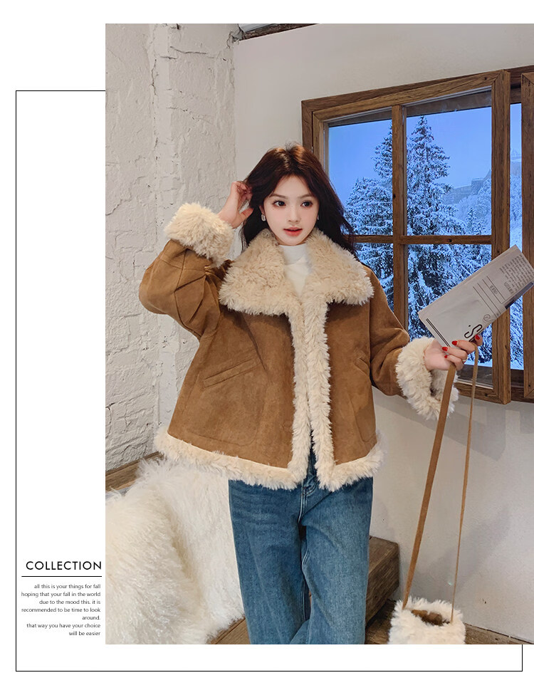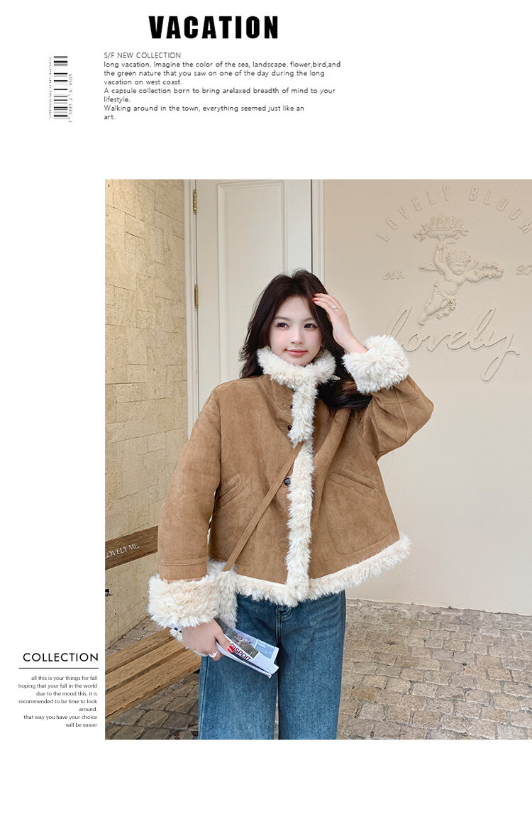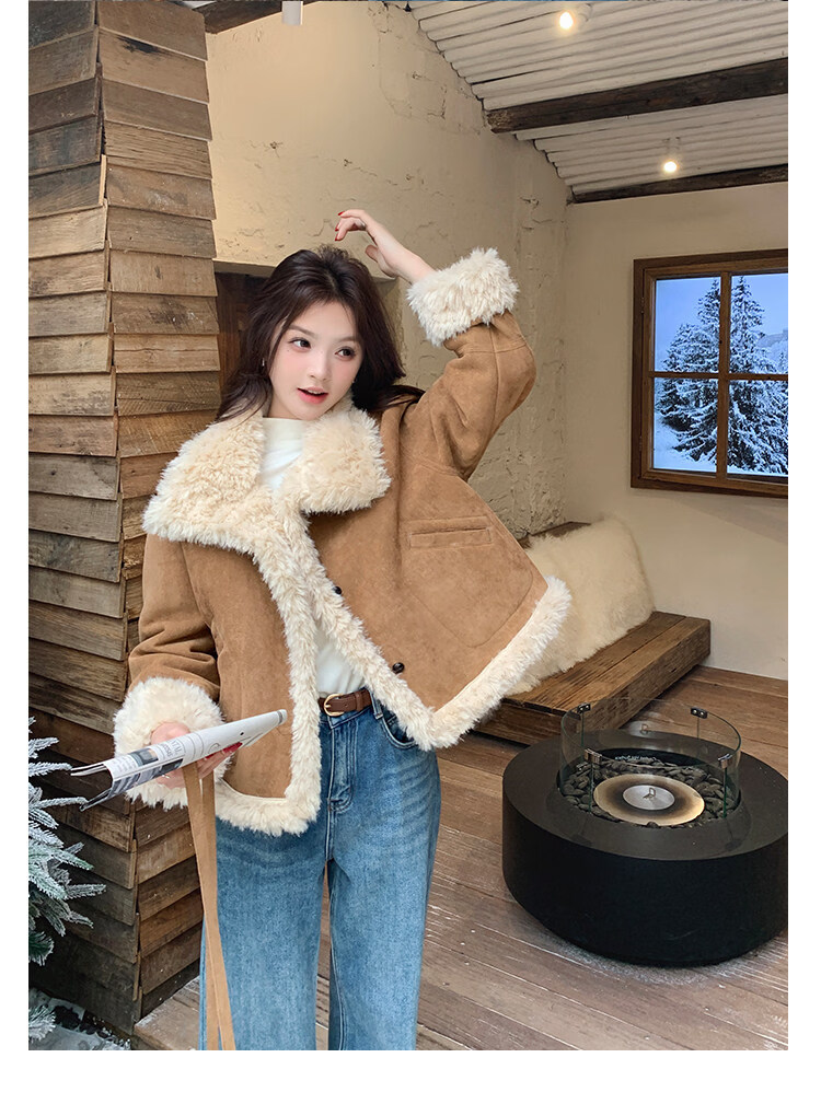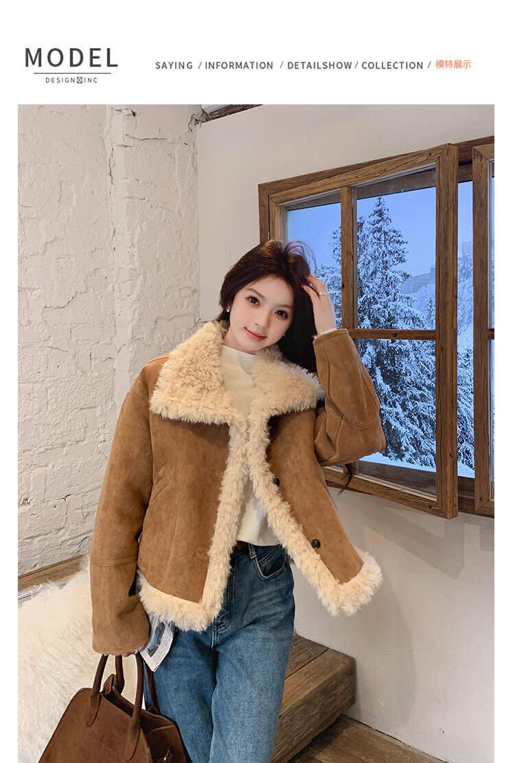 MODX羊羔毛皮毛一体外套女短款2026新款冬季加绒加厚小个子羊羔绒棉服 卡其色 S 95-110斤